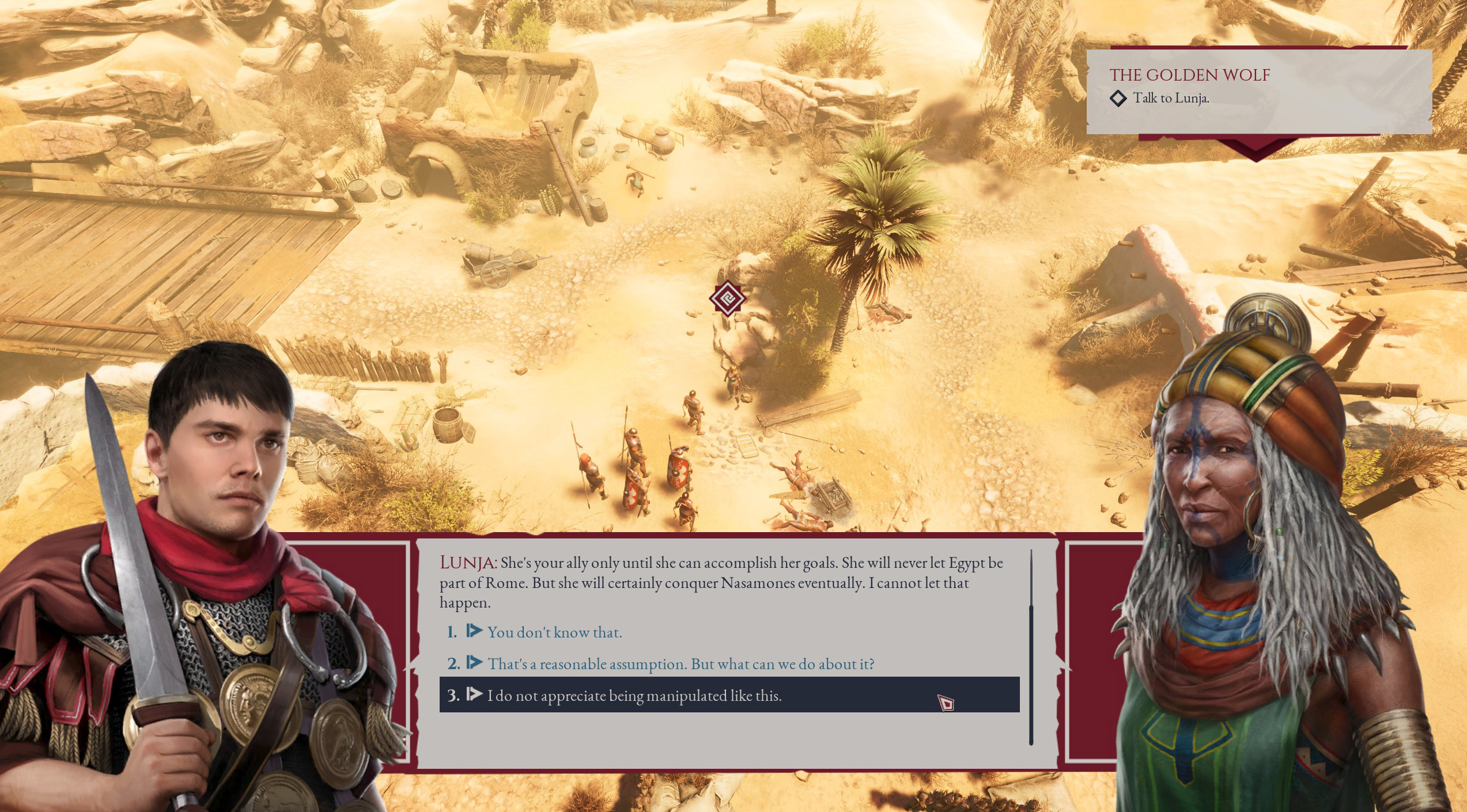 Ми вирушаємо до Стародавнього Риму, великої імперії, яка поступово захоплює світ. Ми – вигнанець, чий батько був убитий. Людина талановита, та настільки, що згодом зможе керувати цілим легіоном! Сюжет у грі нехитрий, але цікавий. Цікавий, перш за все, своїми лаконічними та чудовими діалогами, незважаючи на поверхневість образів персонажів. Гравець має можливість впливати на події у світі шляхом вибору відповідей у діалогах, завдяки чому ви можете побачити кілька кінцівок. Не поспішайте тріумфувати, адже варіативність невелика. Гра майстерно створює ілюзію важливості вибору, хоча більшість сюжетних рішень тут заскриптовані.