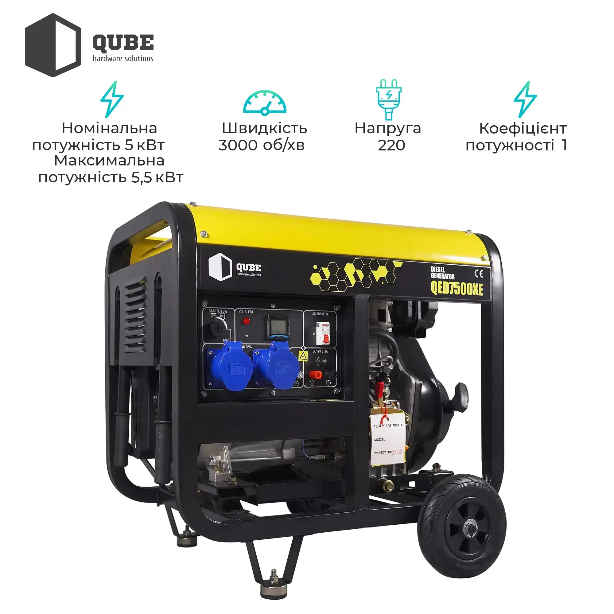 Генератор дизельний Qube QED7500XE 1-phase, 5.0 kW 5.5kW, 230V,12.5L, Ел. Cтарт