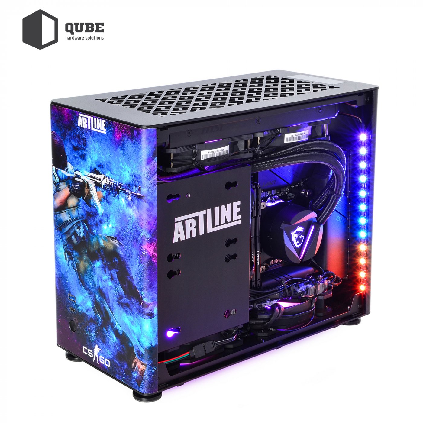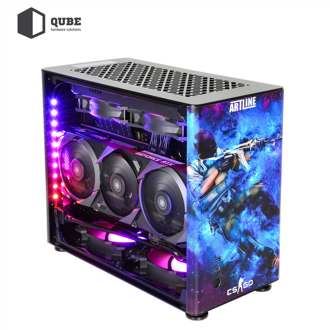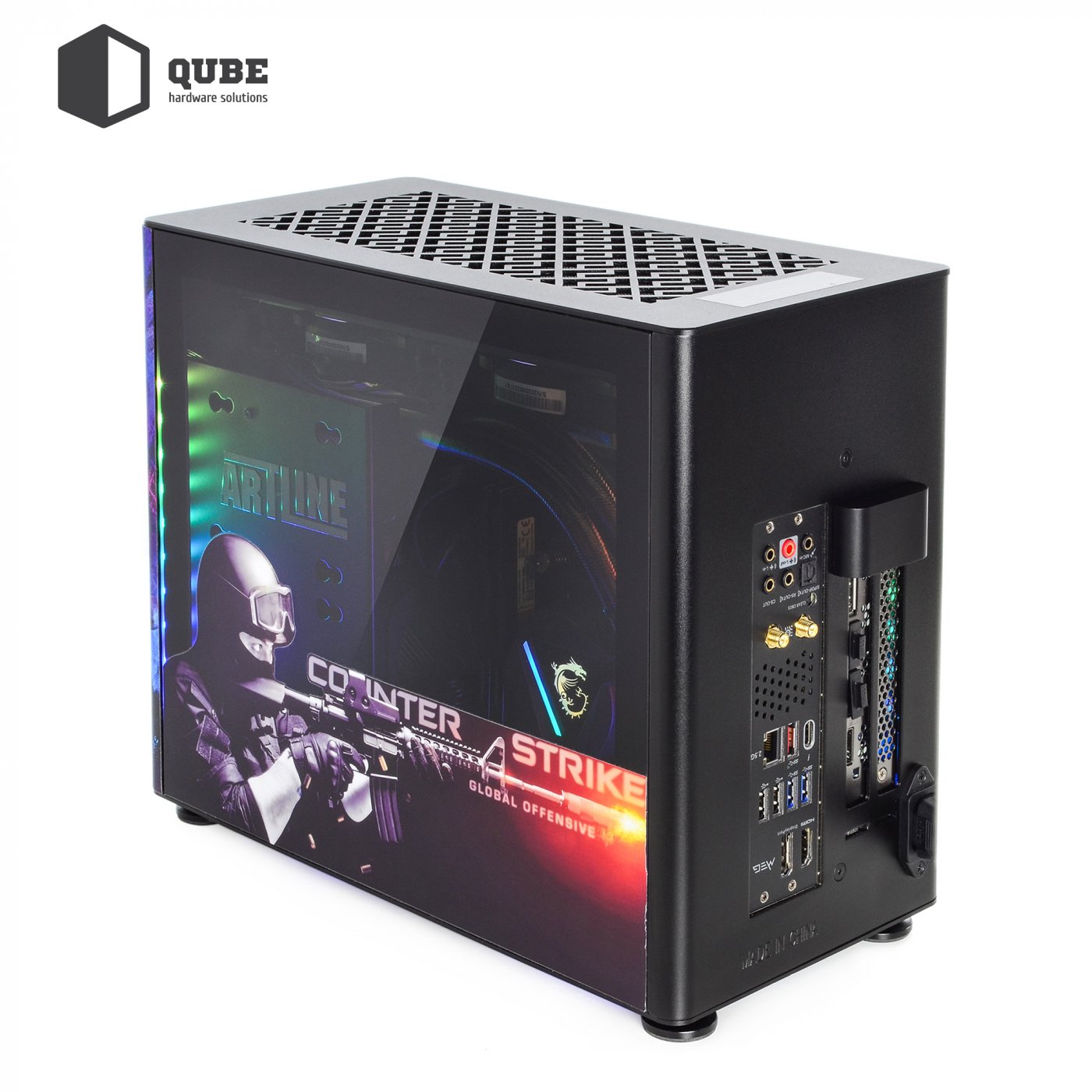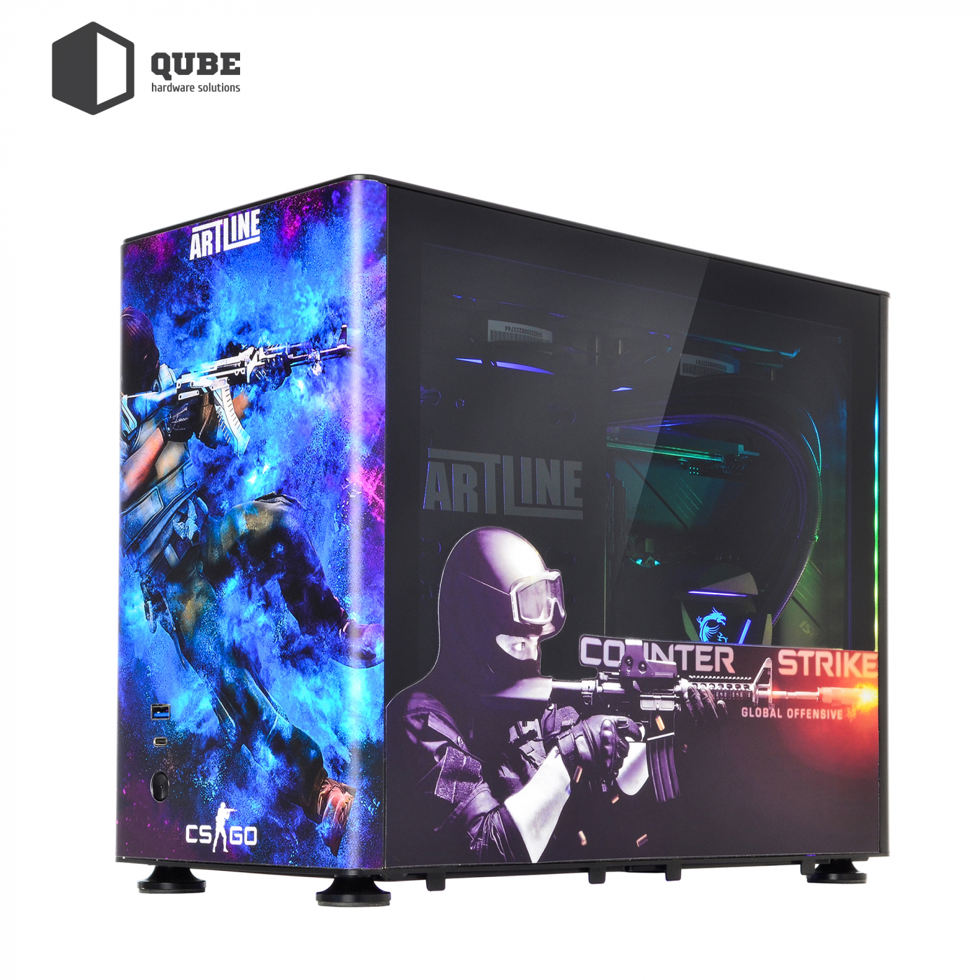 Корпус QUBE A4 Aluminum Printed CS:GO Space – компактний алюмінієвий корпус із бічними панелями із загартованого скла. Дизайн кейсу виконаний за мотивами популярної гри Counter-Strike. Крім яскравої передньої панелі зі зображеним на ньому терористом з гри, бічні панелі також отримали тематичні малюнки.