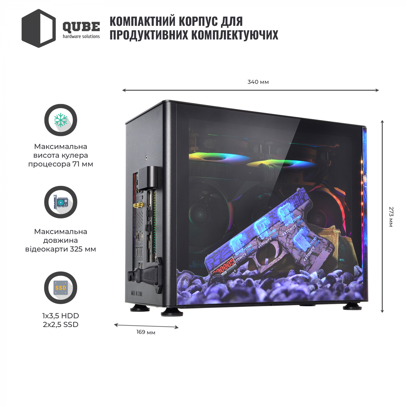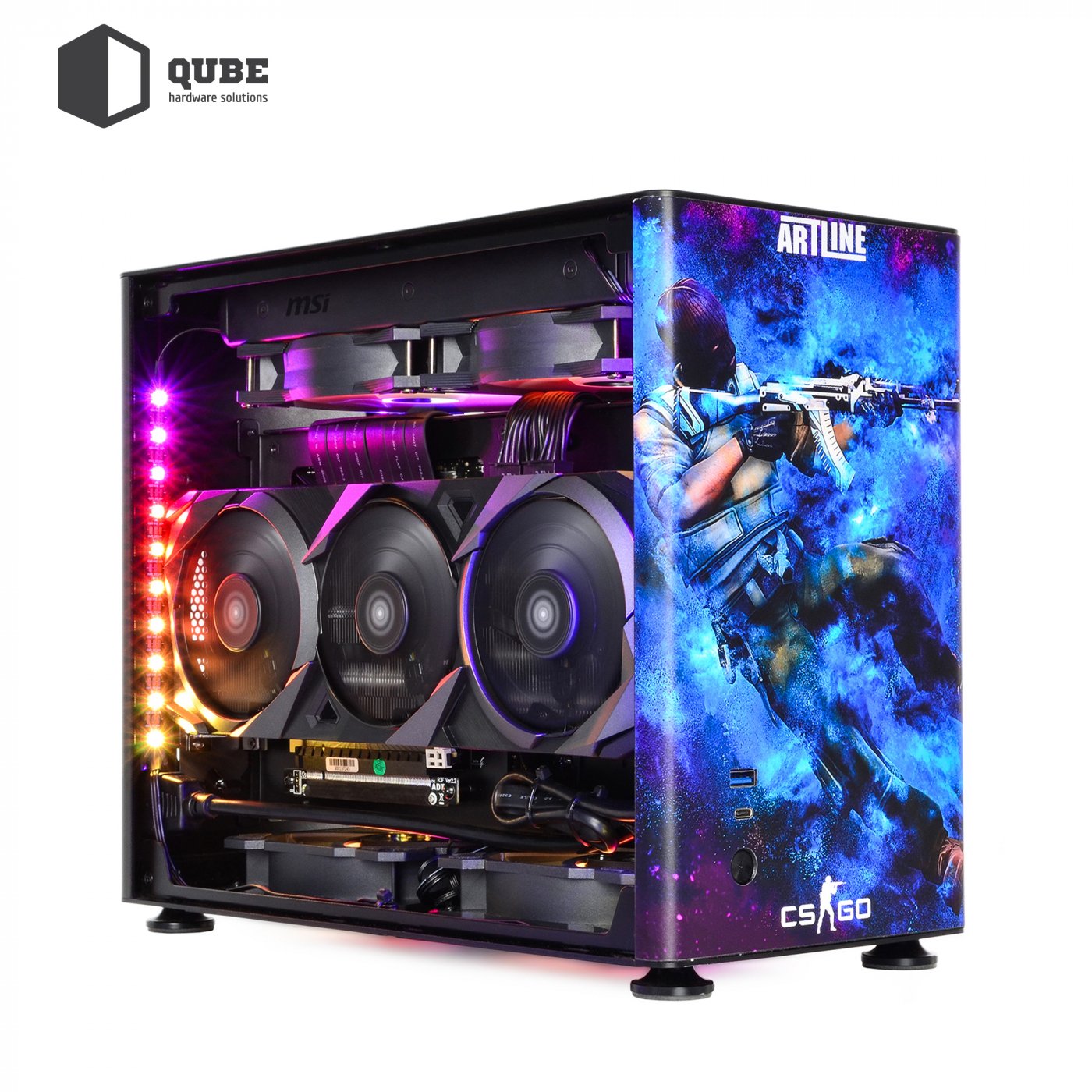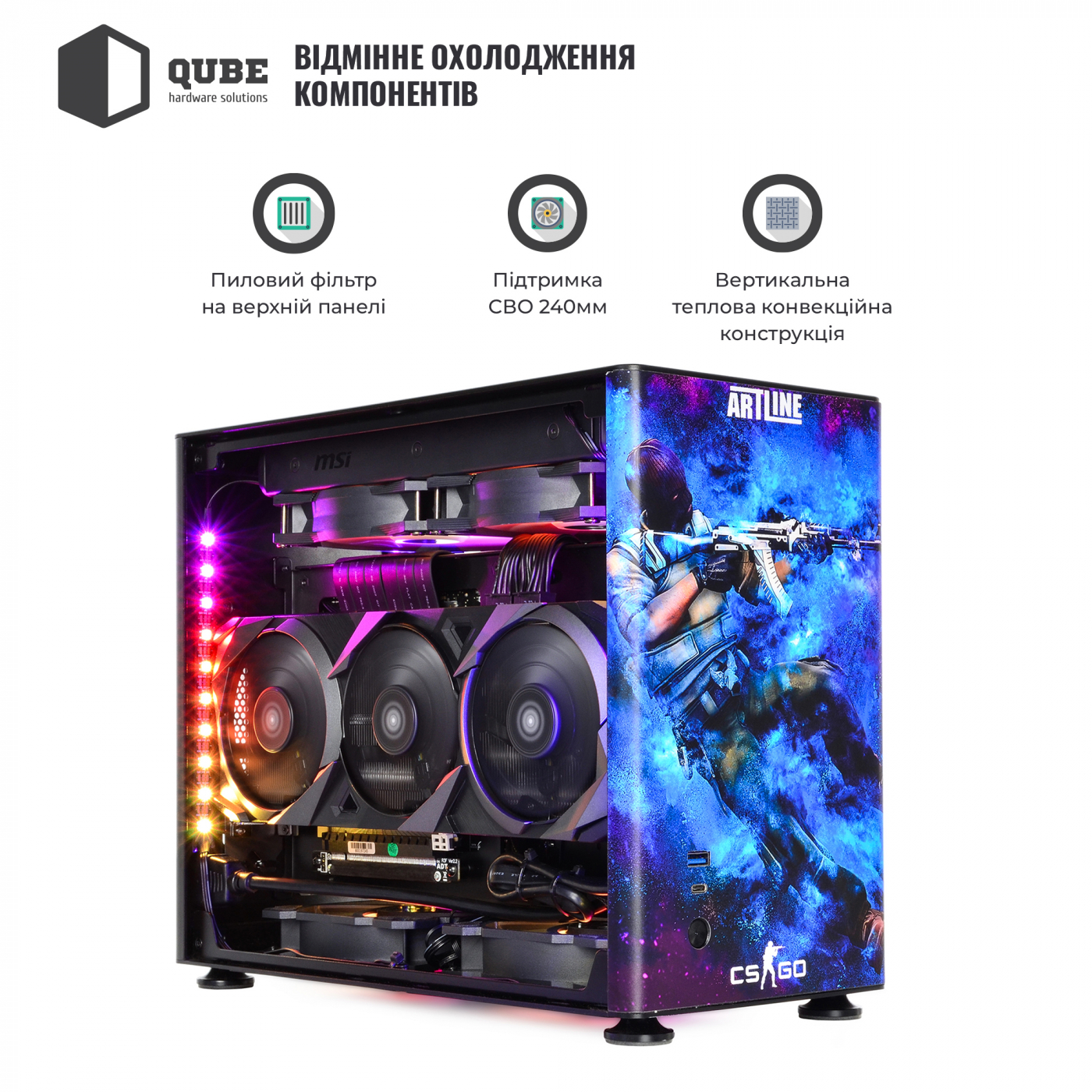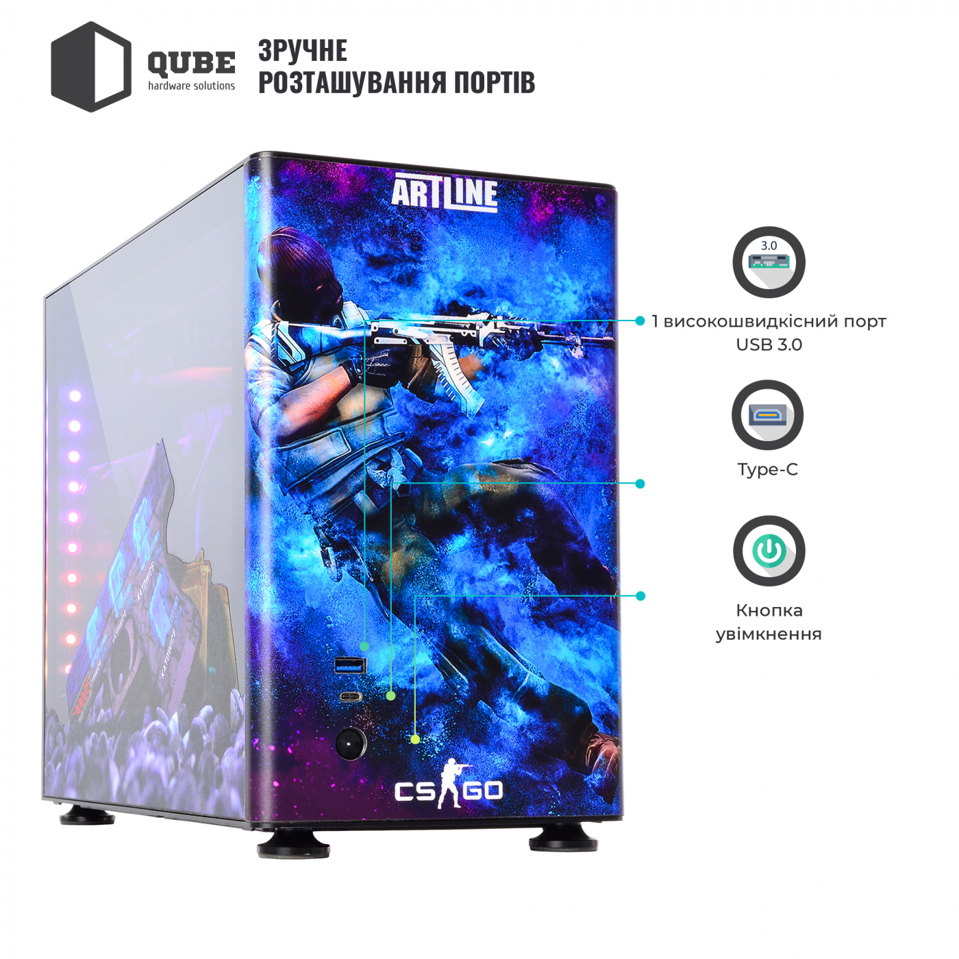 Корпус QUBE A4 Aluminum Printed CS:GO Space – компактний алюмінієвий корпус із бічними панелями із загартованого скла. Дизайн кейсу виконаний за мотивами популярної гри Counter-Strike. Крім яскравої передньої панелі зі зображеним на ньому терористом з гри, бічні панелі також отримали тематичні малюнки.