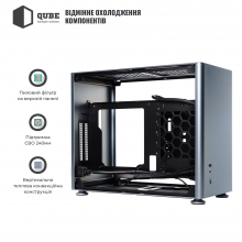 З коробки корпус QUBE A4 поставляється без попередньо встановлених вентиляторів. Користувач за бажанням зможе інсталювати 4 кулера: зверху 2x120 мм; знизу 2x120 мм. Є підтримка систем водяного охолодження (СВО) довжиною до 240 мм.