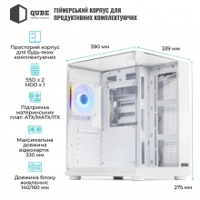 Корпус QUBE AQUARIUM ARGB White (AQUARIUM_GWNU3) створено для тих, хто хоче поєднати естетичний вигляд і практичність в одній системі. Його білий корпус з фронтальною і бічними панелями зі загартованого скла дозволяє демонструвати внутрішні компоненти і ARGB-підсвітку, перетворюючи комп'ютер у стильний елемент інтер'єру. Міцна сталева конструкція товщиною 0,45–0,55 мм забезпечує надійність і довговічність, а продуманий форм-фактор MiddleTower робить корпус універсальним для різних конфігурацій. Підтримка материнських плат ATX, M-ATX та ITX надає широкі можливості для збору як ігрових, так і робочих систем.