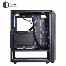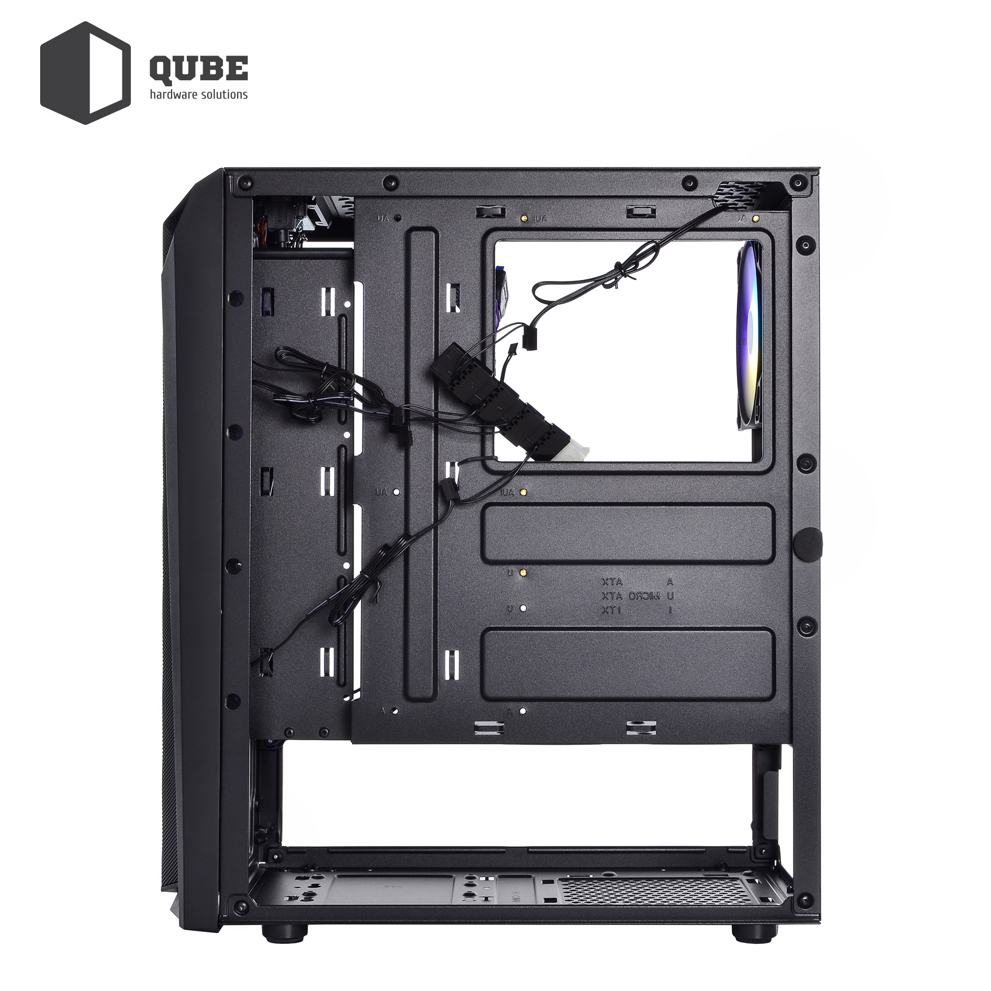 Модель QUBE BOREY – це корпус чорного кольору формату MidiTower, який задовольнить вимоги більшості користувачів. Краї металевого каркаса акуратно зашліфовані або підігнуті, тим самим виключається будь-яка можливість поранитися при збірці. Внутрішнє оздоблення відрізняється продуманістю і мінімалістичністю, а бічна панель виконана із загартованого скла, що відрізняється високою міцністю і кришталевою прозорістю.