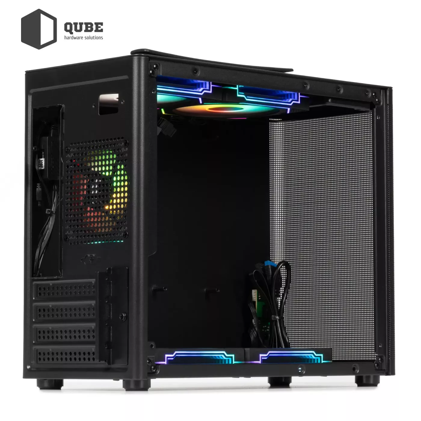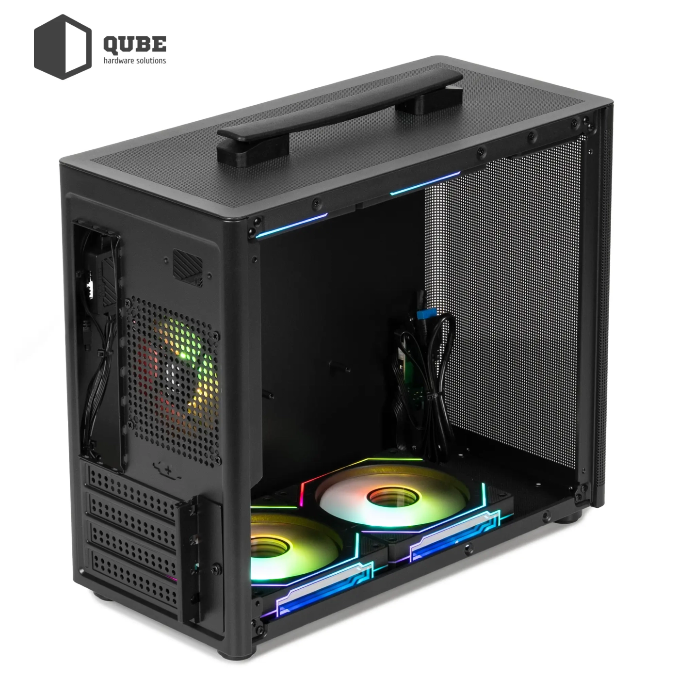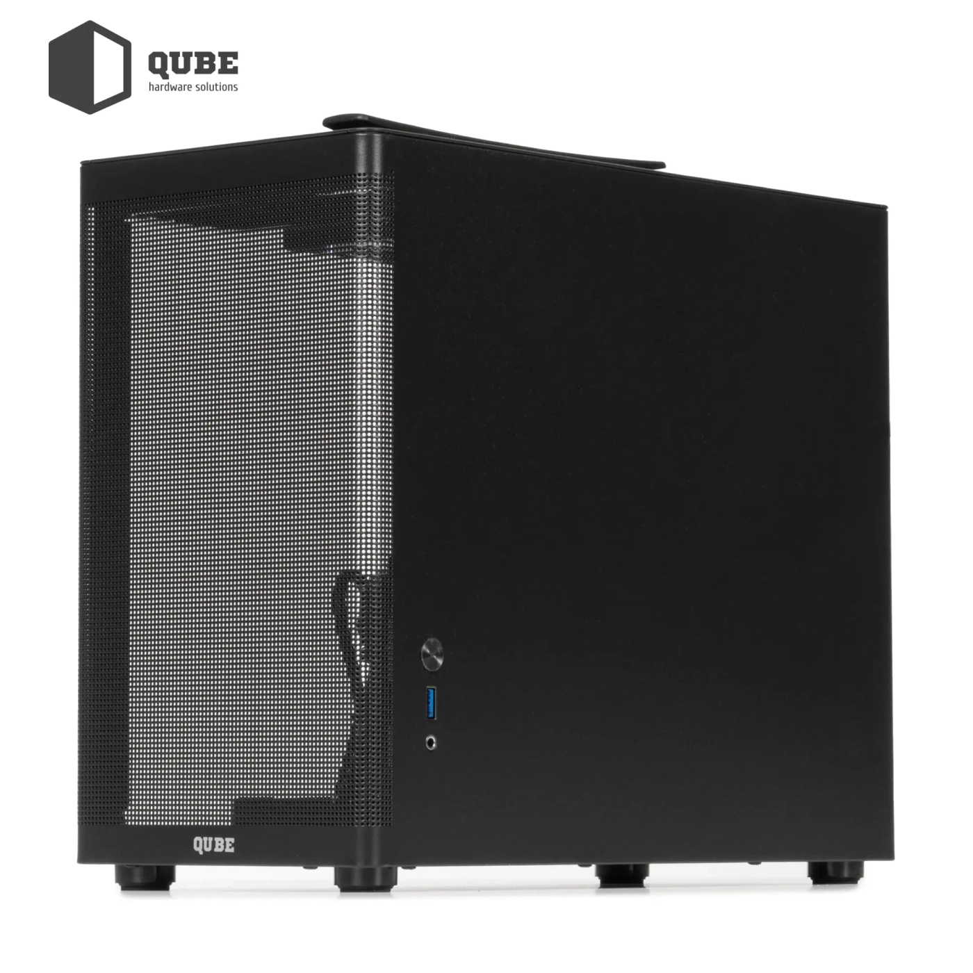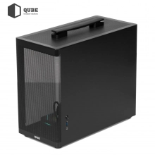 QUBE BRING ARGB Black (BRING_GBNU3) – це сучасний корпус формату mATX/ITX, створений для користувачів, які цінують поєднання компактності та функціональності. Виготовлений із міцної сталі SPCC товщиною 0,8 мм, він забезпечує високу надійність і довговічність конструкції. Чорна сітчаста фронтальна панель не лише додає стильного вигляду, а й сприяє відмінній циркуляції повітря, а зручна верхня ручка дозволяє легко переносити систему. Ліва бокова стінка із загартованого скла підкреслює красу внутрішньої збірки та робить корпус візуально легшим.
