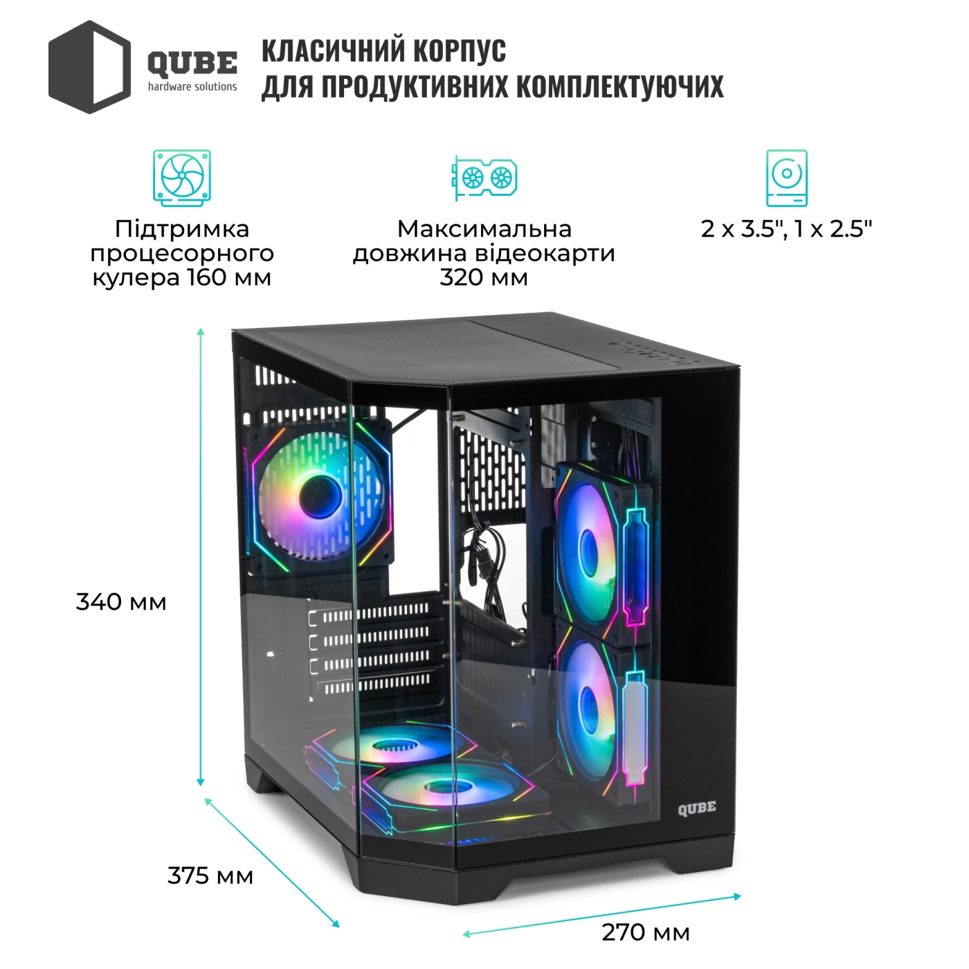 Корпус QUBE CRYSTAL ARGB Black - це не просто дім для вашого обладнання, це стильне та функціональне рішення для створення ефектної та високопродуктивної системи. Виконаний в елегантному чорному кольорі та прикрашений ARGB-підсвіткою, корпус дозволяє налаштувати колір і світлові ефекти на ваш смак, створюючи унікальну атмосферу і підкреслюючи потужність вашого ПК. Цей корпус стане окрасою робочого столу і чудово впишеться в будь-яку обстановку завдяки сучасному дизайну і продуманим функціональним можливостям. ??