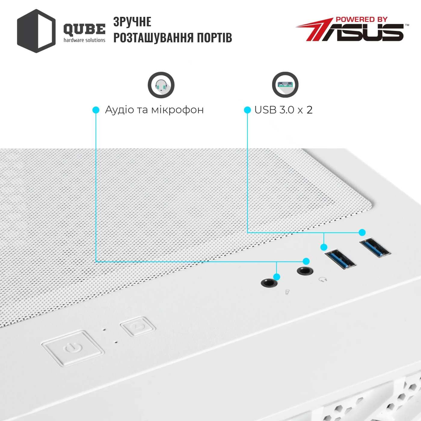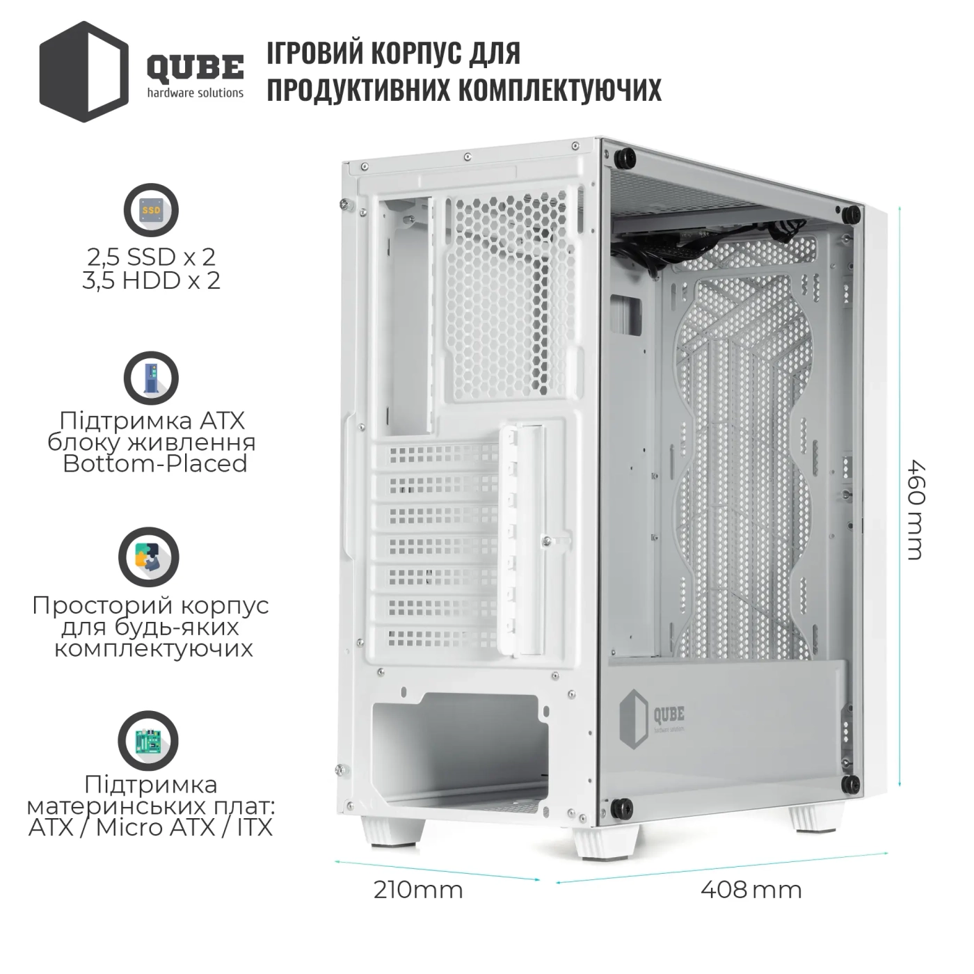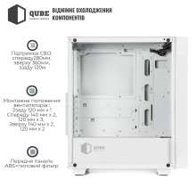 Корпус QUBE GERYON White (QBGERYON_FWNU3) / MiddleTower / ATX | microATX | mini-ITX / 2 x USB 3.0 + Audio + Mic / 2x3.5", 2x2.5" / 460x210x408 / Білий / 12міс. / QBGERYON_FWNU3