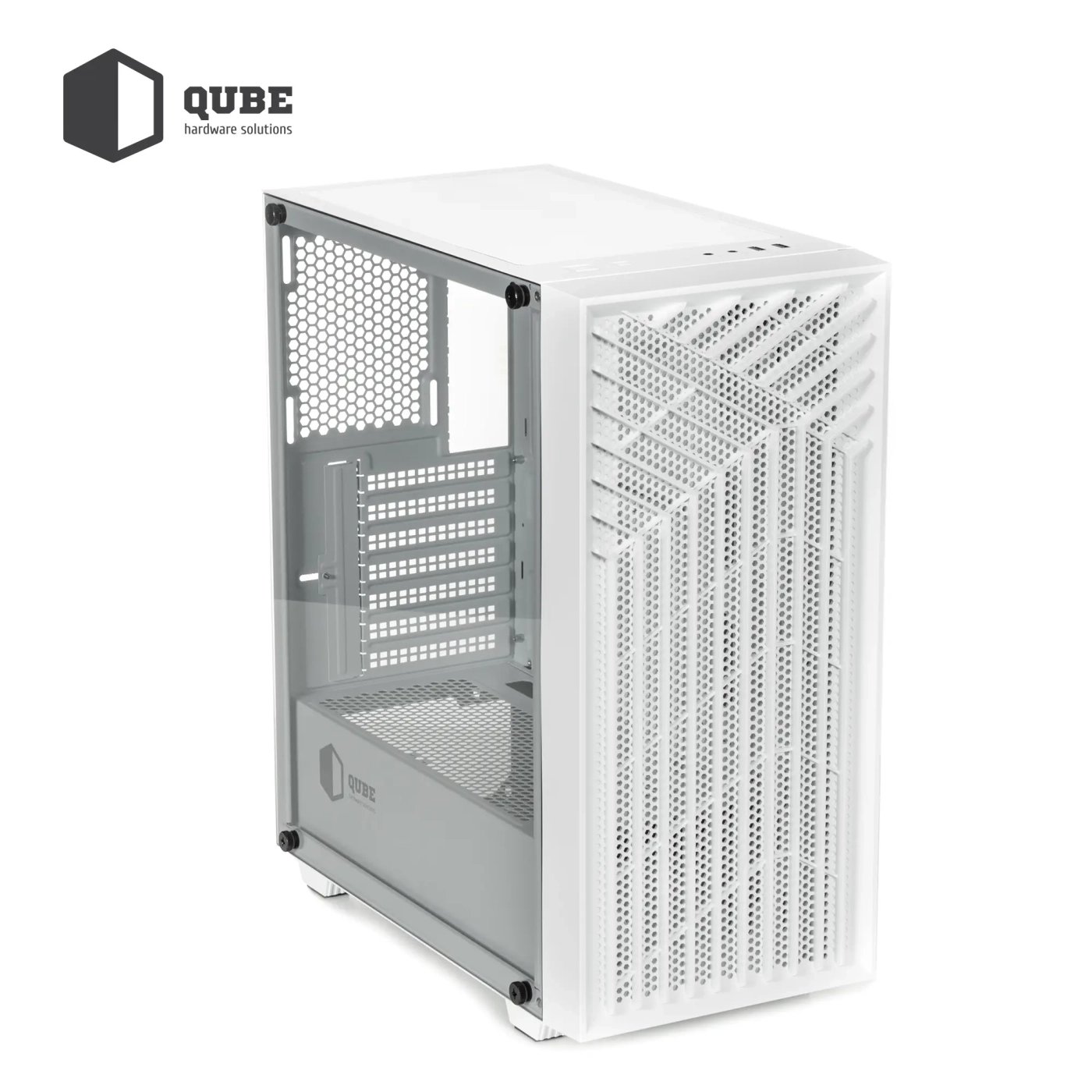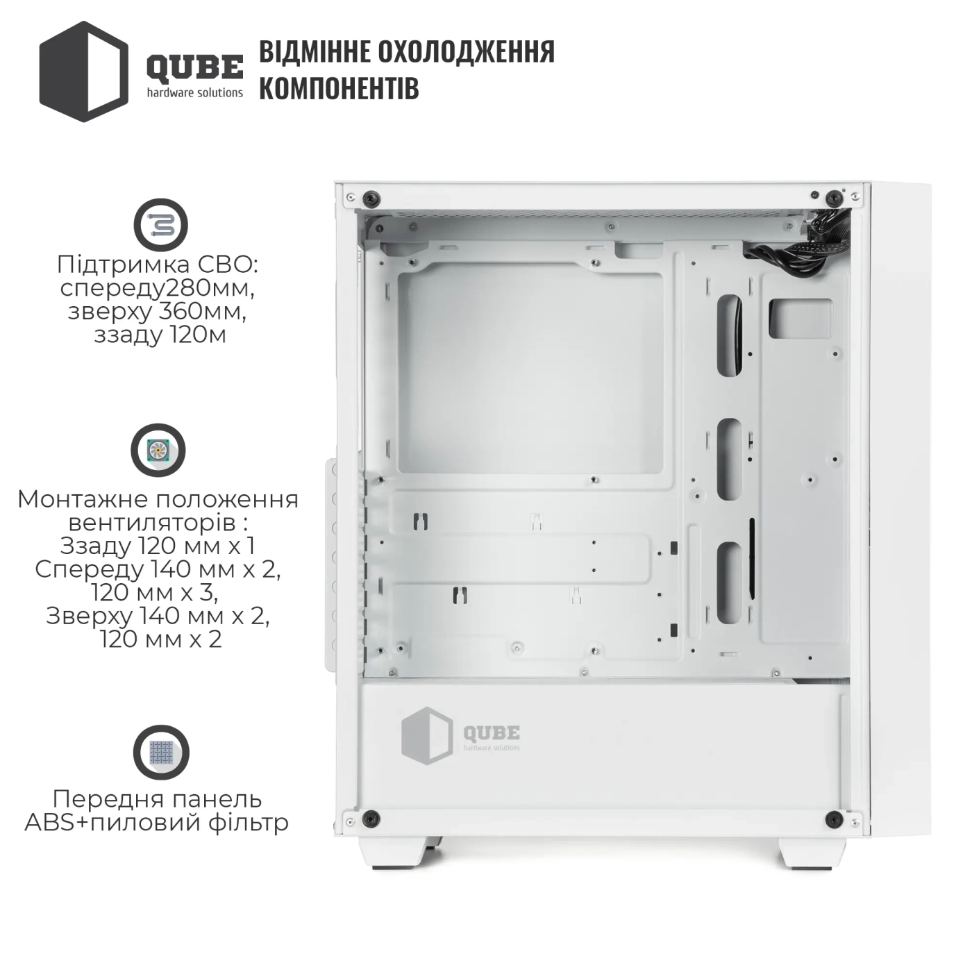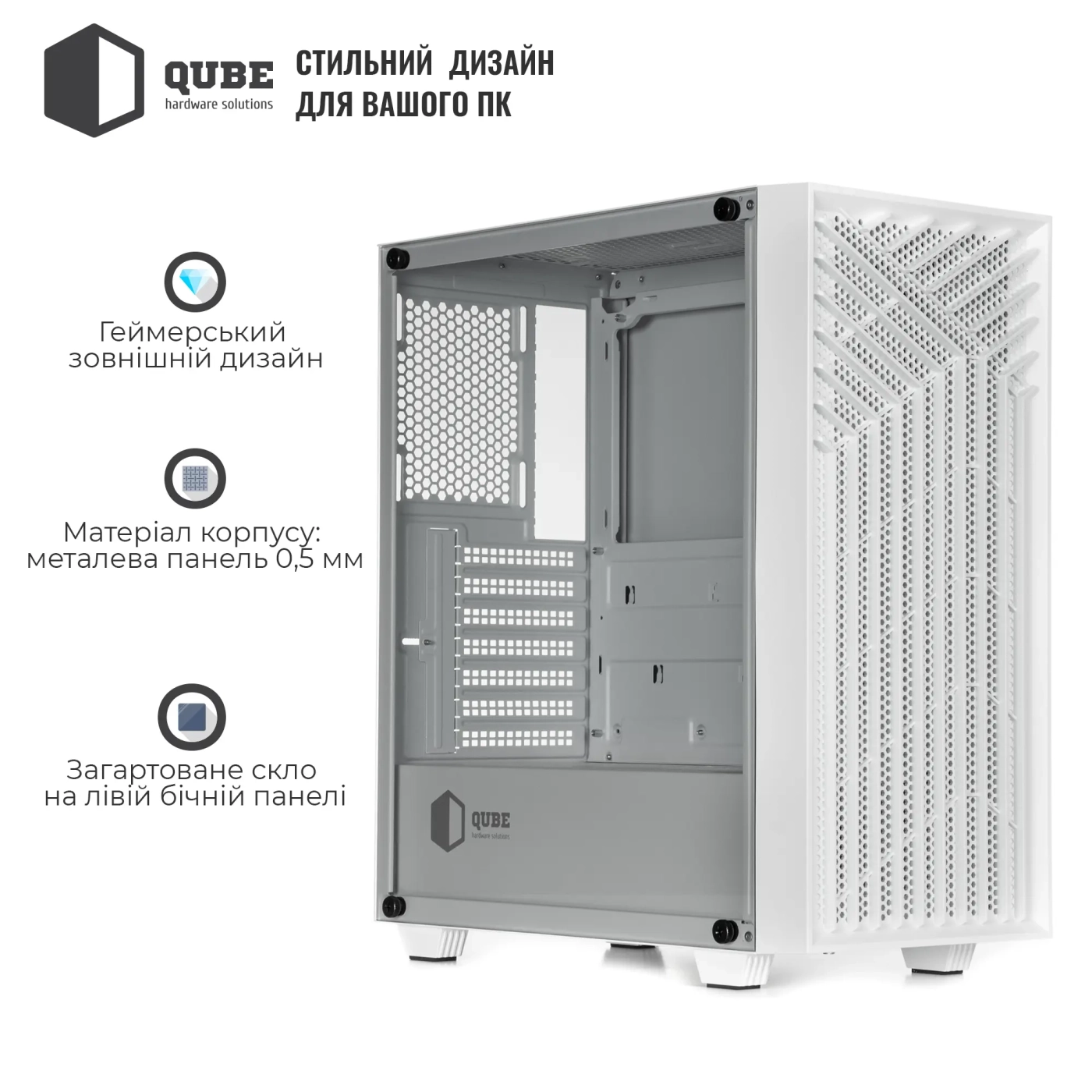Корпус QUBE GERYON White (QBGERYON_FWNU3) представляє собою елегантне та функціональне рішення для створення передової комп'ютерної системи. Виготовлений з міцних матеріалів – сталі товщиною 0,5 мм та закаленого скла, цей корпус забезпечує надійний захист компонентів вашого ПК й одночасно підкреслює їх стильний дизайн.