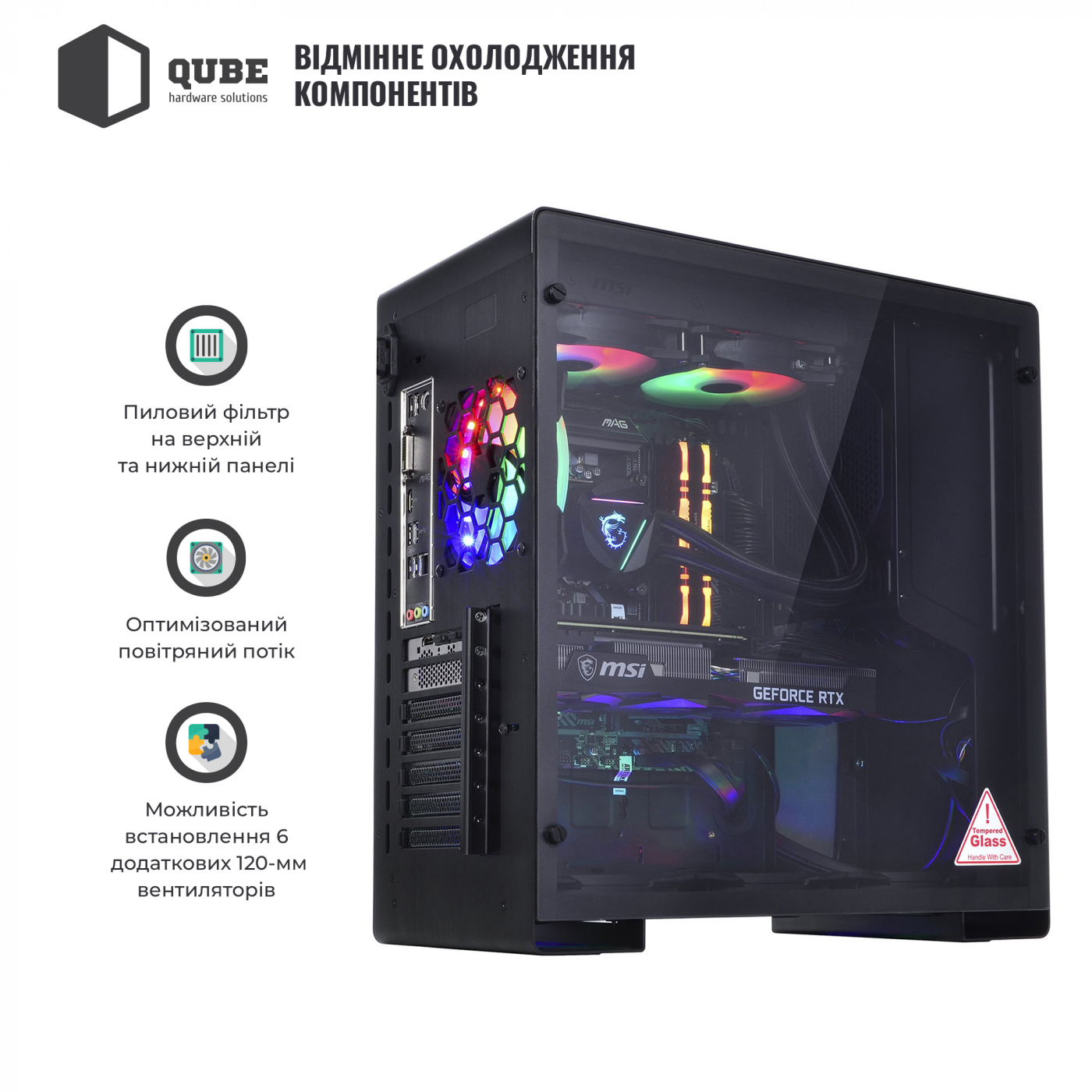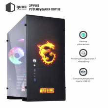 Корпус QUBE GRIFFIN Printed MSI UltimateWeapon поєднує у своєму оформленні фірмовий дизайн компанії MSI, що постачає найбільш топові ігрові комплектуючі, і ігровий дизайн багатокористувацької Ultimate Weapon. Лицьова панель відрізняється мінімалістичністю – на темному тлі розміщений дракон, що палає – символ компанії MSI. Корпус володіє строгими формами, алюмінієвими панелями та однією прозорою бічною стінкою, а також достатнім простором для встановлення найпотужніших комплектуючих. Дизайн QUBE GRIFFIN Printed MSI UltimateWeapon підкреслить особливий статус свого власника та покаже його причетність до світу професійного геймінгу.