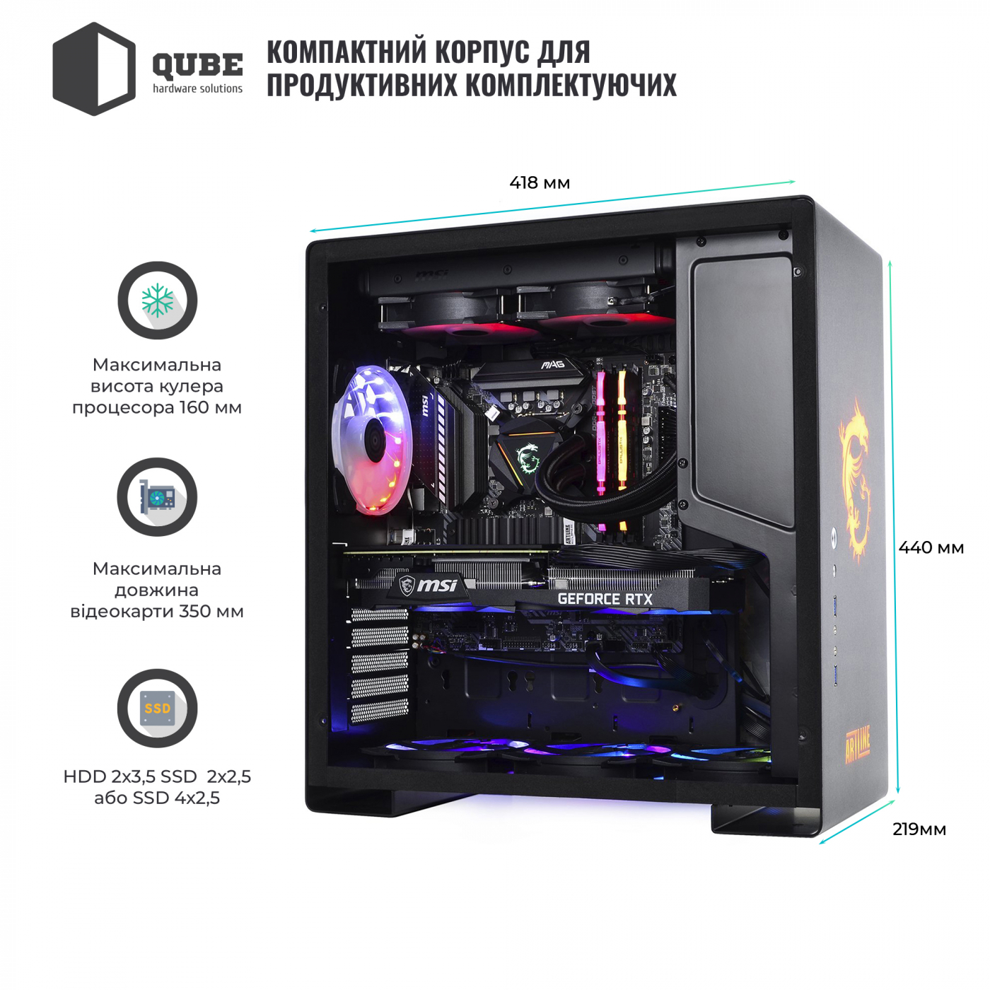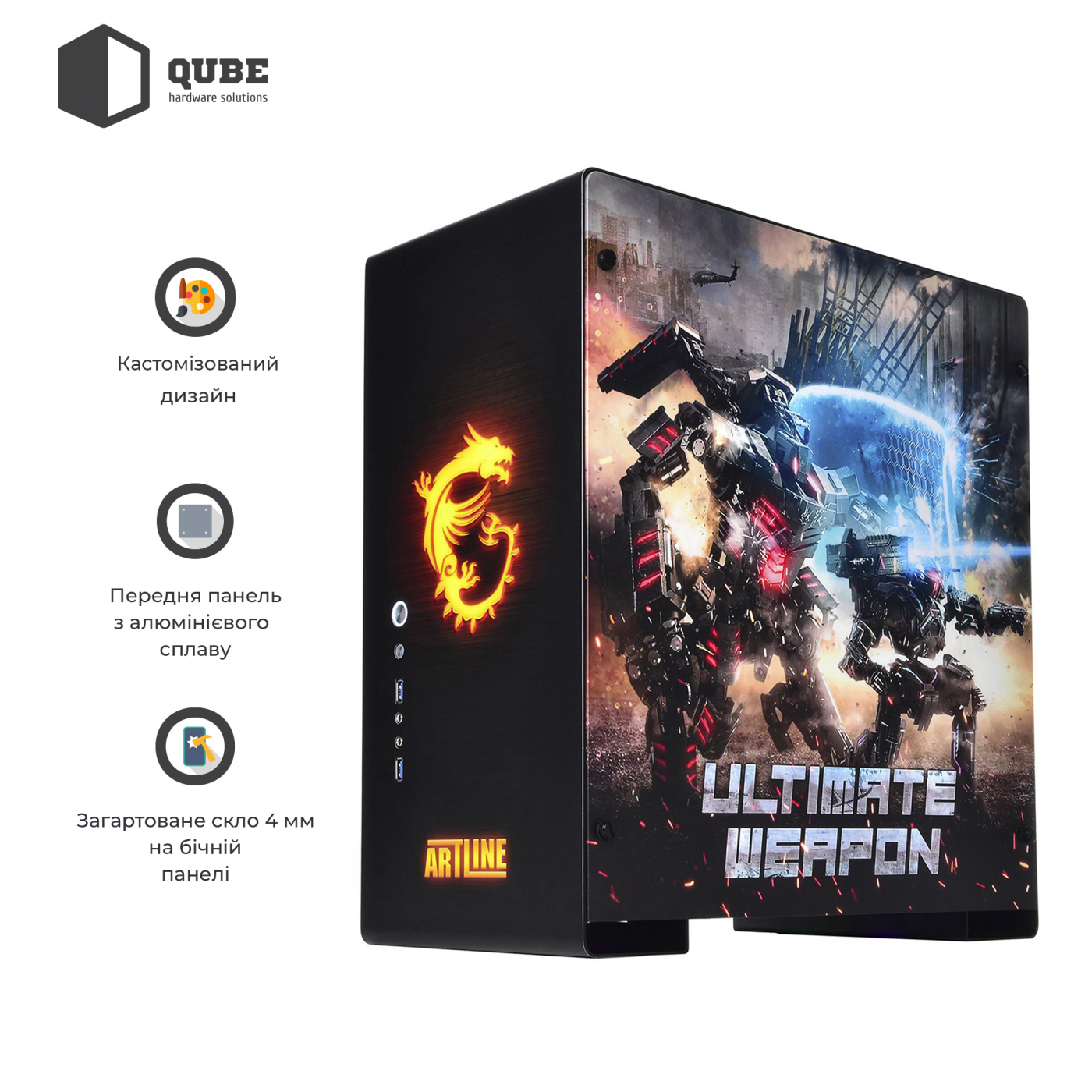 Корпус QUBE GRIFFIN Printed MSI UltimateWeapon (QBU5A_WPNU3PMUW) / MiddleTower / ATX | microATX | mini-ITX / 2xUSB3.0 + Audio + Mic / 2x2.5" / 2x2.5"/3.5" / 418x219x440 / Фірмовий дизайн (MSI) / 12міс. / QBU5A_WPNU3PMUW