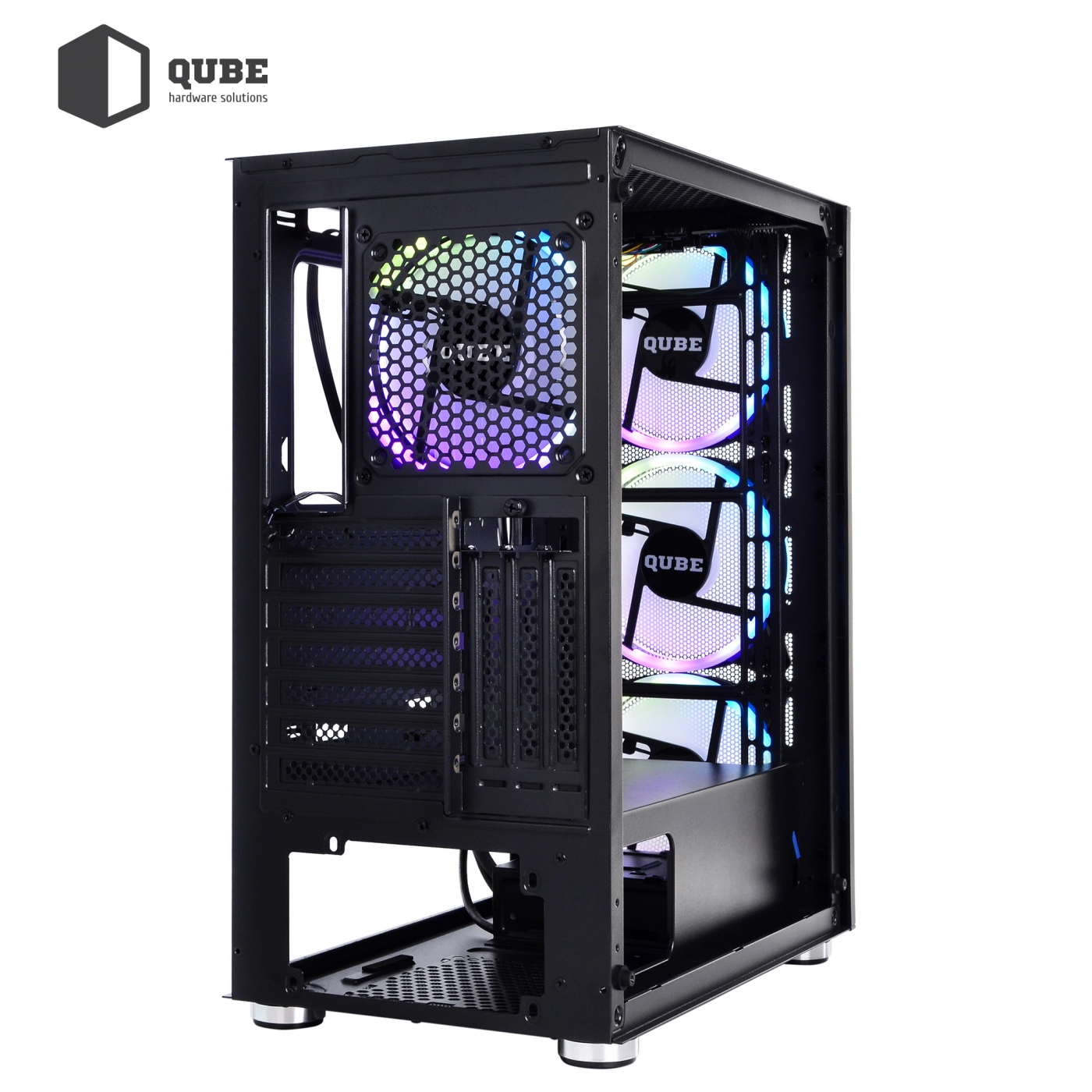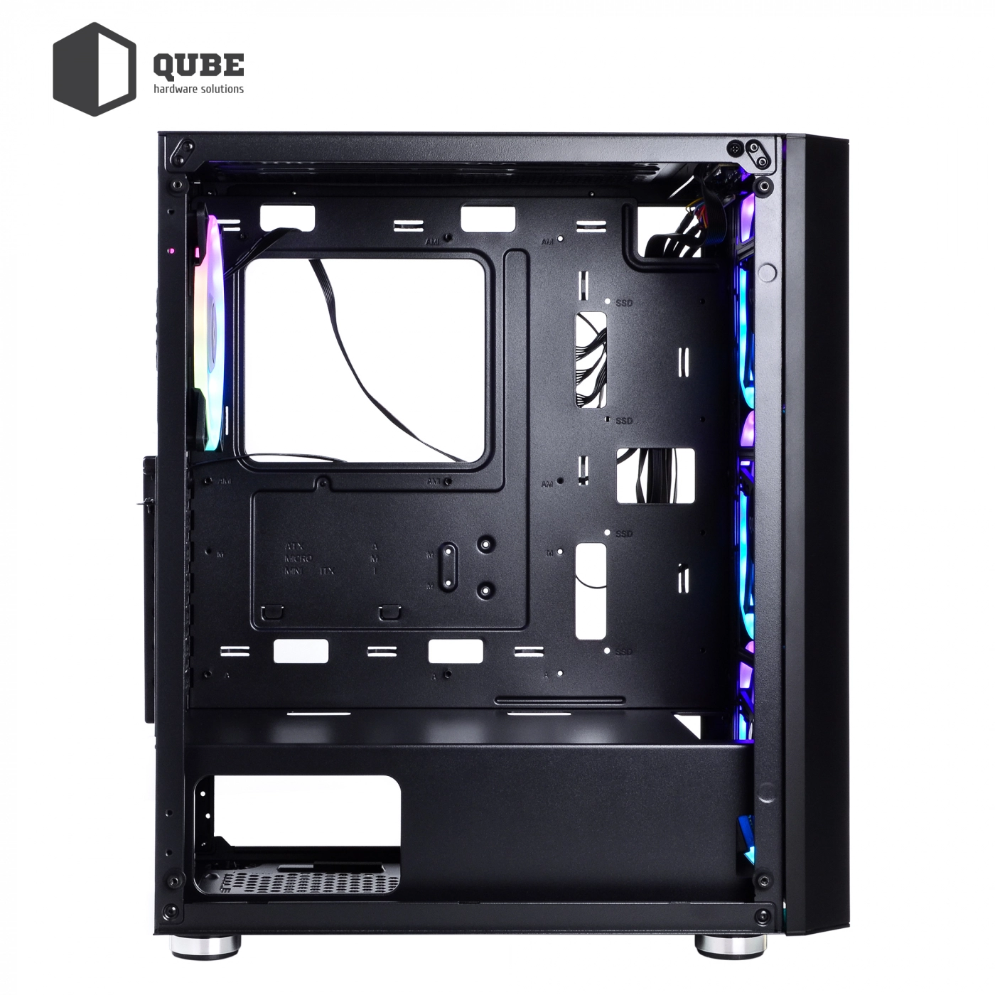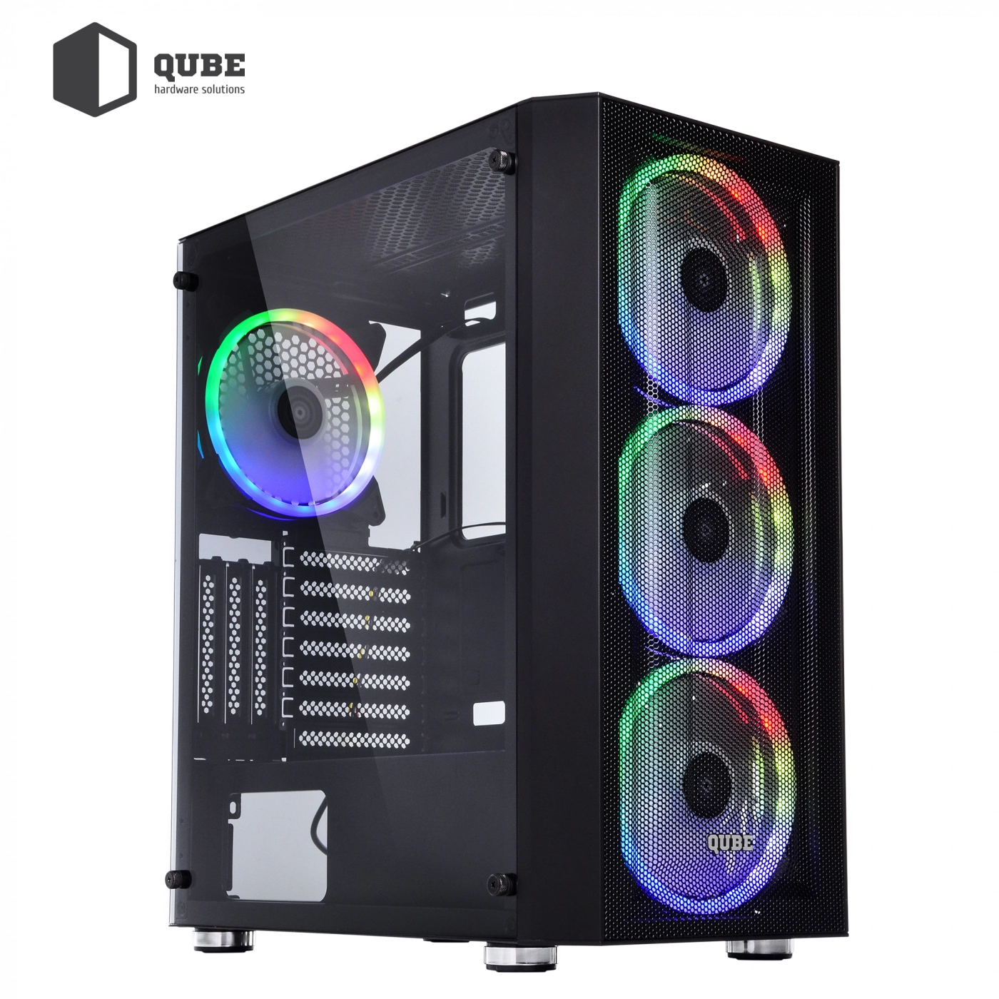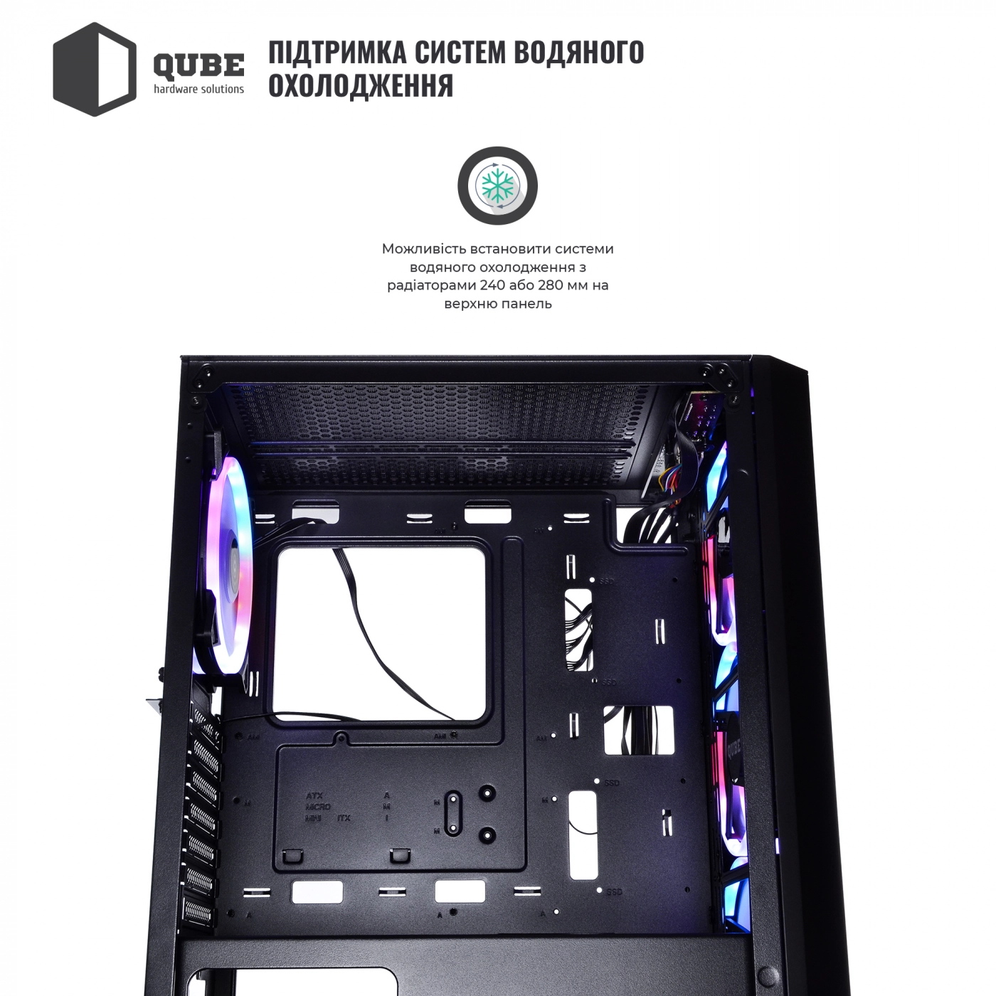 QUBE GUARD ARGB – це просторий корпус формату MiddleTower з яскравими RGB вентиляторами, який задовольнить вимоги переважної більшості користувачів. Виготовлений корпус з міцного металу товщиною 0,6 мм, гострі краї якого, акуратно зашліфовані і підігнуті всередину для безпечної збірки комп'ютера. Бічні панелі виготовлені з міцного загартованого скла товщиною 4 мм, через які добре буде видно «начинку» ПК, а також встановлені вентилятори з підсвічуванням. Передня металева панель має незліченну кількість дрібних отворів, за рахунок яких забезпечується хороший повітрообмін всередині корпусу. Для зручності при збірці комп'ютера мрії і при його експлуатації, розробники корпусу продумали отвори для укладання кабелів, велике сервісне вікно для установки або заміни процесорного кулера, окремий відсік для блоку живлення.