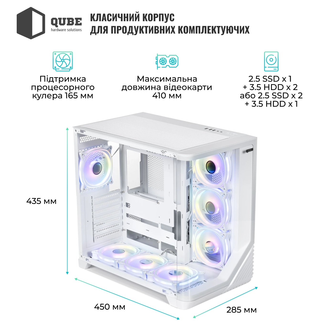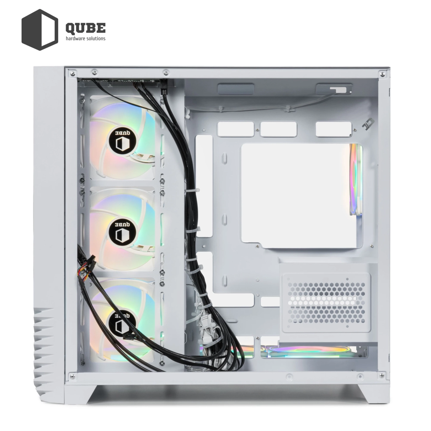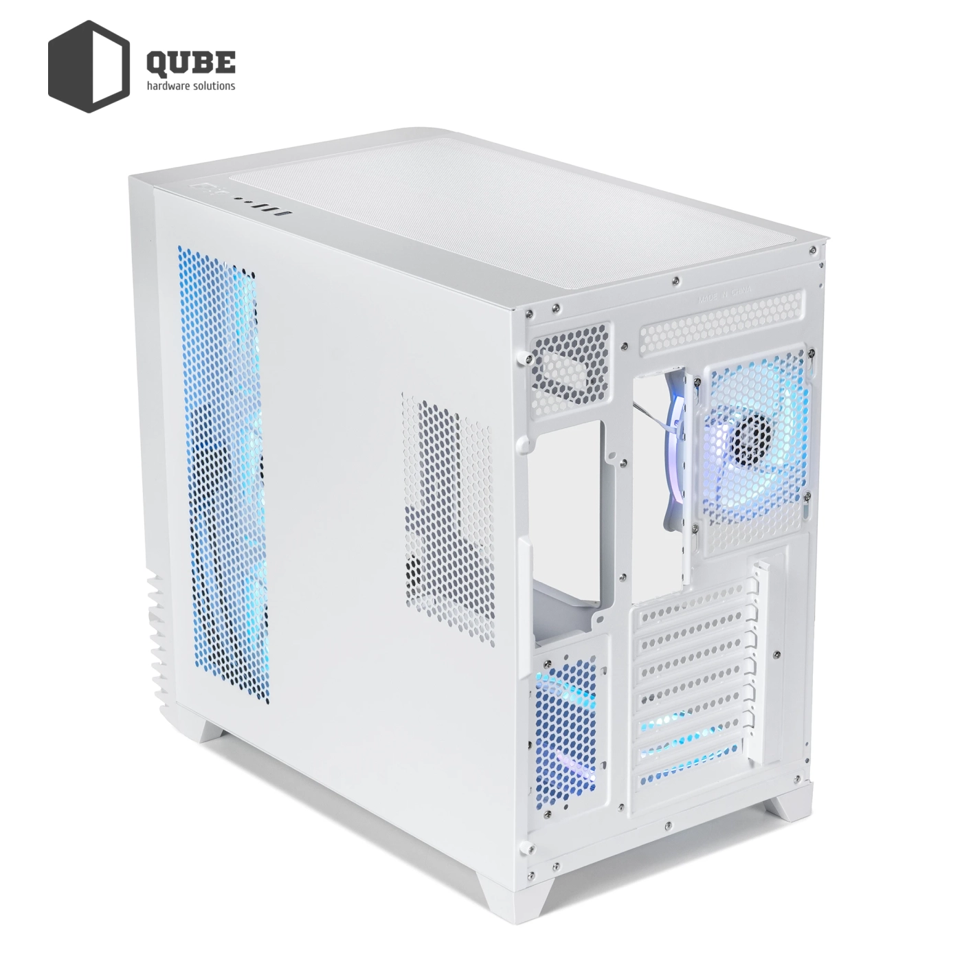 Корпус QUBE Mirage White стане універсальною платформою і для студій 3D-графіки, і для геймерських баталій, і домашнього медіа-сервера. Завдяки гнучкості внутрішнього простору ви зможете без обмежень модернізувати систему, встановлюючи нові GPU, додаткові накопичувачі або продуктивніше охолодження — ніяких компромісів між стилем та функціональністю.