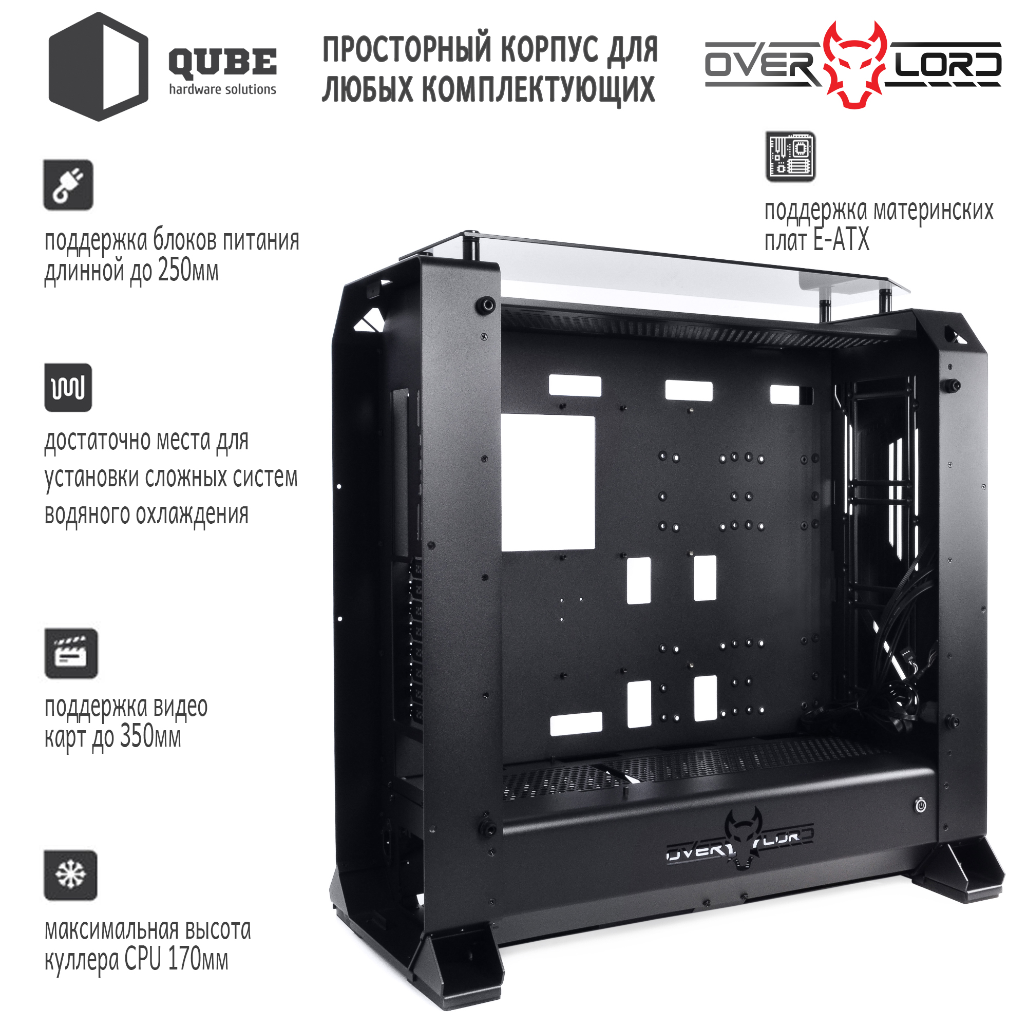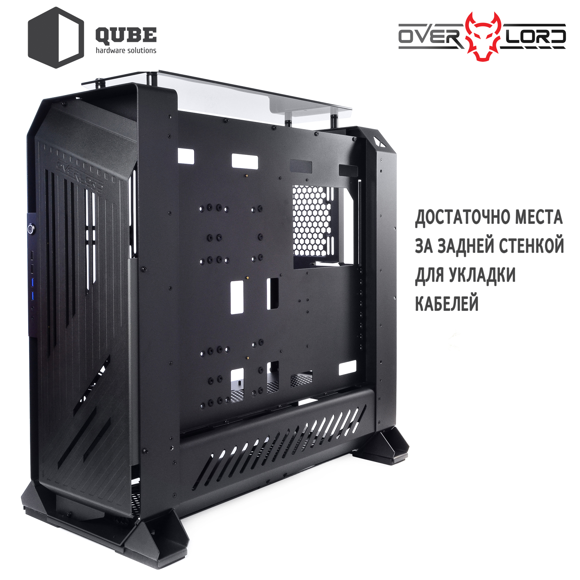 Корпус QUBE OVERLORD 801 предлагает широкие возможности по построению на его базе самой мощной игровой станции или сверхпроизводительного компьютера с водяным охлаждением (СВО). Наличие в корпусе семи посадочных мест для установки вентиляторов диаметром 120 или 140 мм весьма показательно. Внутри достаточно места для установки больших материнских плат форм-фактора E-ATX, установки габаритных блоков питания длинной до 250 мм (отдельная выделенная зона для их оптимального охлаждения), нескольких видеокарт до 350 мм и башенных кулеров высотой до 170 мм.