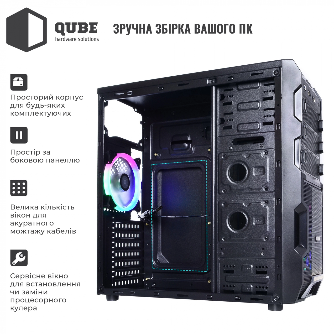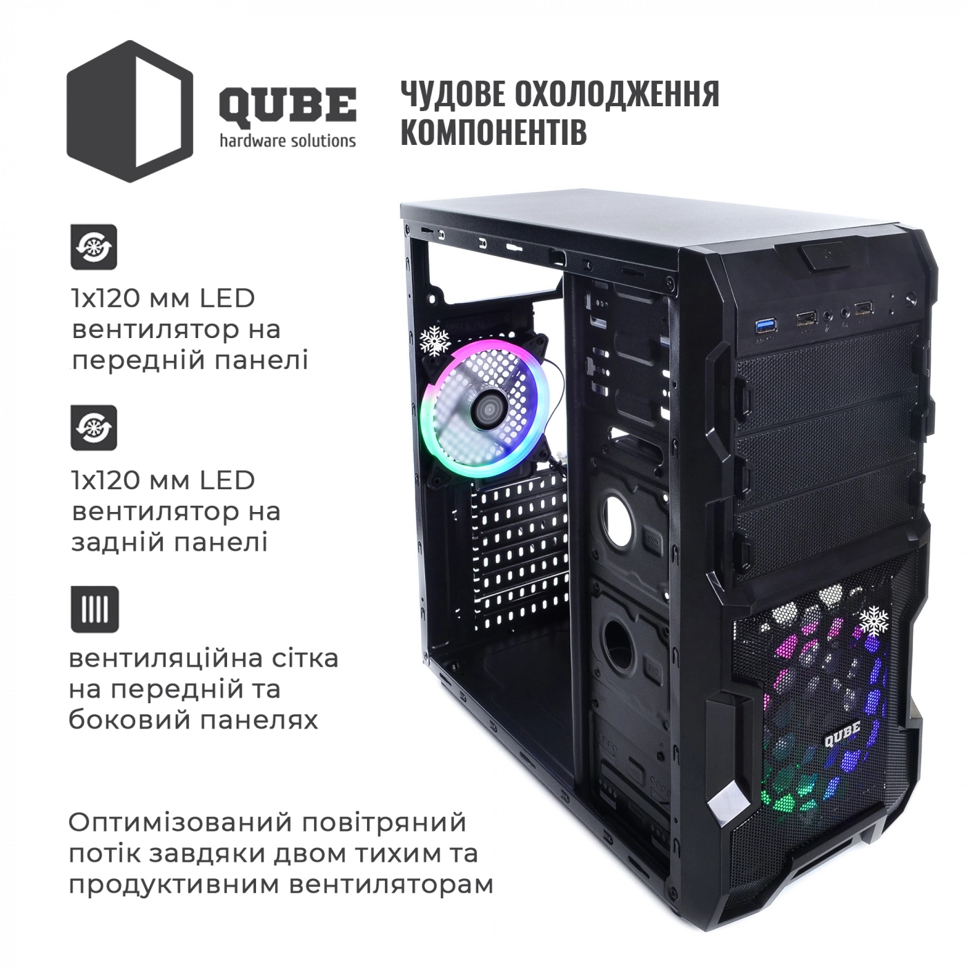 Фірмові корпуси QUBE відрізняються сучасним дизайном, продуманою конструкцією, відмінним функціоналом та дружні до будь-якого користувача, який зважився на самостійну збірку всіх необхідних комплектуючих у готовий персональний комп'ютер.