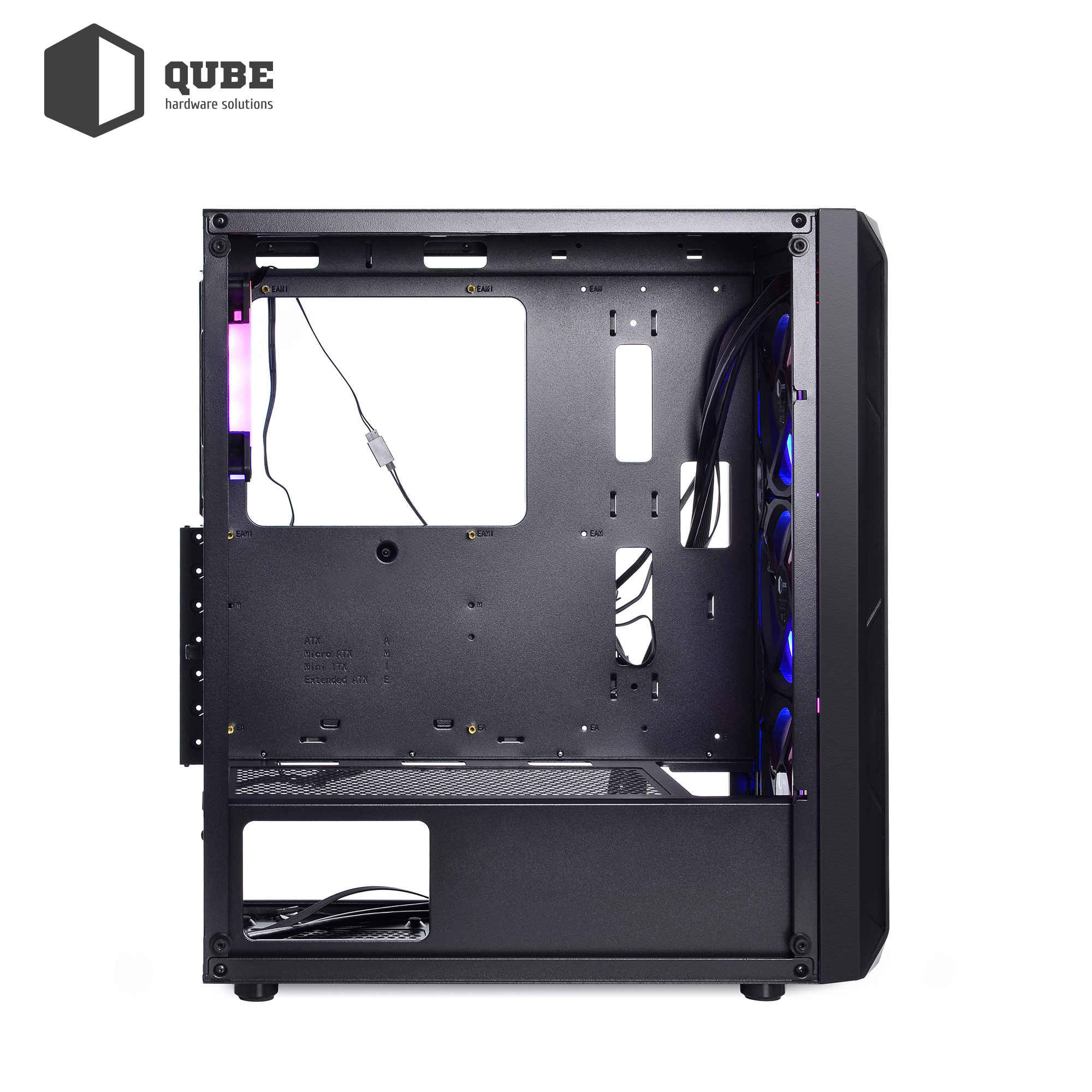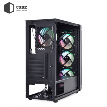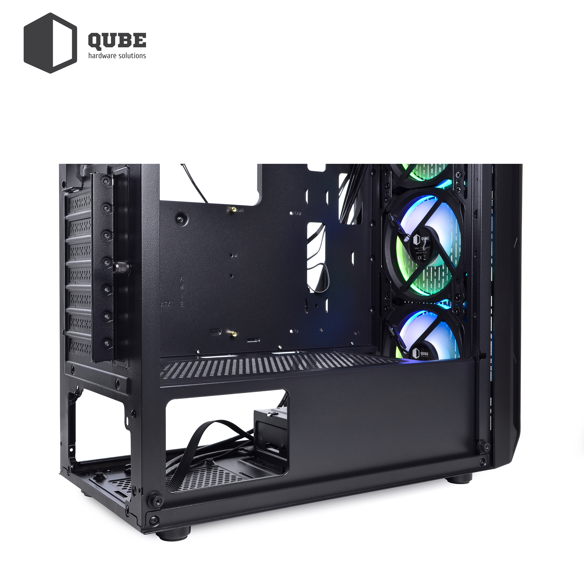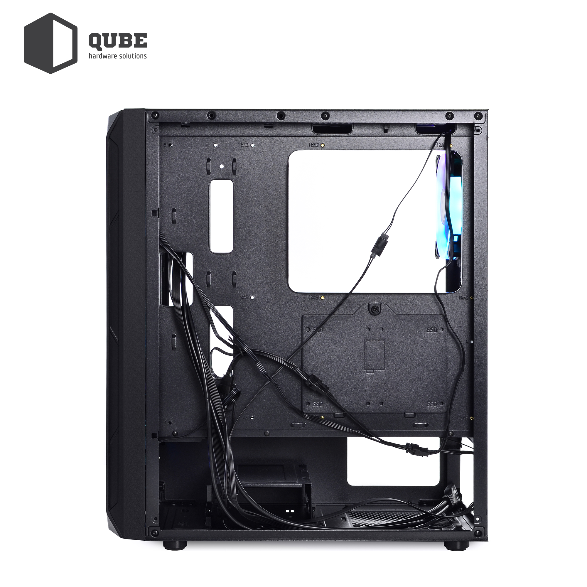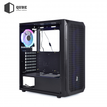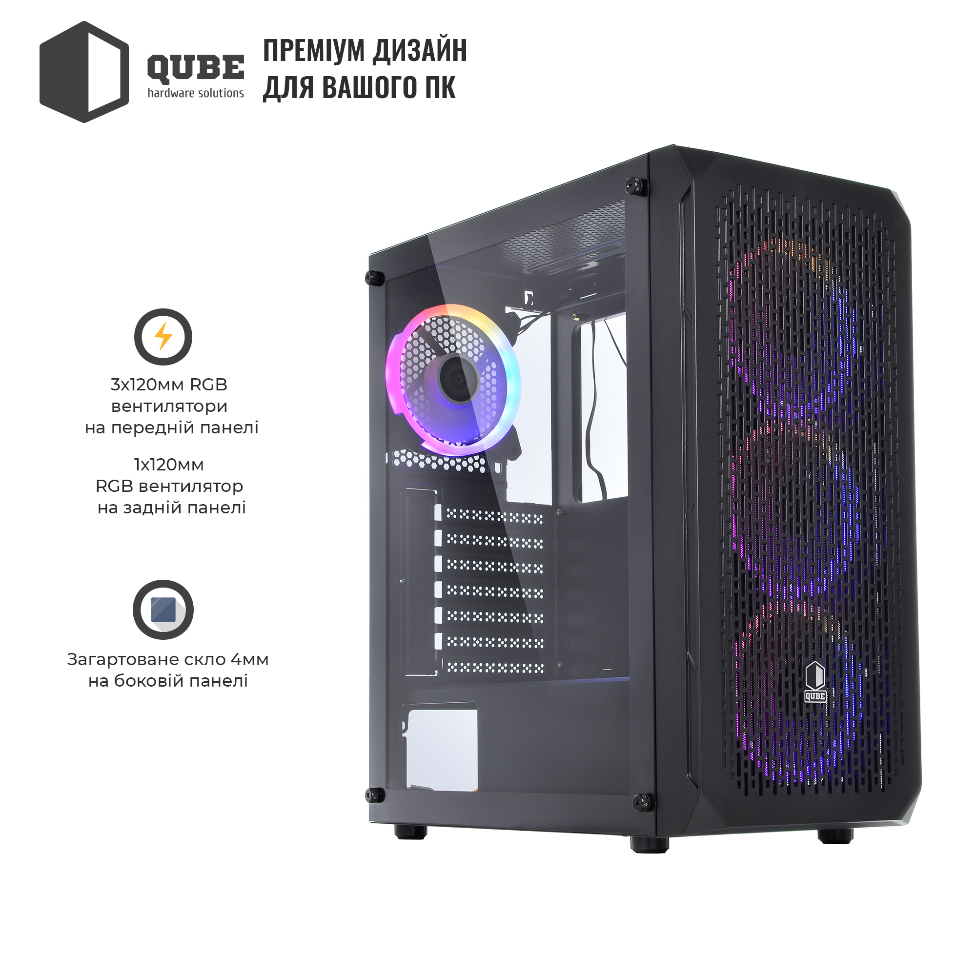 QUBE SHADOW RGB – це просторий корпус формату MiddleTower з яскравими RGB вентиляторами, який задовольнить вимоги переважної більшості користувачів. Виготовлений корпус з міцного металу товщиною 0,5 мм, гострі краї якого, акуратно зашліфовані і підігнуті всередину для безпечної збірки комп'ютера. Бічна панель виготовлена з міцного загартованого скла товщиною 4 мм, через яку добре буде видно «начинку» ПК, а також встановлені вентилятори з підсвічуванням. Передня панель має незліченну кількість дрібних отворів, за рахунок яких забезпечується хороший повітрообмін всередині корпусу. Для зручності при збірці комп'ютера мрії і при його експлуатації, розробники корпусу продумали отвори для укладання кабелів, велике сервісне вікно для установки або заміни процесорного кулера, окремий відсік для блоку живлення.