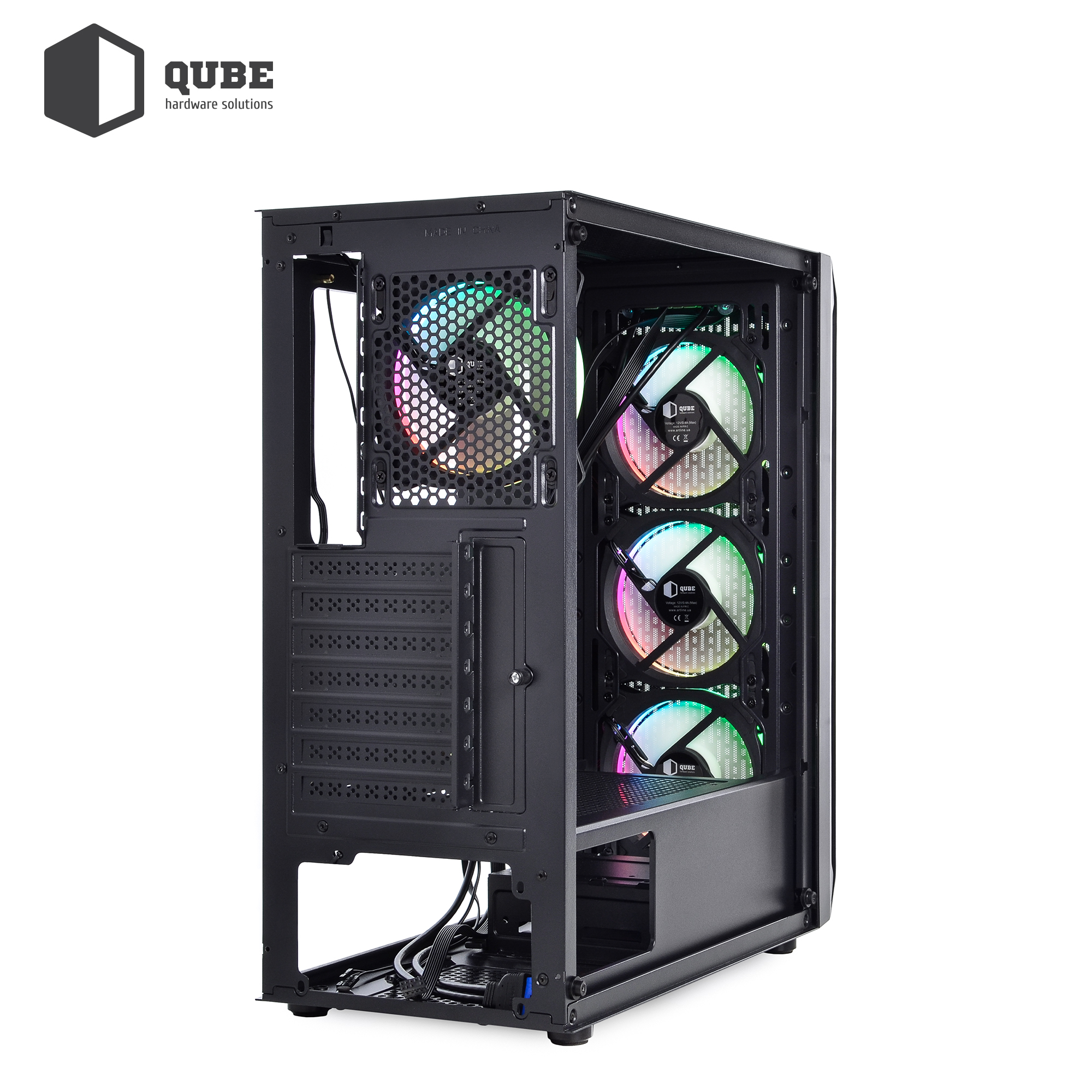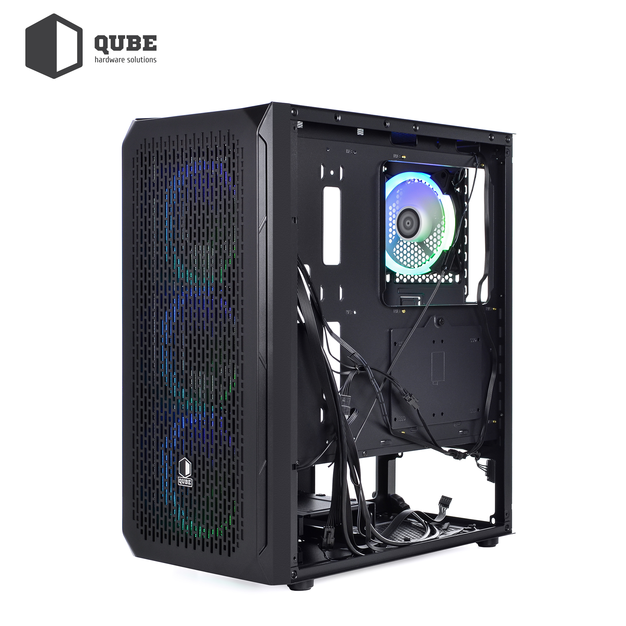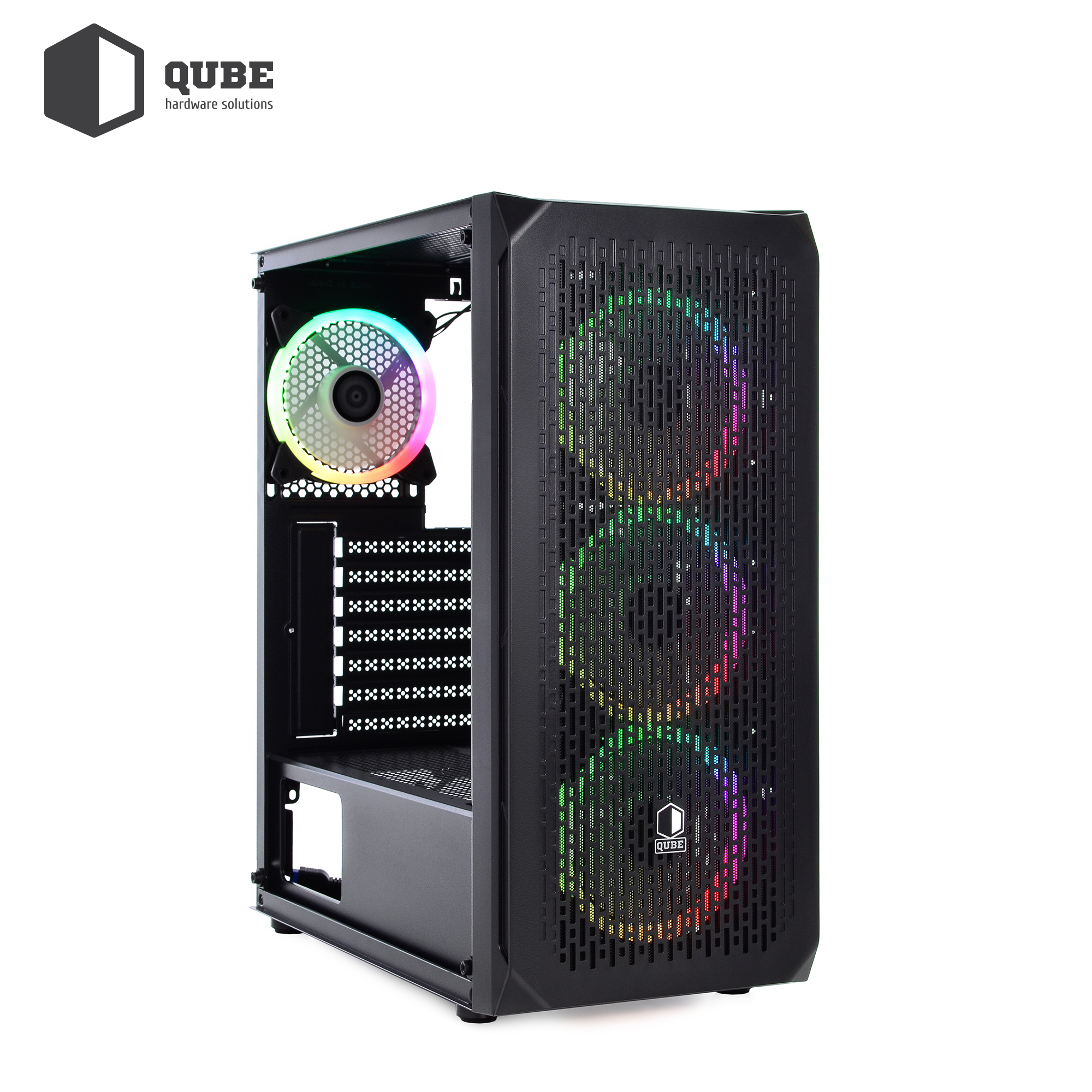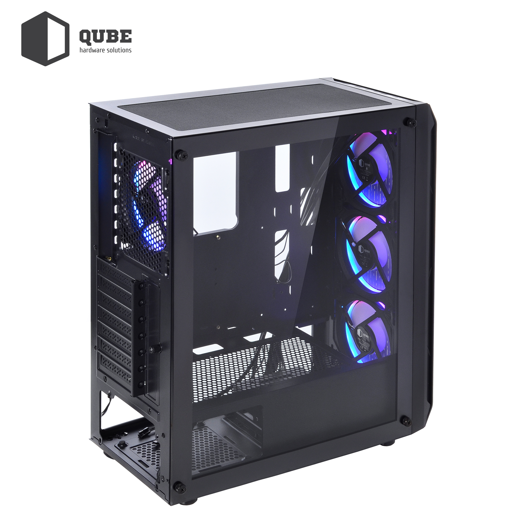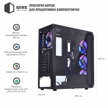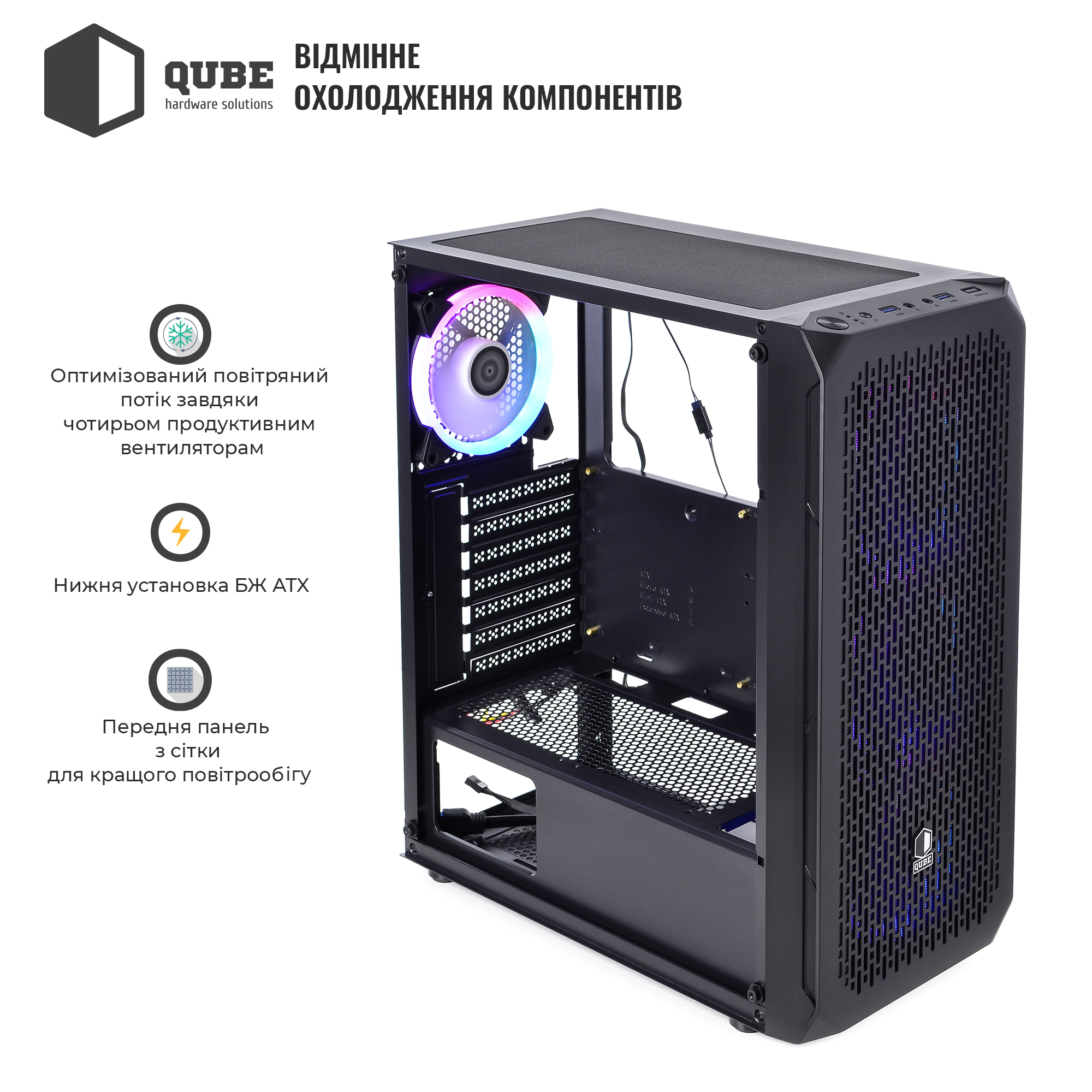 QUBE SHADOW RGB – це просторий корпус формату MiddleTower з яскравими RGB вентиляторами, який задовольнить вимоги переважної більшості користувачів. Виготовлений корпус з міцного металу товщиною 0,5 мм, гострі краї якого, акуратно зашліфовані і підігнуті всередину для безпечної збірки комп'ютера. Бічна панель виготовлена з міцного загартованого скла товщиною 4 мм, через яку добре буде видно «начинку» ПК, а також встановлені вентилятори з підсвічуванням. Передня панель має незліченну кількість дрібних отворів, за рахунок яких забезпечується хороший повітрообмін всередині корпусу. Для зручності при збірці комп'ютера мрії і при його експлуатації, розробники корпусу продумали отвори для укладання кабелів, велике сервісне вікно для установки або заміни процесорного кулера, окремий відсік для блоку живлення.