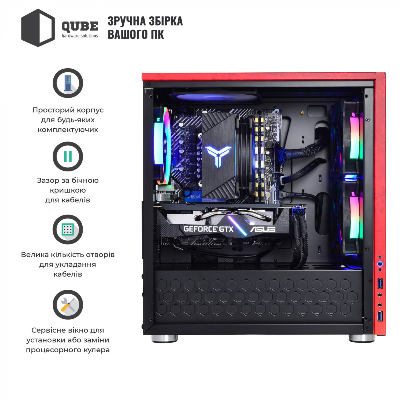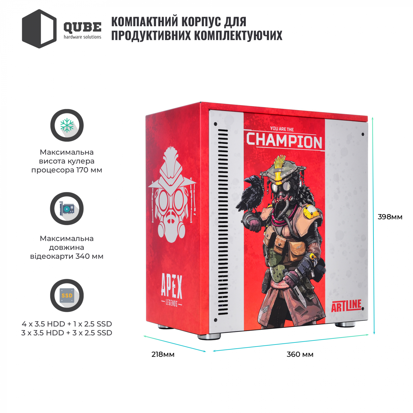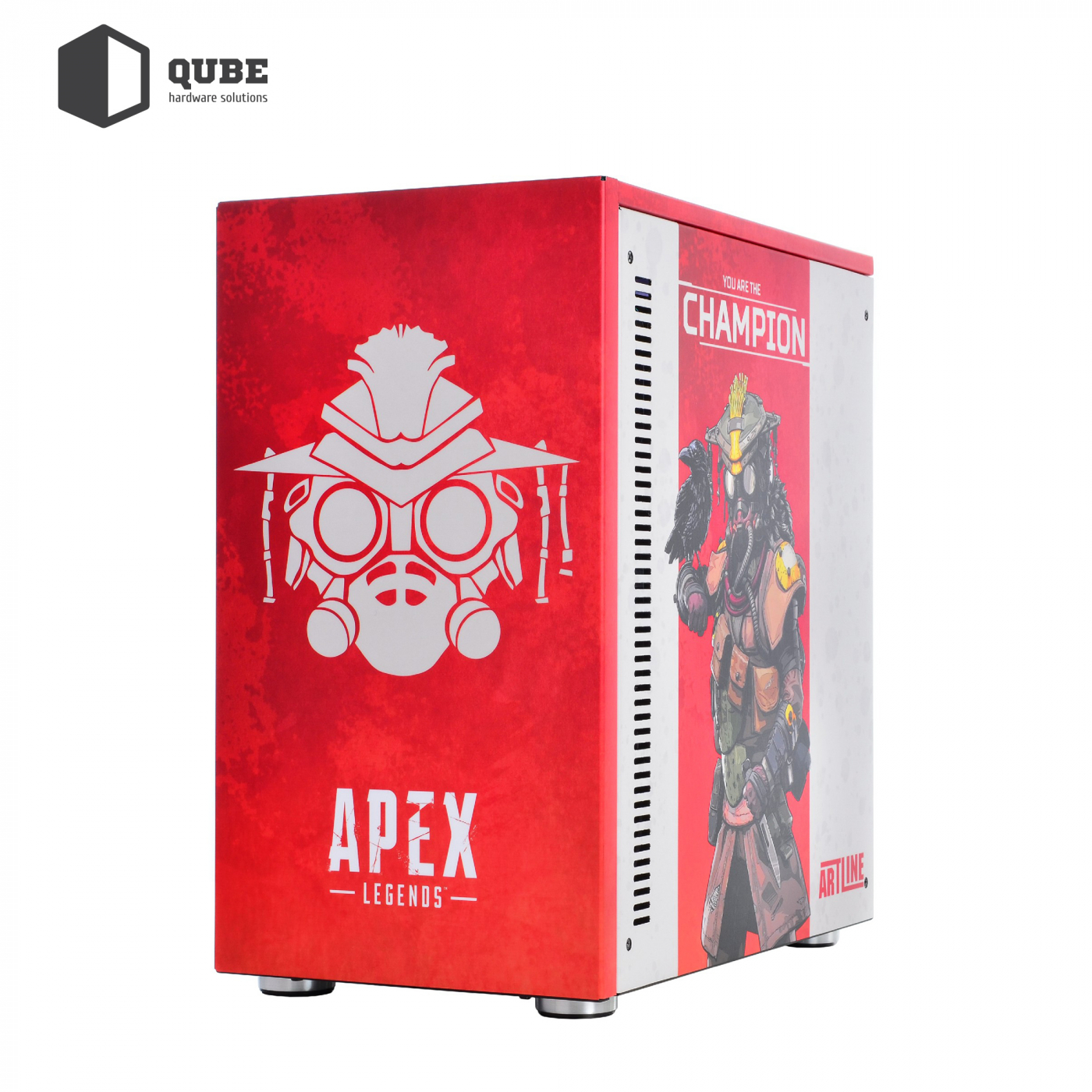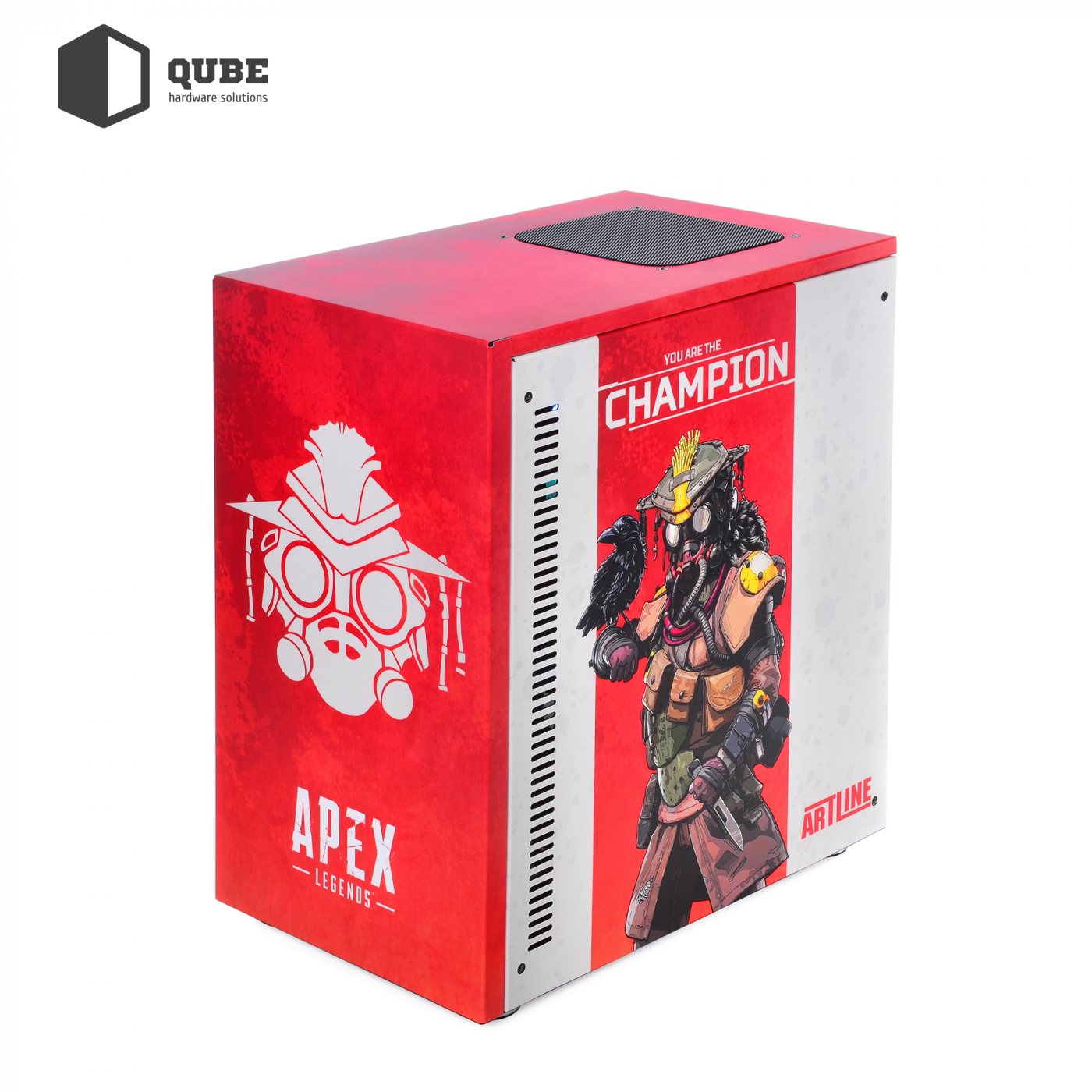 Корпус QUBE STYLE Aluminum Black APEX Champion Printed створений для шанувальників геройського шутера Apex Legends. Дизайн корпусу виконаний у яскраво-червоних кольорах. На передній та бічних панелях нанесено малюнок зі знайомим фанатам гри персонажем – Бладхаундом (Bloodhound). Не тільки дизайн, але й потужні комплектуючі, для яких знайдеться місце в корпусі типорозміру MiddleTower, гарантують максимум задоволення від звичного процесу гри.
