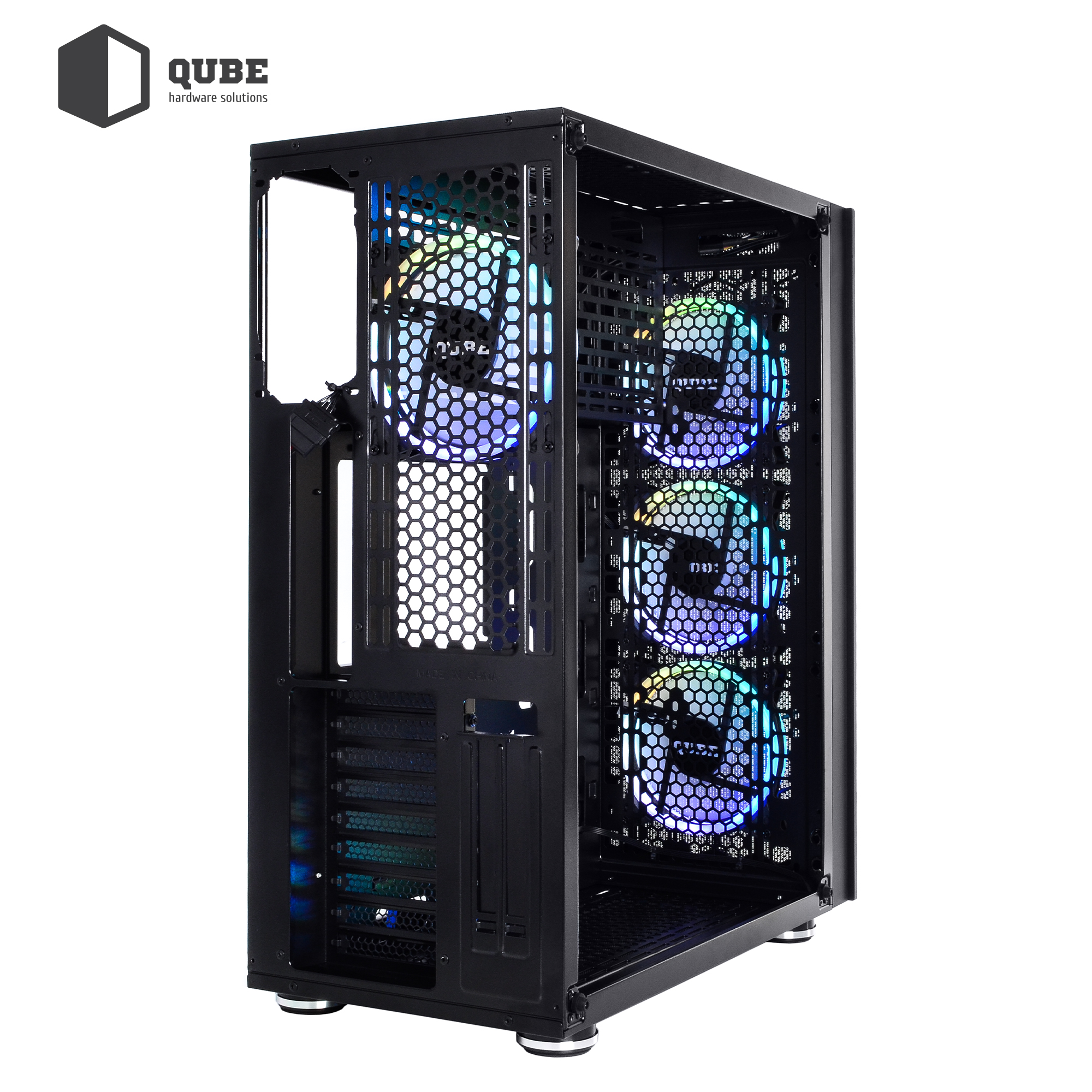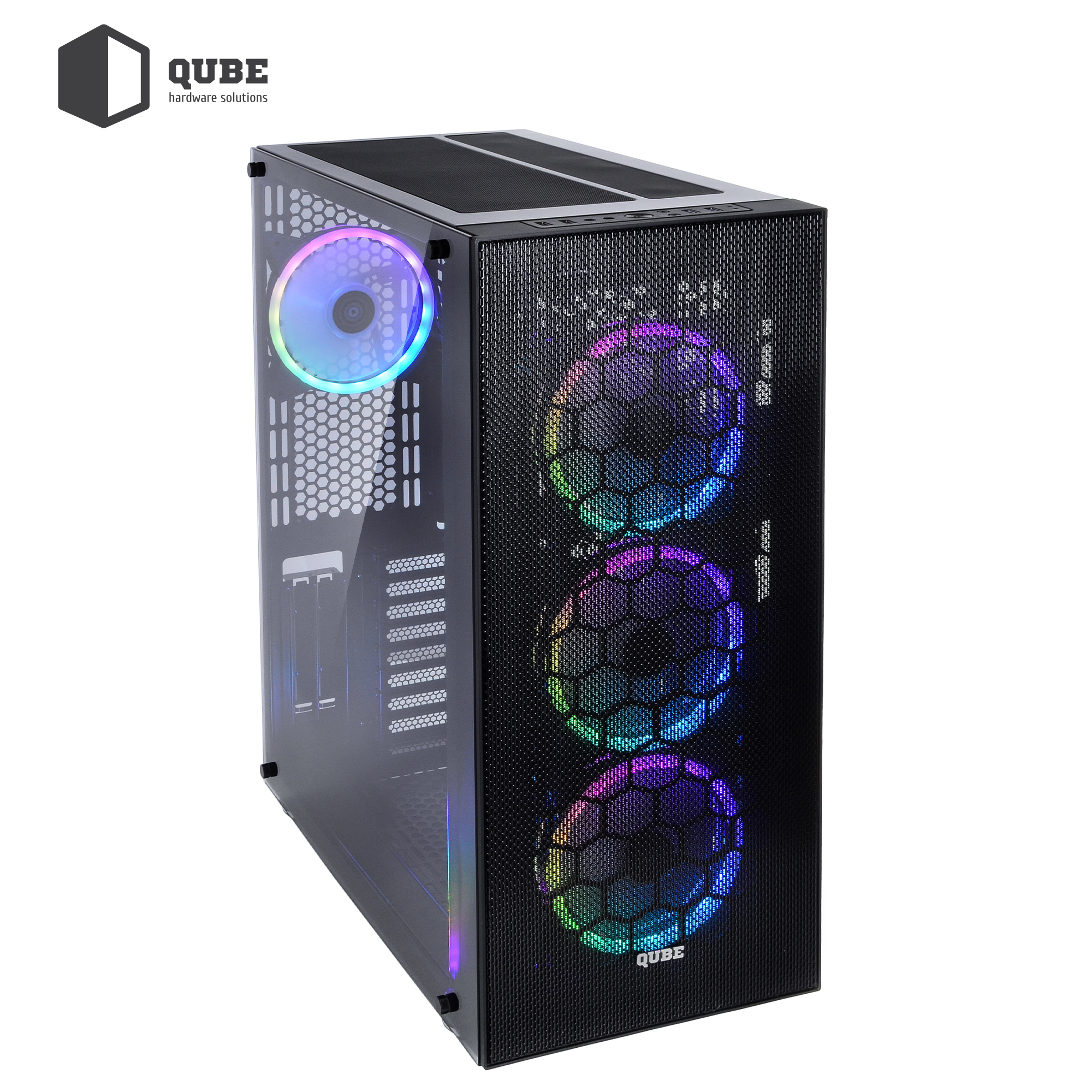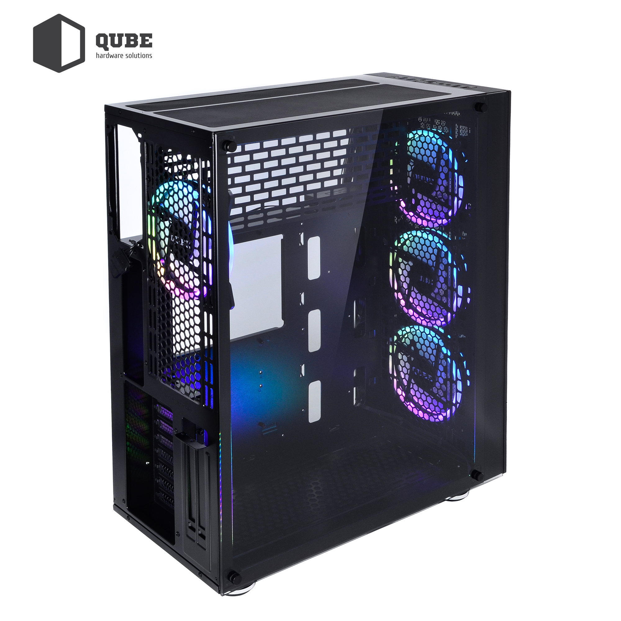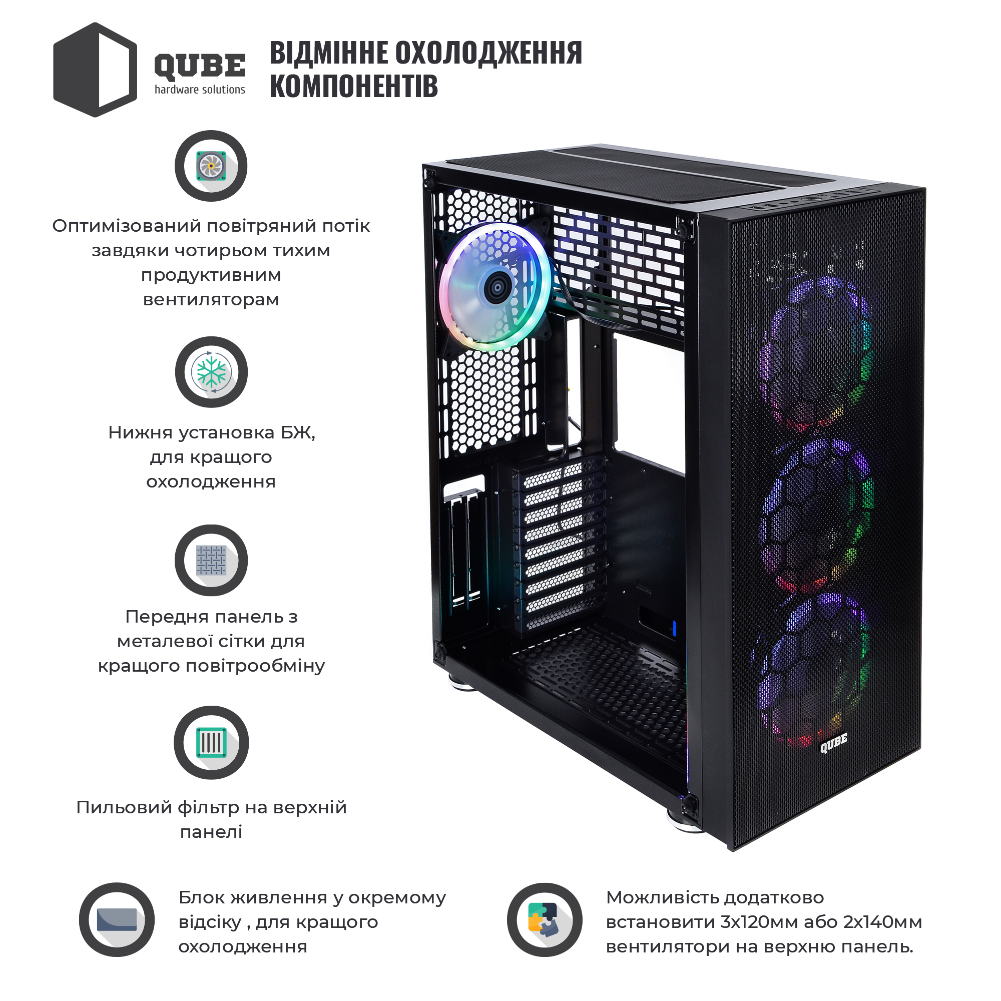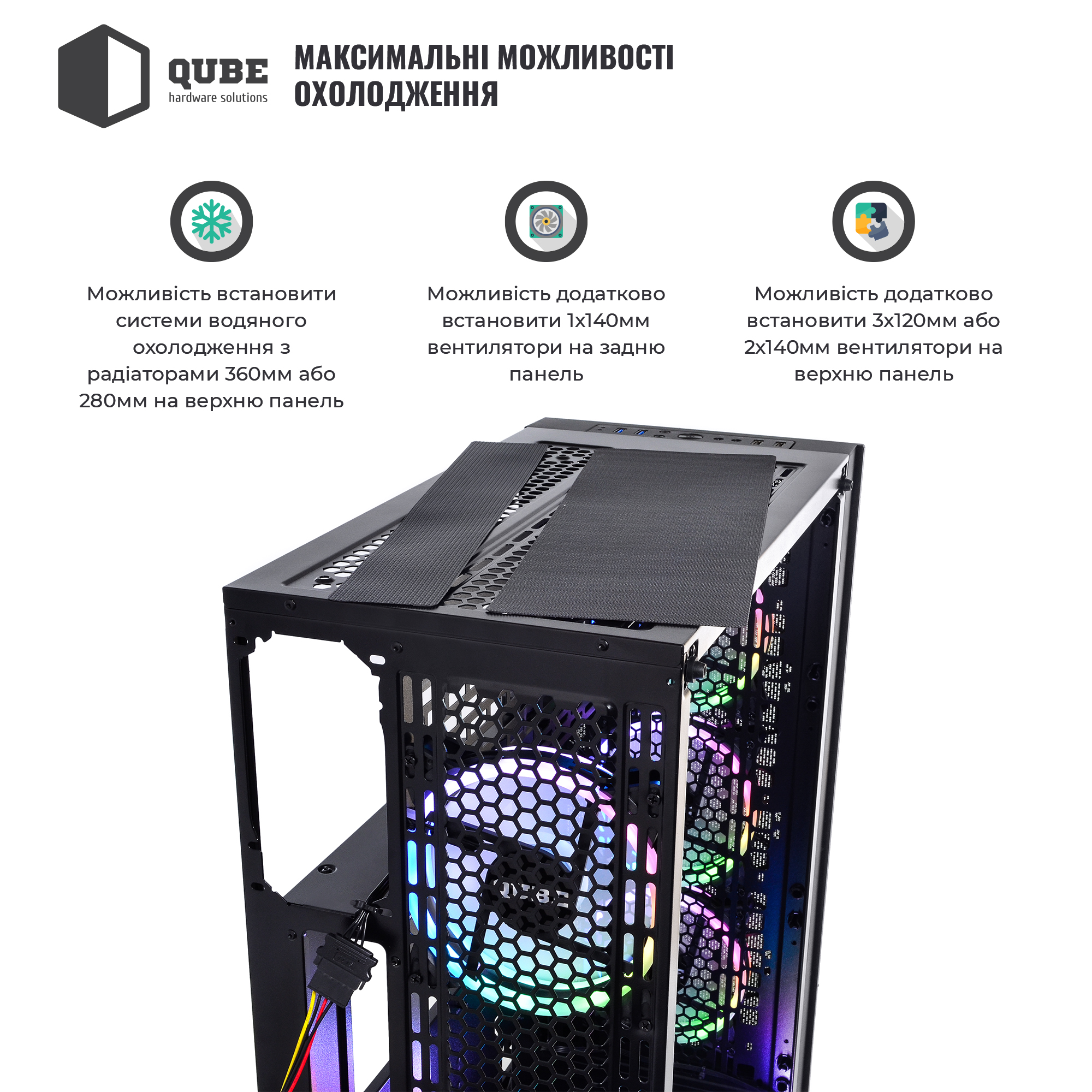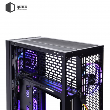 Однією з особливостей корпусу QUBE TITAN ARGB є наявність за гратами передній панелі трьох 14 сантиметрових вентиляторів з яскравим багатобарвним і регульованим підсвічуванням. Ще один такий же вентилятор розташований ззаду корпусу. Розмір і розташування вентиляторів забезпечить відмінну продувність у всіх, навіть технічно обмежених до доступу, місцях.