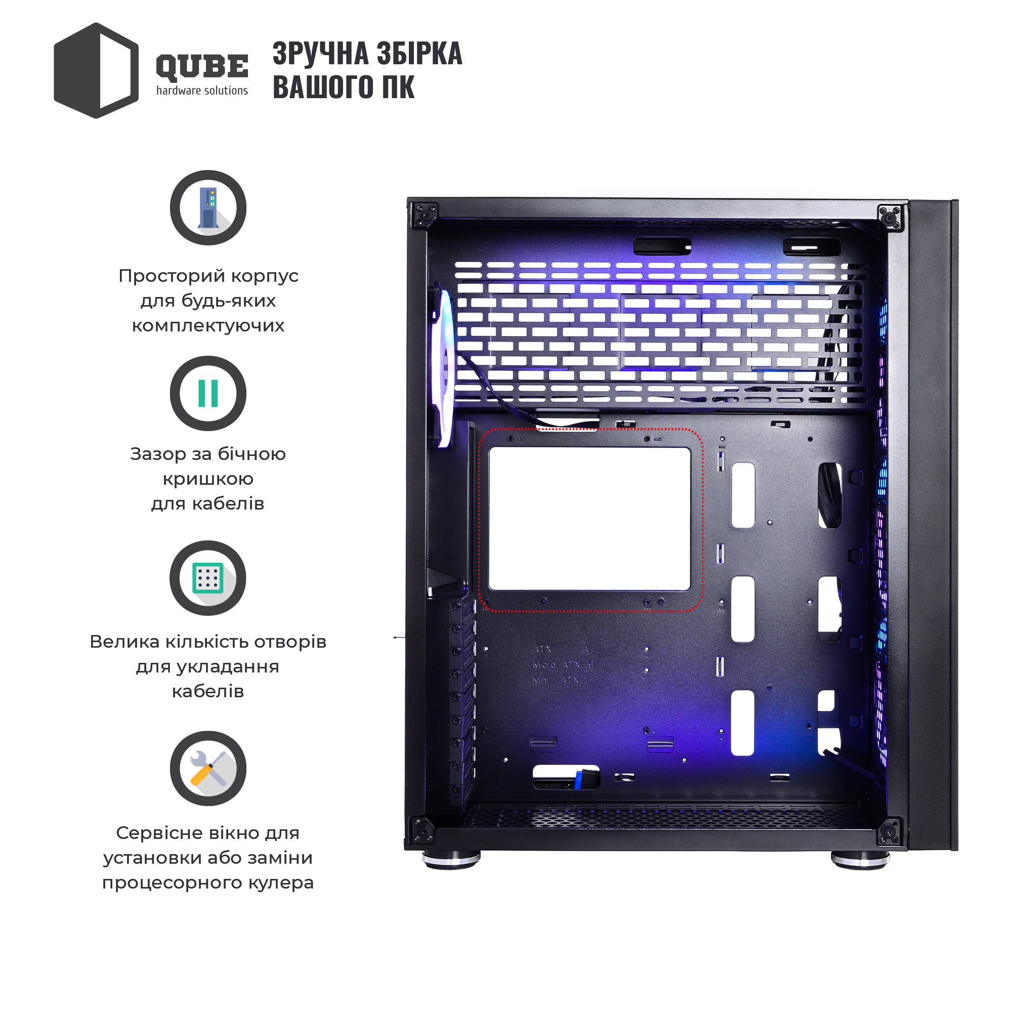 Фірмові корпуси QUBE відрізняються сучасним дизайном, продуманою конструкцією, відмінним функціоналом і дружні до будь-якого користувача, який зважився на самостійну збірку всіх необхідних комплектуючих в готовий персональний комп'ютер.