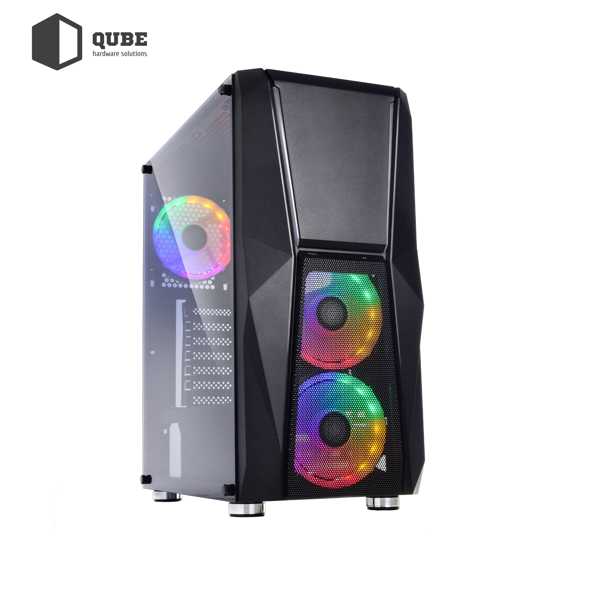 Однією з особливостей нового QUBE TURBO виступає наявність за сіткою передній панелі двох 12 сантиметрових вентиляторів (плюс додатковий 12 см на задній грані). Їх розмір забезпечить відмінну повітряний потік у всіх, навіть технічно обмежених до доступу, місцях. Крім цього, всі три кулера оснащені багатобарвним RGB LED підсвічуванням.