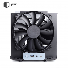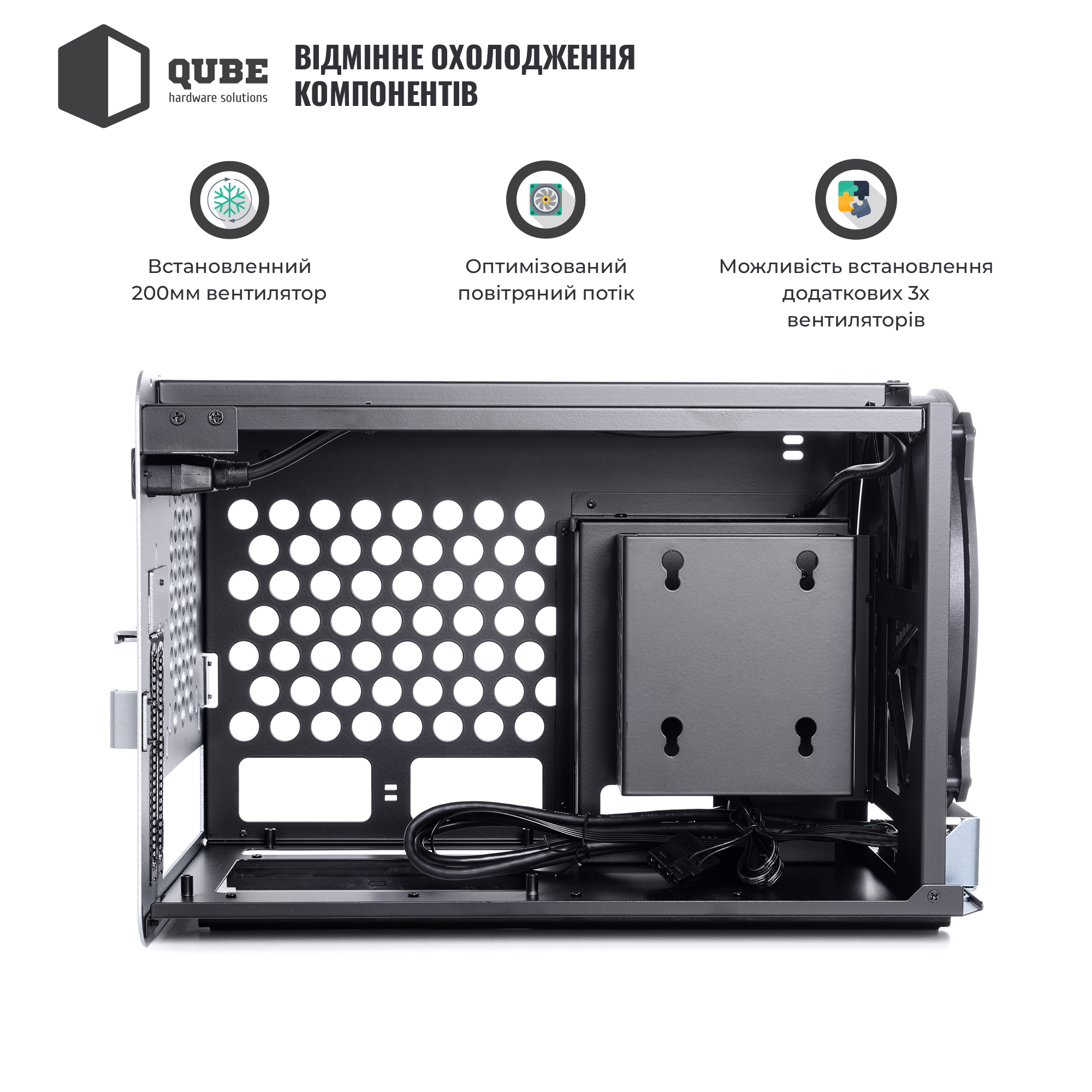 З коробки корпус QUBE V8 поставляється з одним фронтальним 200 мм вентилятором та оснащений блоком живлення на 600 Вт. Користувач, за бажанням, зможе додатково інсталювати ще 3 кулери: зверху 2x120 мм та ззаду 1x140/120 мм. Завдяки продуманій внутрішній конструкції повітряний потік від працюючих вентиляторів сприятиме оптимальному охолодженню встановлених компонентів.