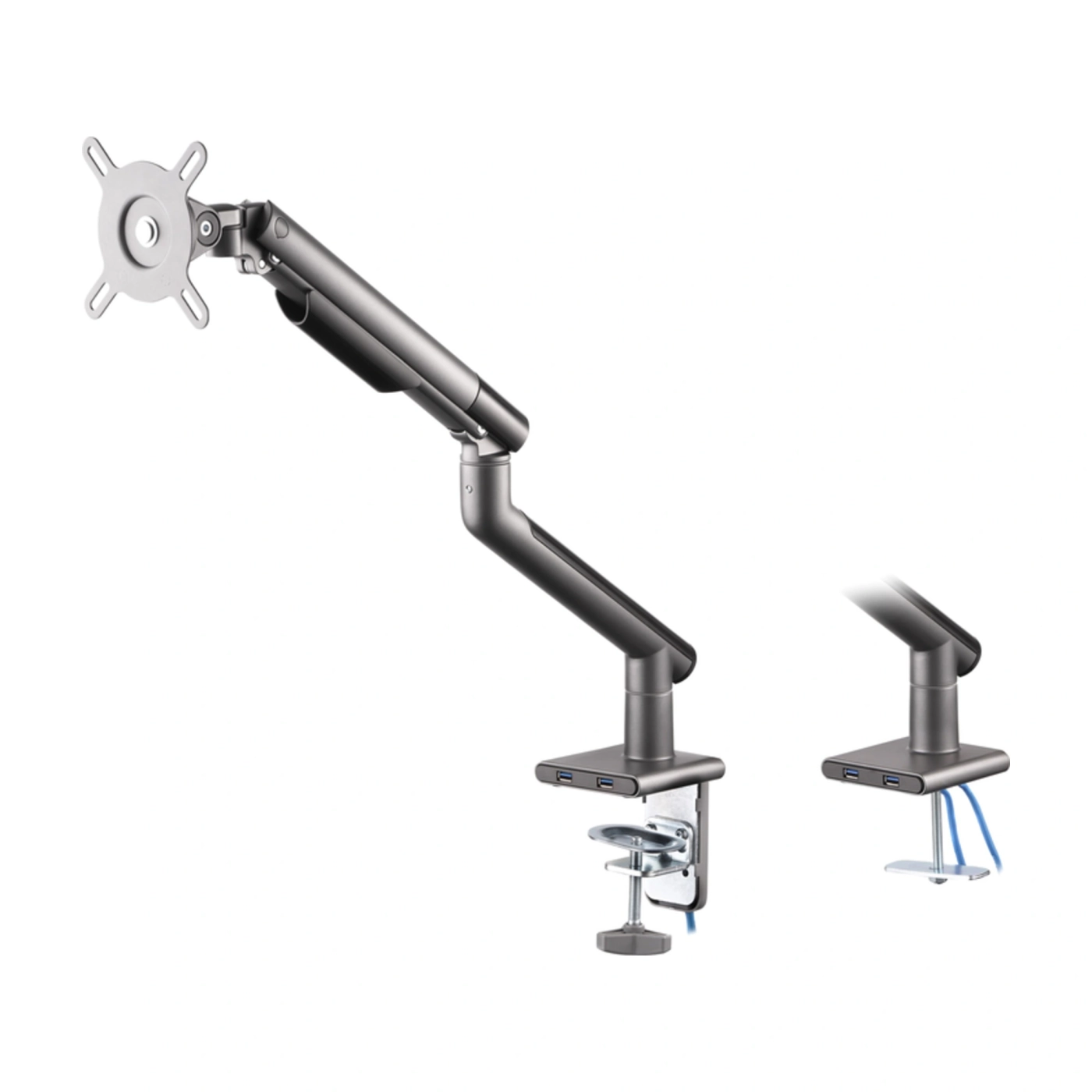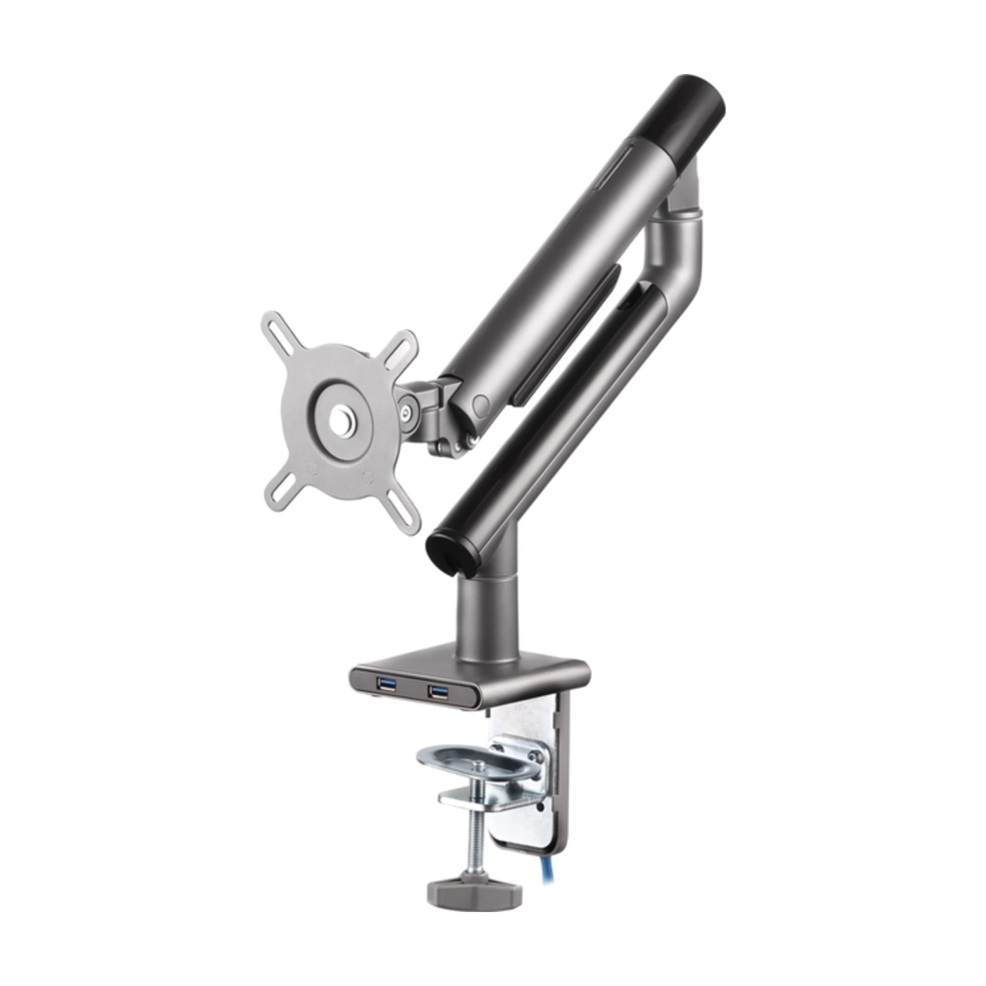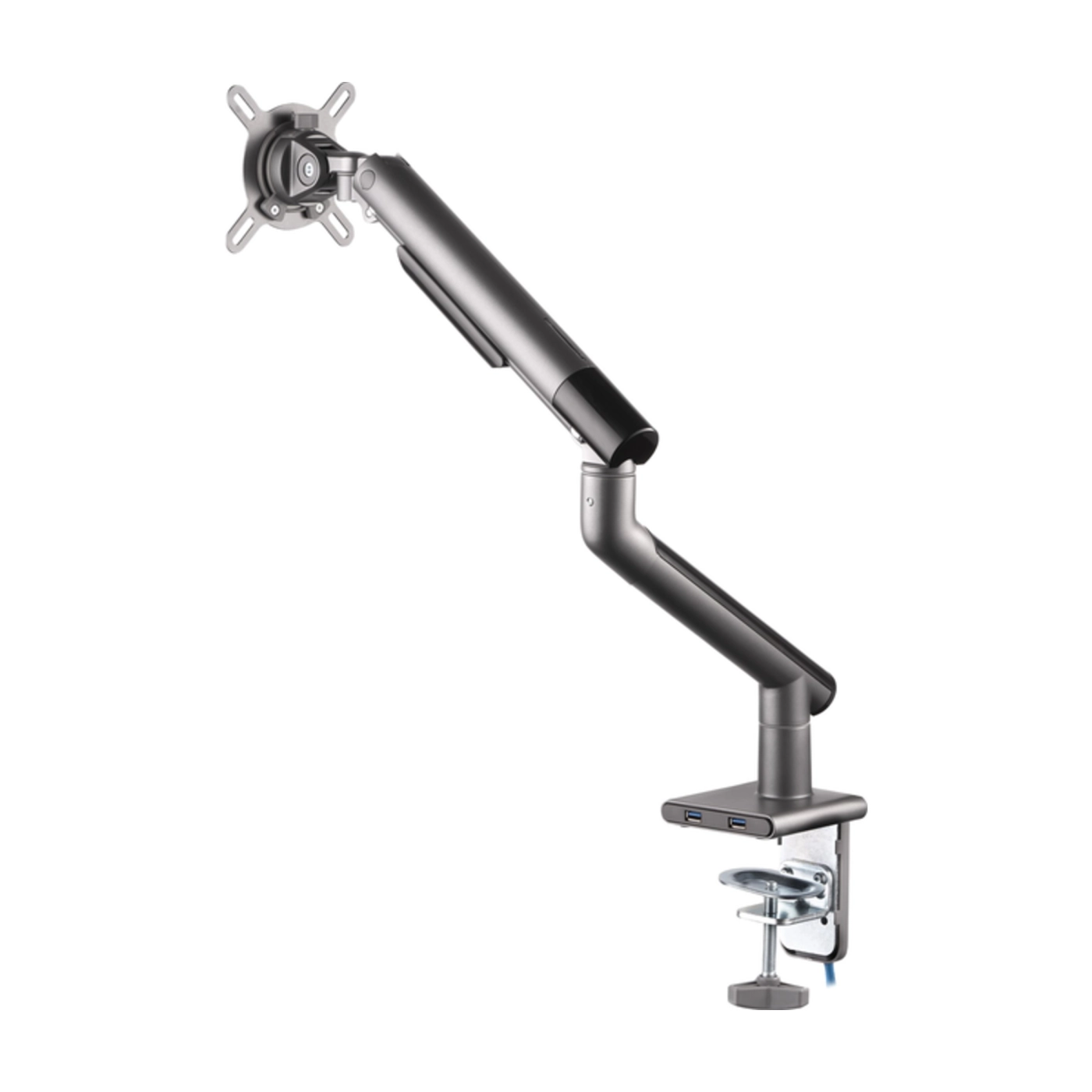 Конструкція кріплення виконана з високоякісного металу, що забезпечує надійність і довговічність. Матеріали стійки та кріплення гарантують безпеку монітора та відсутність вібрацій, навіть при інтенсивному використанні. Кріплення фіксується на столі за допомогою міцного зажиму або через отвір для кріплення, що дозволяє вибрати оптимальний спосіб монтажу залежно від ваших уподобань і умов робочого місця.
