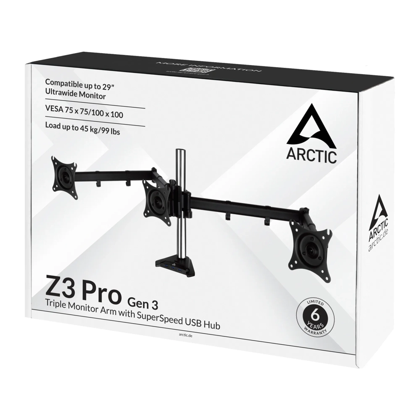 Перевірена якість та довговічність Arctic Z3 Pro (Gen 3) забезпечуються строгими довгостроковими випробуваннями в різних умовах, що дозволяє надавати 6-річну гарантію на цей продукт. Цей кронштейн стане незамінним помічником для будь-кого, хто прагне зручності та організації свого робочого місця.