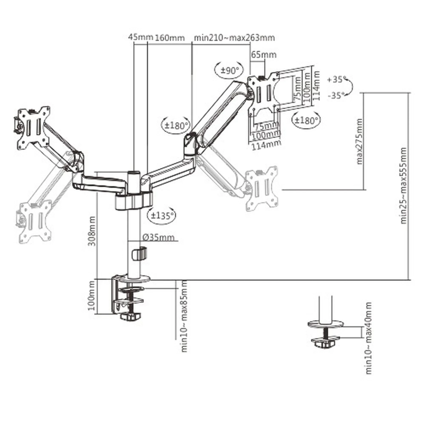 Для встановлення моніторів передбачені знімні VESA-пластини, сумісні з найпоширенішими стандартами 100 x 100 мм та 75 x 75 мм, що робить процес встановлення швидким та зручним. Цей кронштейн не тільки покращує робочі умови, але й сприяє підвищенню продуктивності, зменшуючи фізичне навантаження та покращуючи загальне самопочуття користувача.