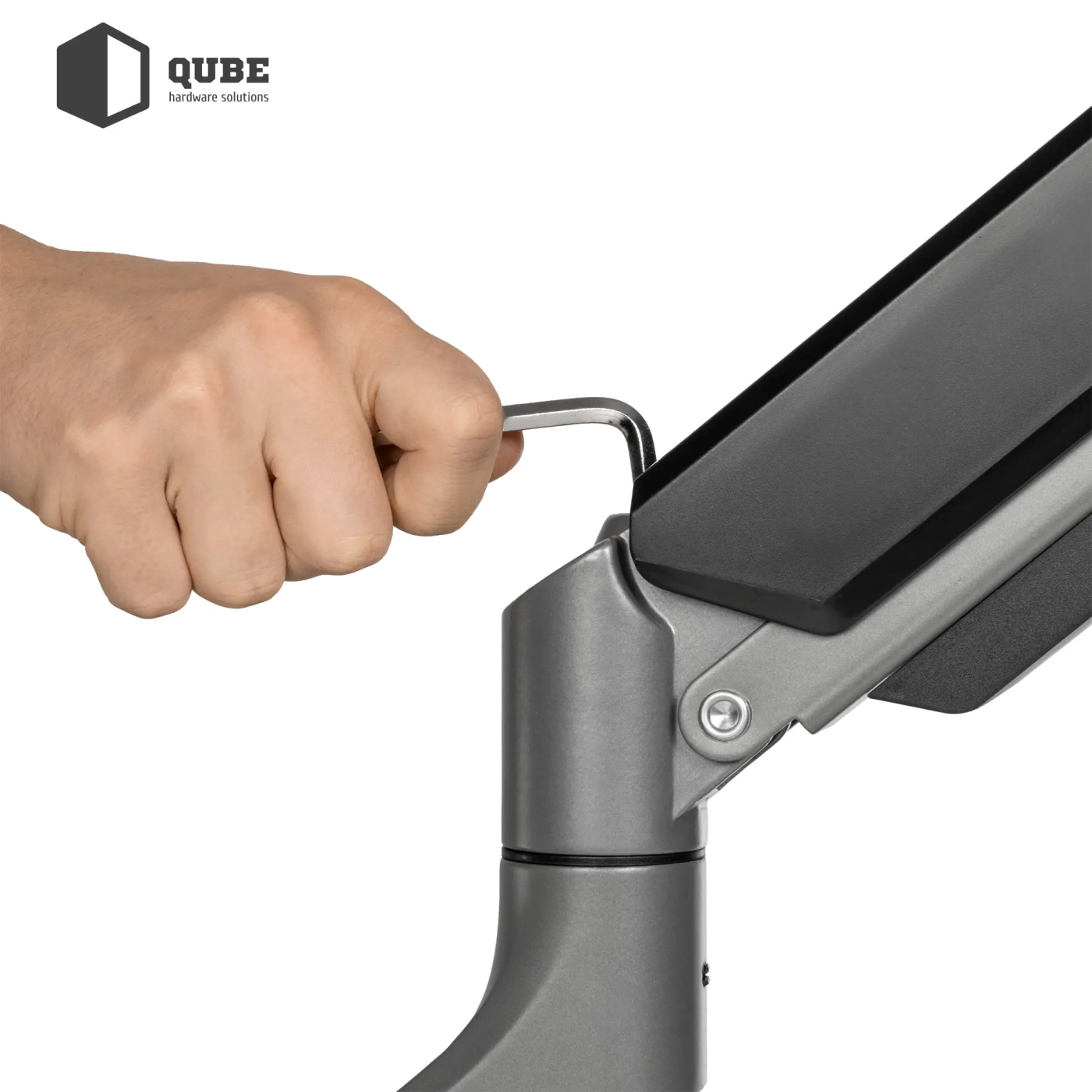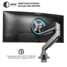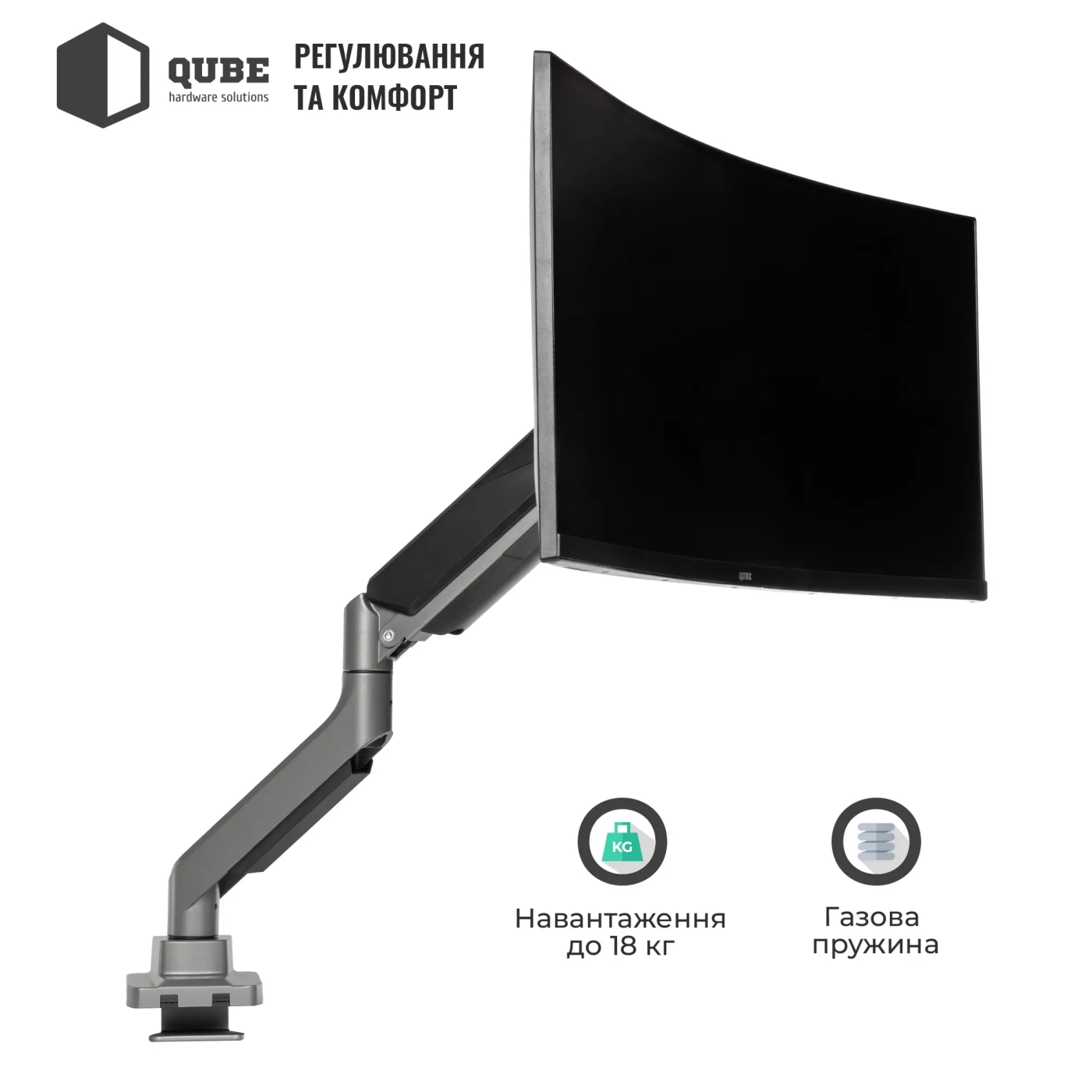 Унікальна конструкція з газовою пружиною дозволяє легко регулювати положення монітора, зберігаючи його стійкість навіть при максимальному навантаженні в 18 кг. Це кріплення підтримує як плоскі, так і вигнуті монітори, що робить його універсальним рішенням для будь-яких завдань. Qube 4918S витримує монітори вагою від 1 до 18 кг, що ідеально підходить для потужних моделей з великими екранами.