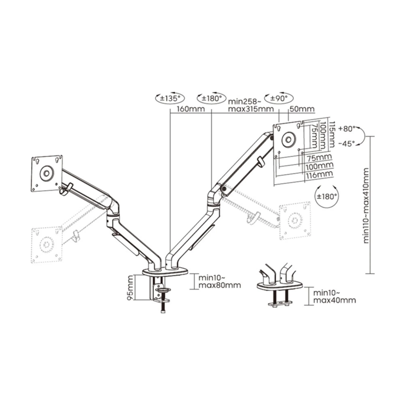 OfficePro MA422S розраховане на монітори з діагоналлю від 17 до 32 дюймів, що робить його універсальним вибором для більшості сучасних дисплеїв. З максимальною навантаженням до 8 кг, кріплення відмінно справляється з більшістю популярних моделей моніторів. Спеціальна система управління кабелями допомагає організувати простір, приховуючи проводи та покращуючи зовнішній вигляд вашого робочого місця.