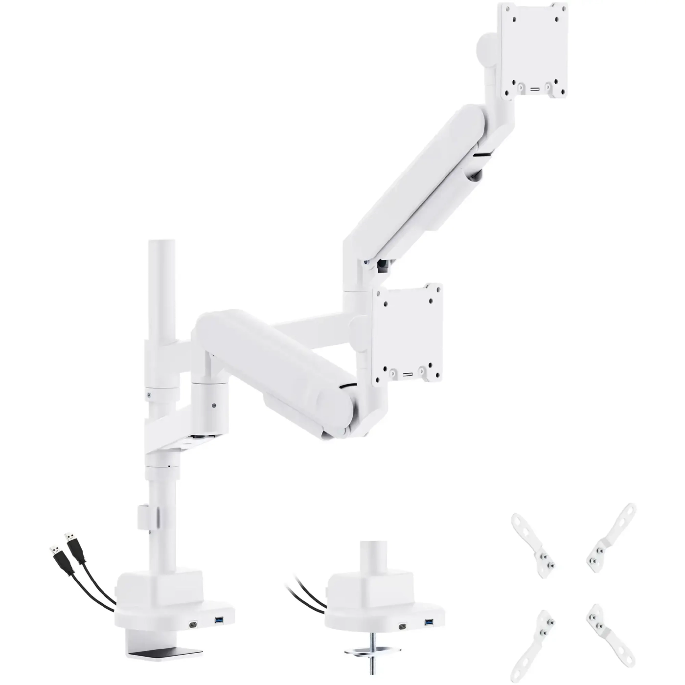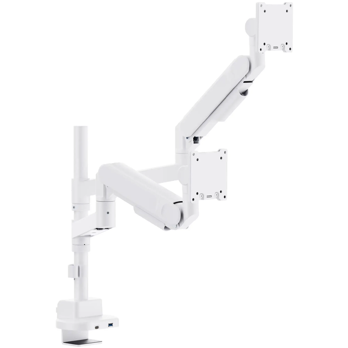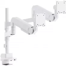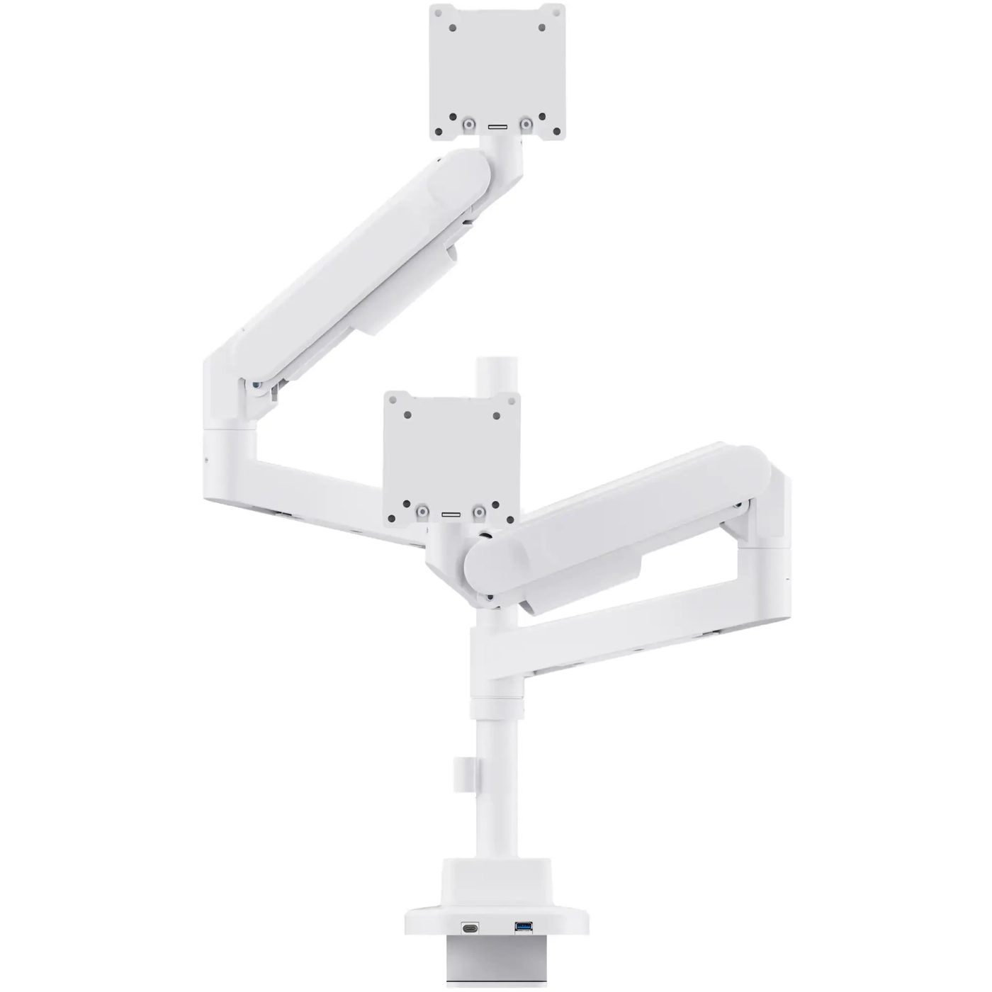 Ця модель оснащена вбудованим USB-концентратором з портами USB-C і USB-A, що дозволяє швидко підключати периферійні пристрої без необхідності тягнути кабелі до системного блоку. Система прихованого укладання кабелів підтримує охайний вигляд робочого місця, а білий колір конструкції надає сучасний та елегантний акцент інтер'єру офісу чи дому. Кріплення підходить як для плоских, так і для вигнутих екранiв, що робить його універсальним рішенням для будь-яких завдань.
