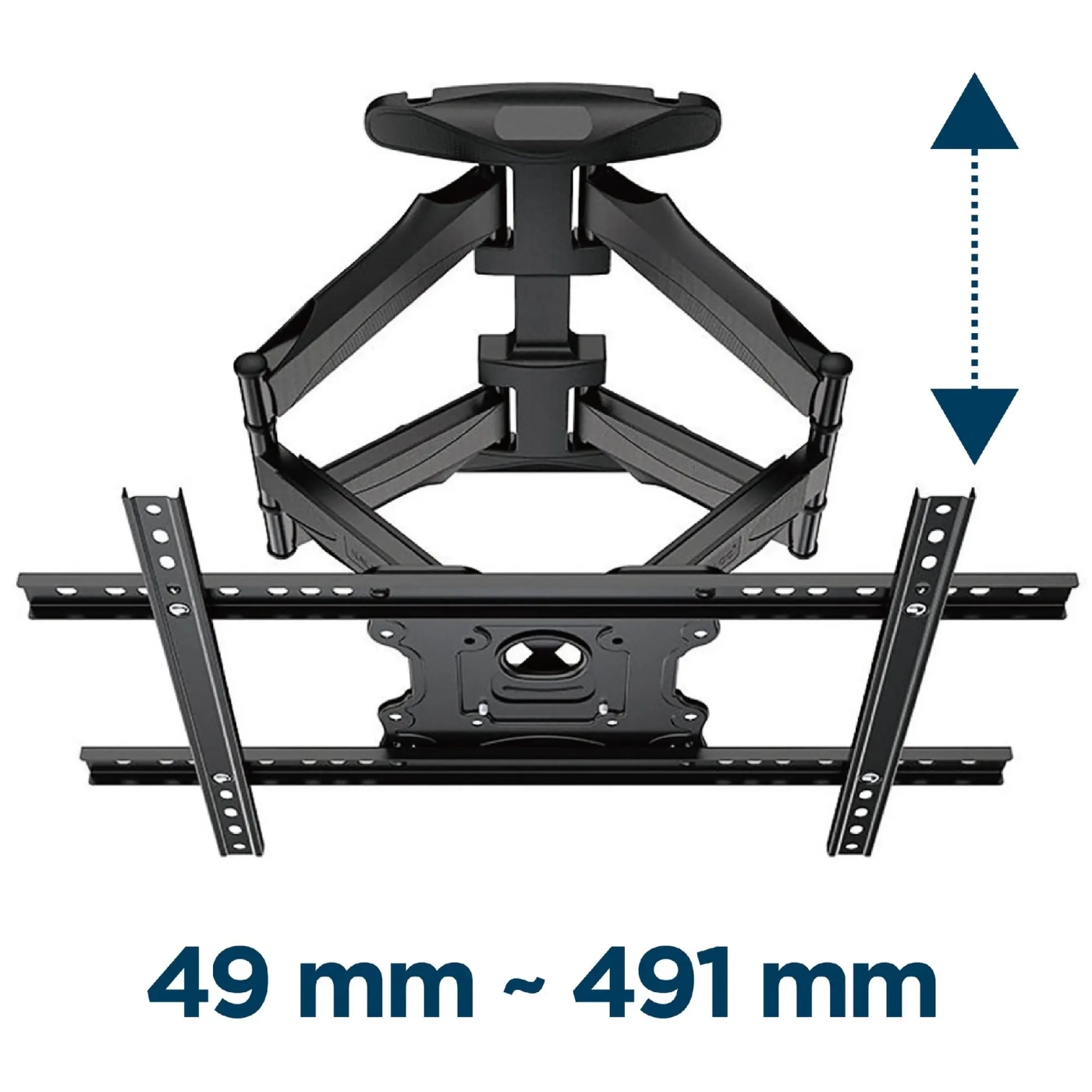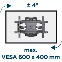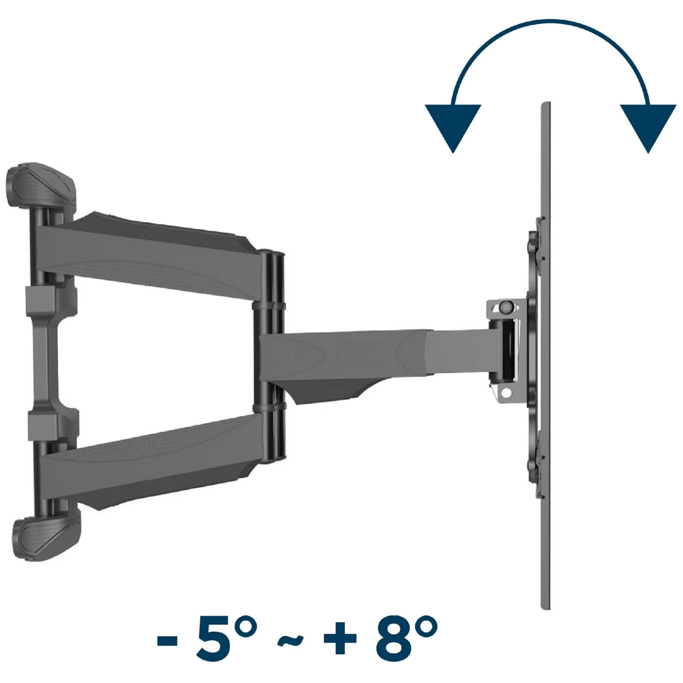 Підтримує VESA стандарти до 600×400 мм, тому сумісне з більшістю сучасних моделей. Забезпечує повний діапазон налаштувань: нахил від −5° до +8°, поворот на 100° та вирівнювання ±4°. Вбудовані тримачі для кабелів сприяють акуратності, а в комплекті є всі необхідні матеріали для монтажу.