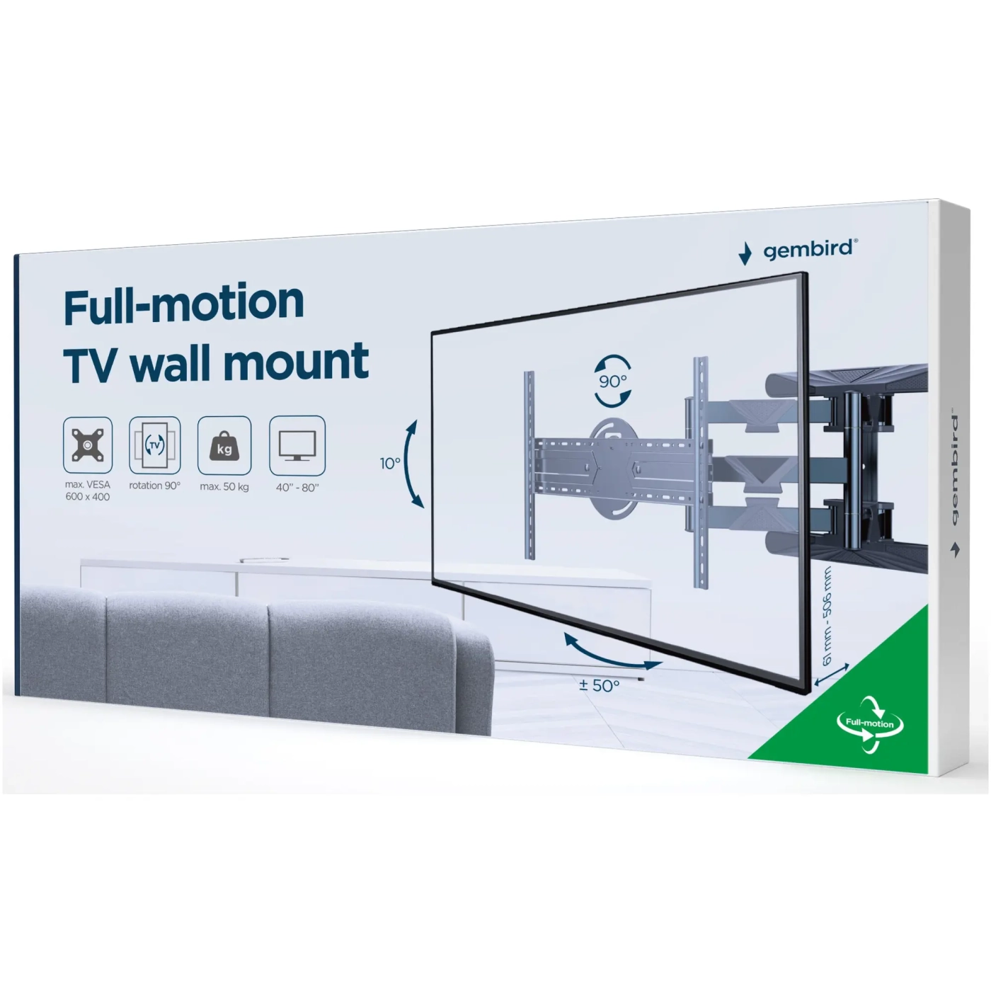 Кріплення для телевізора (кронштейн) Gembird WM-80ST-01 — відмінне рішення, якщо потрібно надійно закріпити екран із діагоналлю від 40 до 80 дюймів. Пристрій витримує навантаження до 50 кг, тому підходить навіть для великих панелей ТВ. Корпус зі сталі з порошковим чорним покриттям, стійким до подряпин і корозії. Мінімальна відстань від стіни — лише 48 мм, максимальна — до 493 мм, завдяки регульованому подвійному шарнірному механізму, який дає змогу виставити телевізор у потрібному положенні.