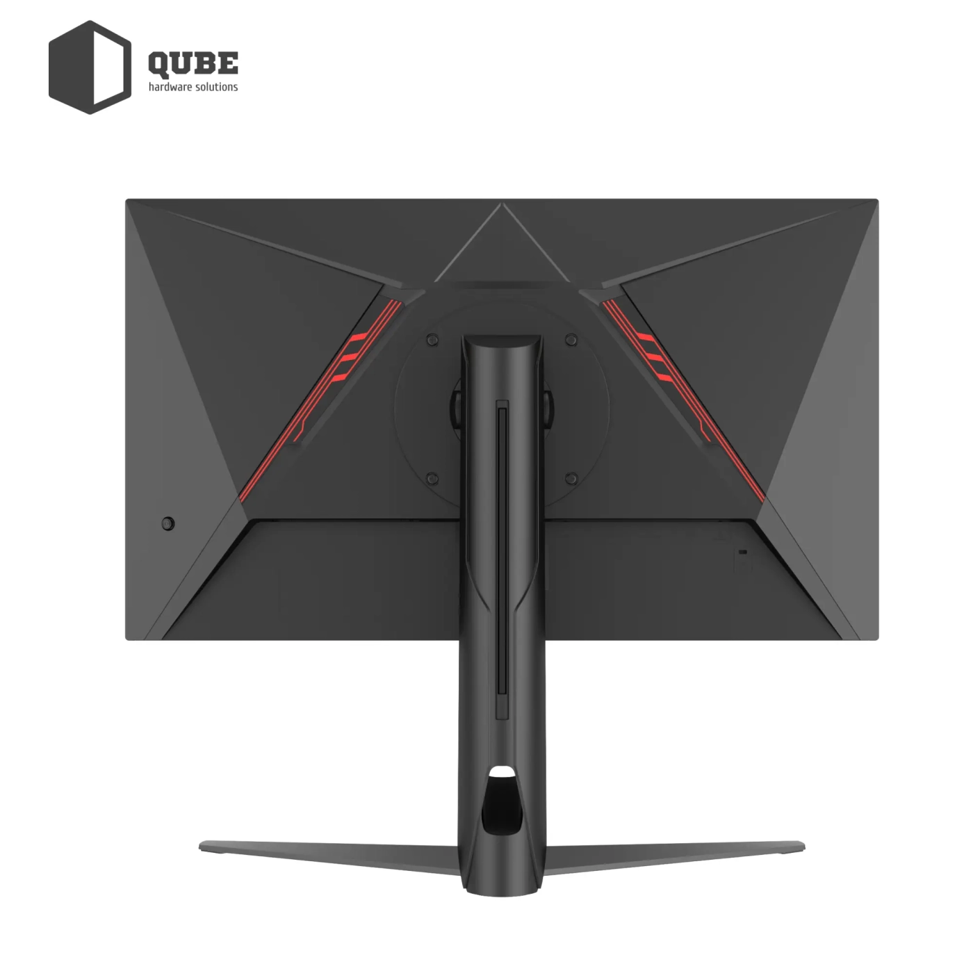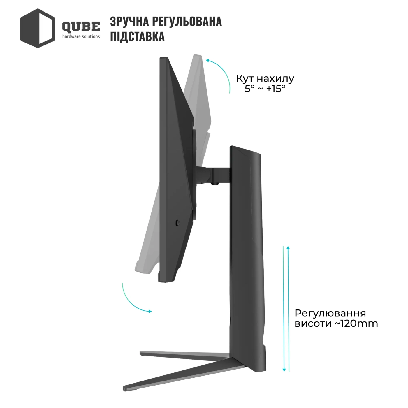 Qube Overlord G25F300H відрізняється зручною ергономікою – екран можна нахиляти від –5° до +15°, а також регулювати по висоті до 120 мм. Це допомагає налаштувати комфортне положення під будь-які умови. Вбудовані динаміки додають практичності, дозволяючи обійтися без зовнішньої акустики в повсякденних завданнях. Стриманий чорний корпус підкреслює універсальність і охайність дизайну, вписуючись як у домашній сетап, так і в професійну ігрову зону.