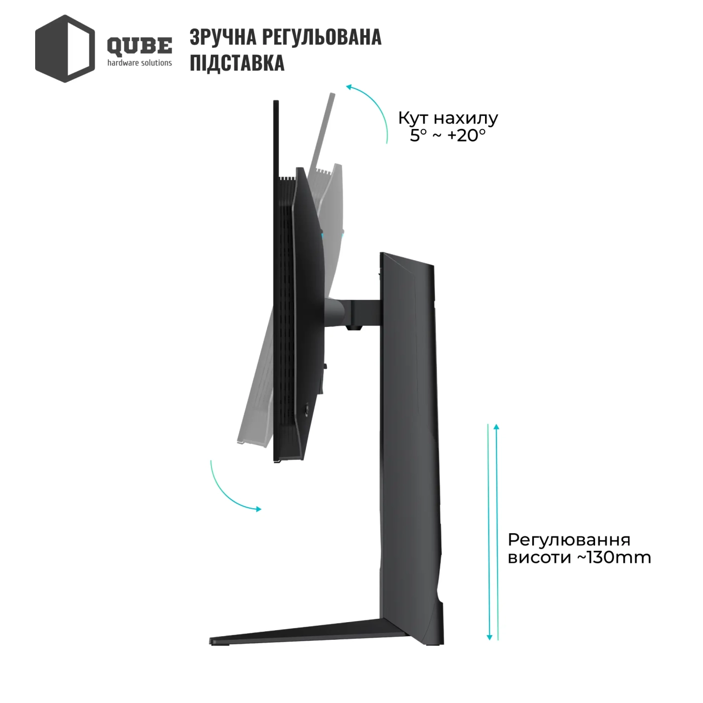 Ергономічна підставка монітора дозволяє регулювати висоту до 130 мм і нахиляти екран у діапазоні від –5° до +20°, що дає можливість налаштувати оптимальне положення для ігор, роботи чи перегляду мультимедіа. Такий рівень гнучкості робить використання пристрою зручним протягом довгих годин. Зовнішній блок живлення допомагає підтримувати низький рівень шуму та акуратність кабельного менеджменту.