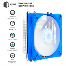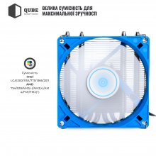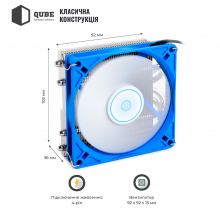 Процессорный кулер QUBE QB-OL400 Blue (92mm/4pin/800-3000RPM/33dBA/4 тепл. трубки) / Кулер / Hydraulic Bearing / Радіатор: 103 x 92 x 36 мм / Вентилятор: 92 x 92 x 15 мм / Retail / 12міс. / QB-OL400
