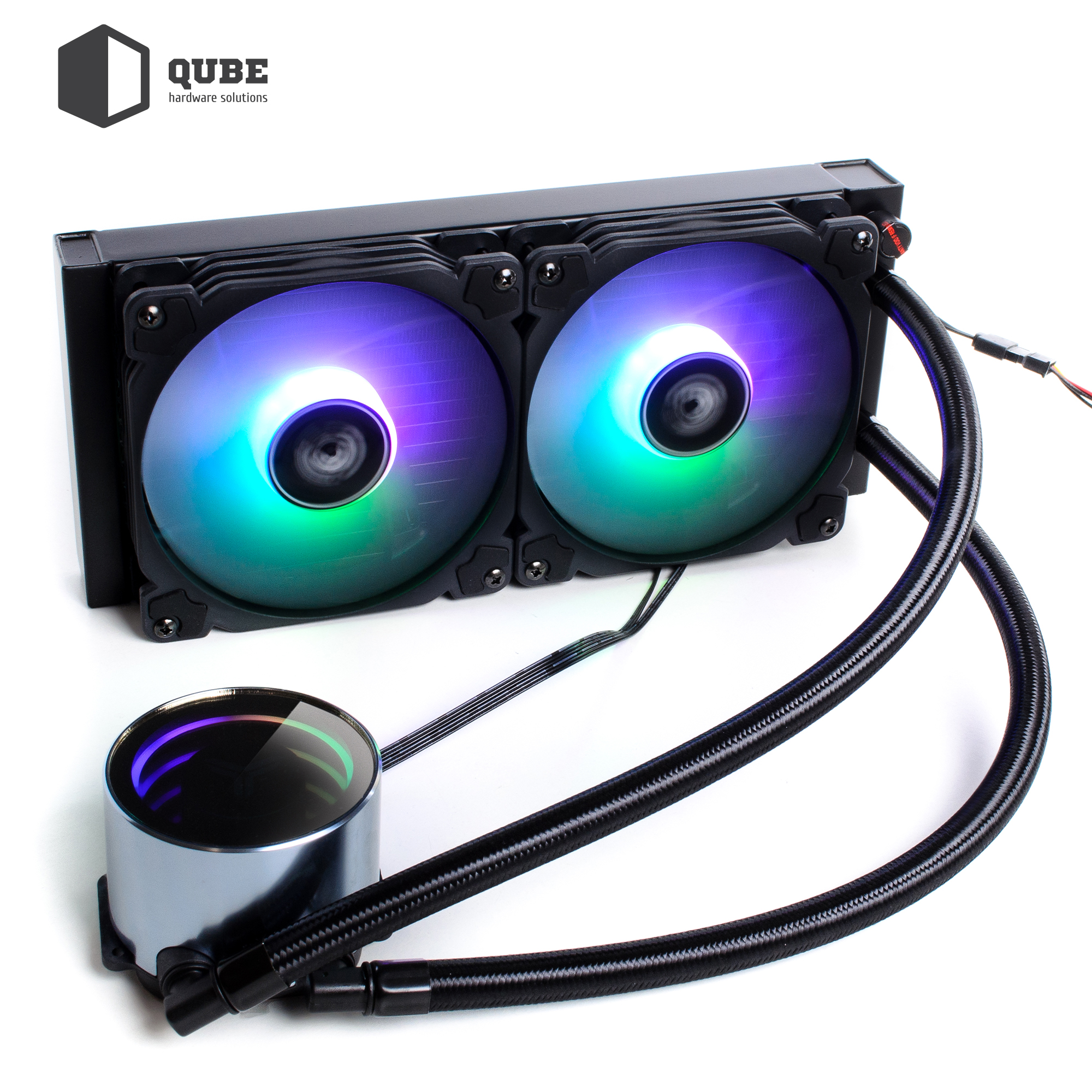 QUBE QB-OLWC240 – це закрита система рідинного охолодження з двосекційним радіатором і двома 12 см вентиляторами з кольоровою адресною RGB-підсвіткою. Вона створена спеціально для комп'ютерних ентузіастів і буде відмінним вибором тих користувачів, яким необхідно більш просунуте, в порівнянні з повітряним кулером, ефективне рішення для охолодження навіть потужного процесора. І щоб при цьому не потрібно було б турбуватися про можливі проблеми сумісності або відсутності необхідних запчастин в комплекті, правильного кількості фітингів чи довжини з'єднувальної трубки.