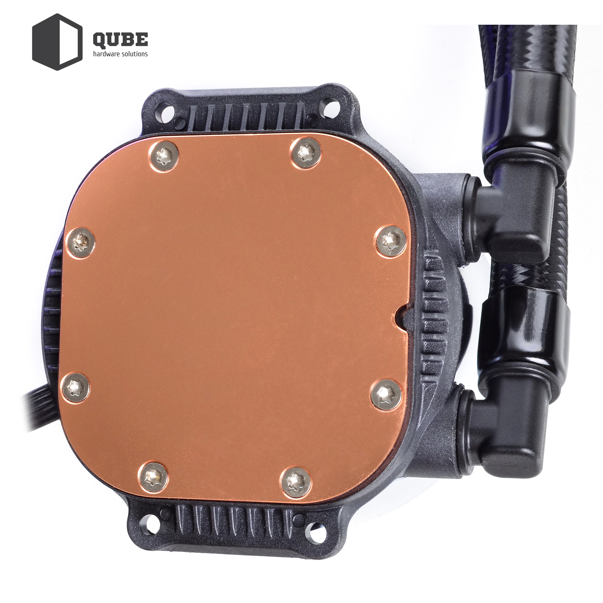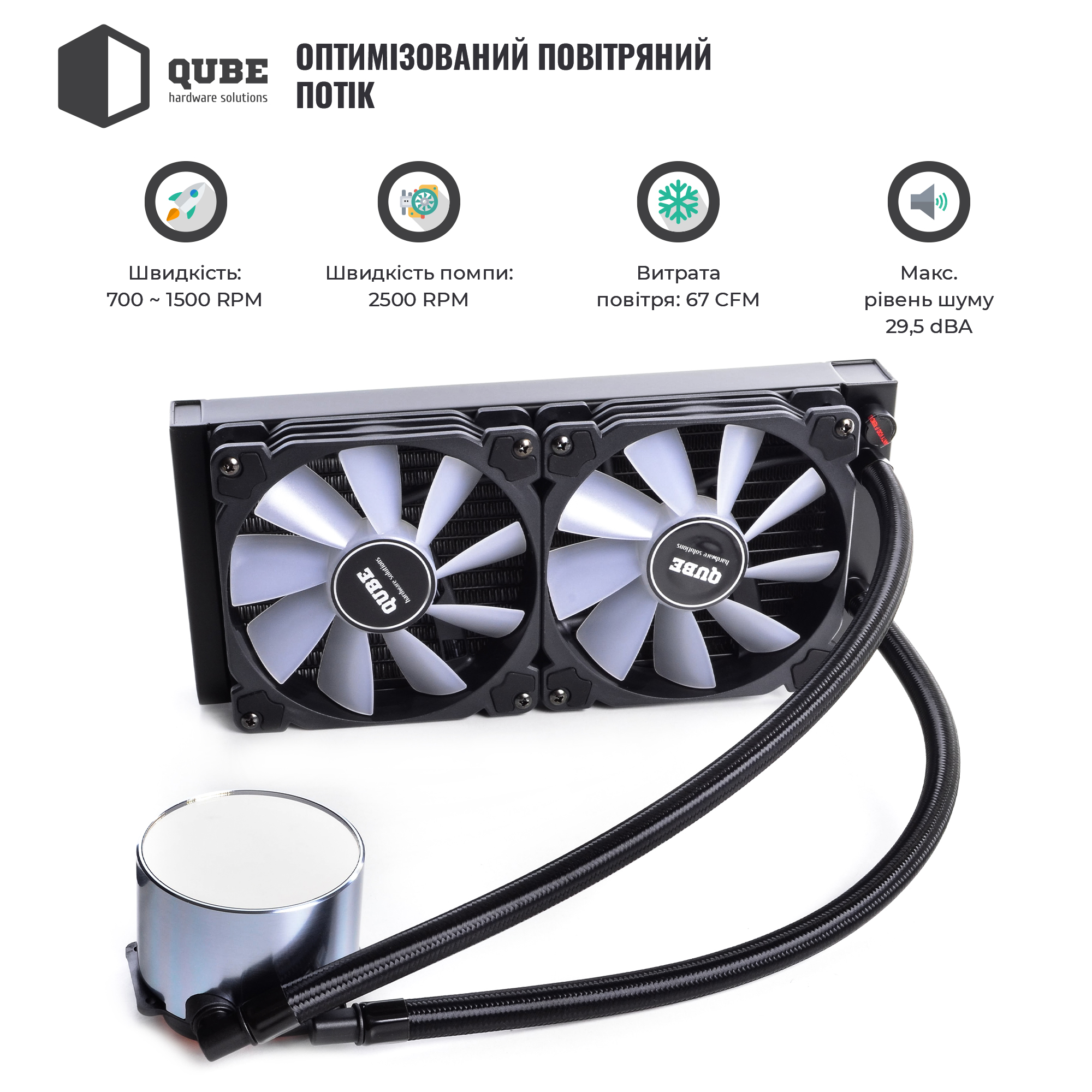 QUBE QB-OLWC240C – це закрита система рідинного охолодження з двосекційним радіатором і двома 12 см вентиляторами з кольоровою RGB-підсвіткою. Продукт створений спеціально для комп'ютерних ентузіастів і буде відмінним вибором тих користувачів, яким необхідно більш просунуте, в порівнянні з повітряним кулером, ефективне рішення для охолодження навіть потужного процесора. І щоб при цьому не потрібно було б турбуватися про можливі проблеми сумісності або відсутності необхідних запчастин в комплекті, правильного кількості фітингів чи довжини з'єднувальної трубки.
