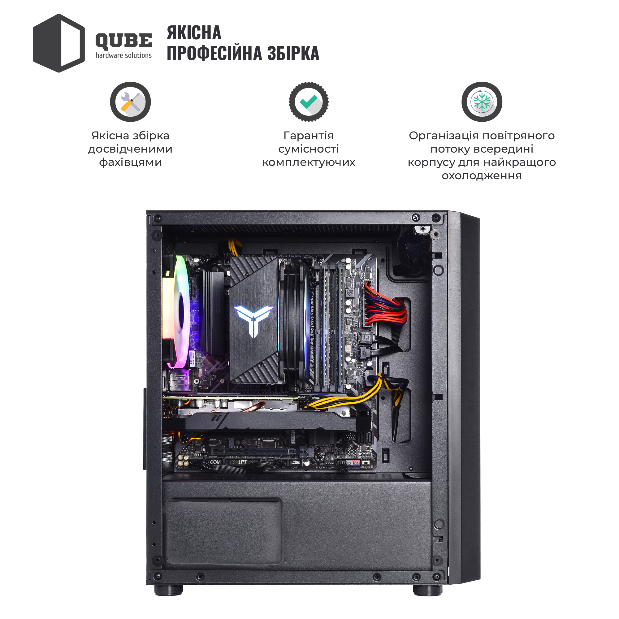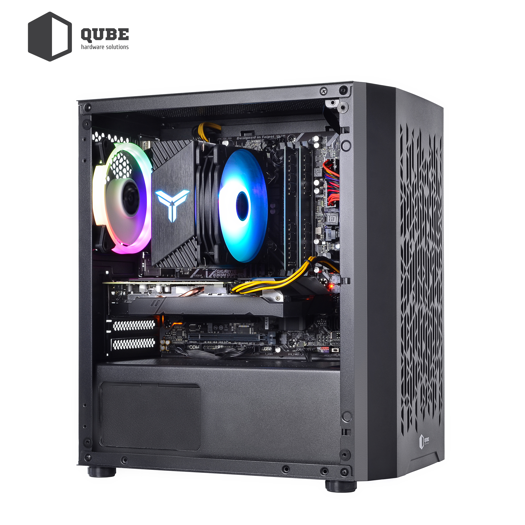 • Ефектний корпус QUBE BLOCK ARGB формату MiniTower з блоком живлення на 600 Вт та трьома барвистими RGB LED вентиляторами, що підтримують оптимальний повітряний потік усередині.