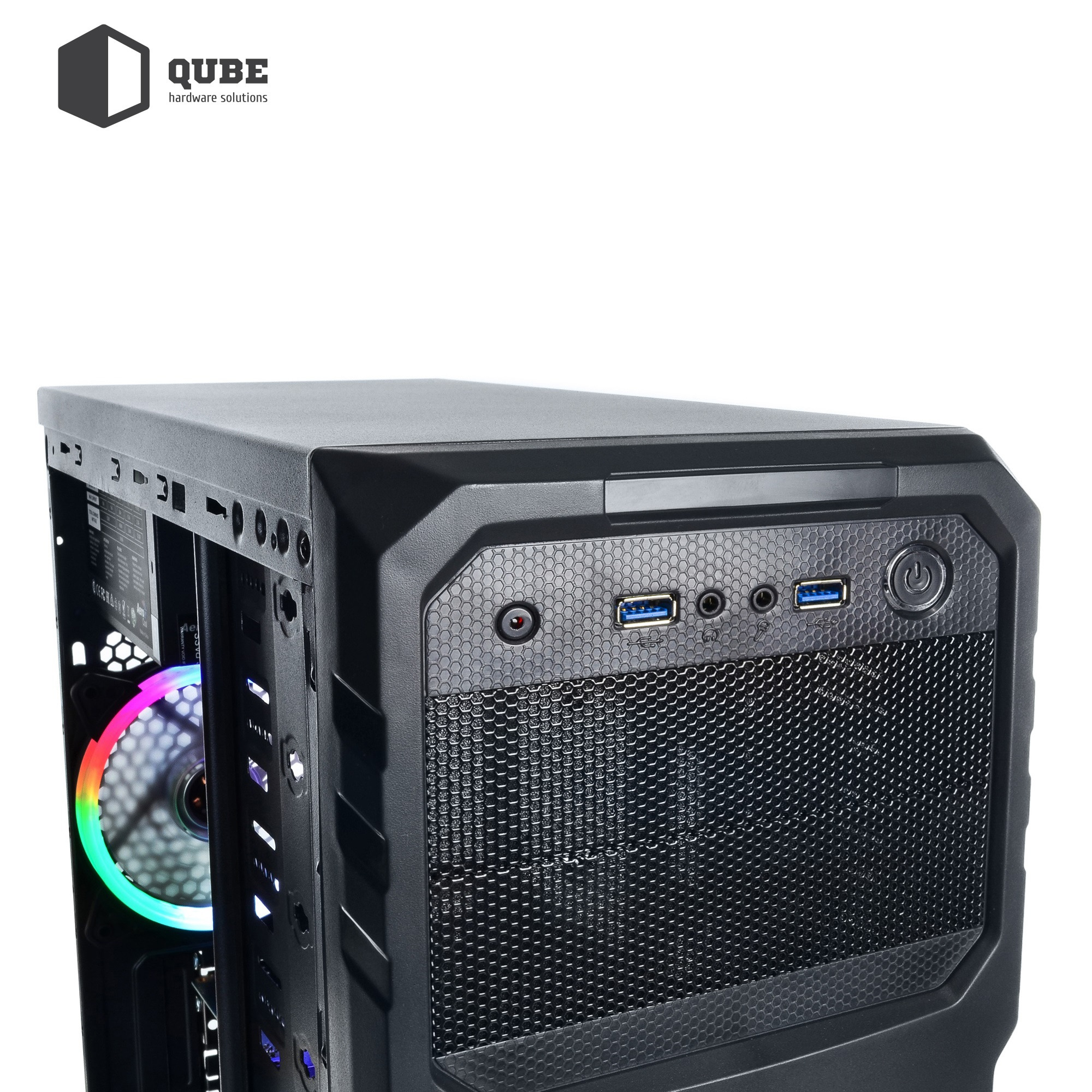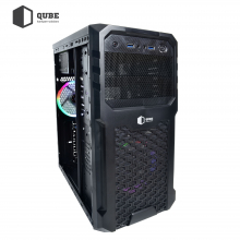 • Корпус QUBE QB27A U3C середнього розміру з блоком живлення на 400 Вт, одним вентилятором з підсвічуванням спереду та одним позаду.
