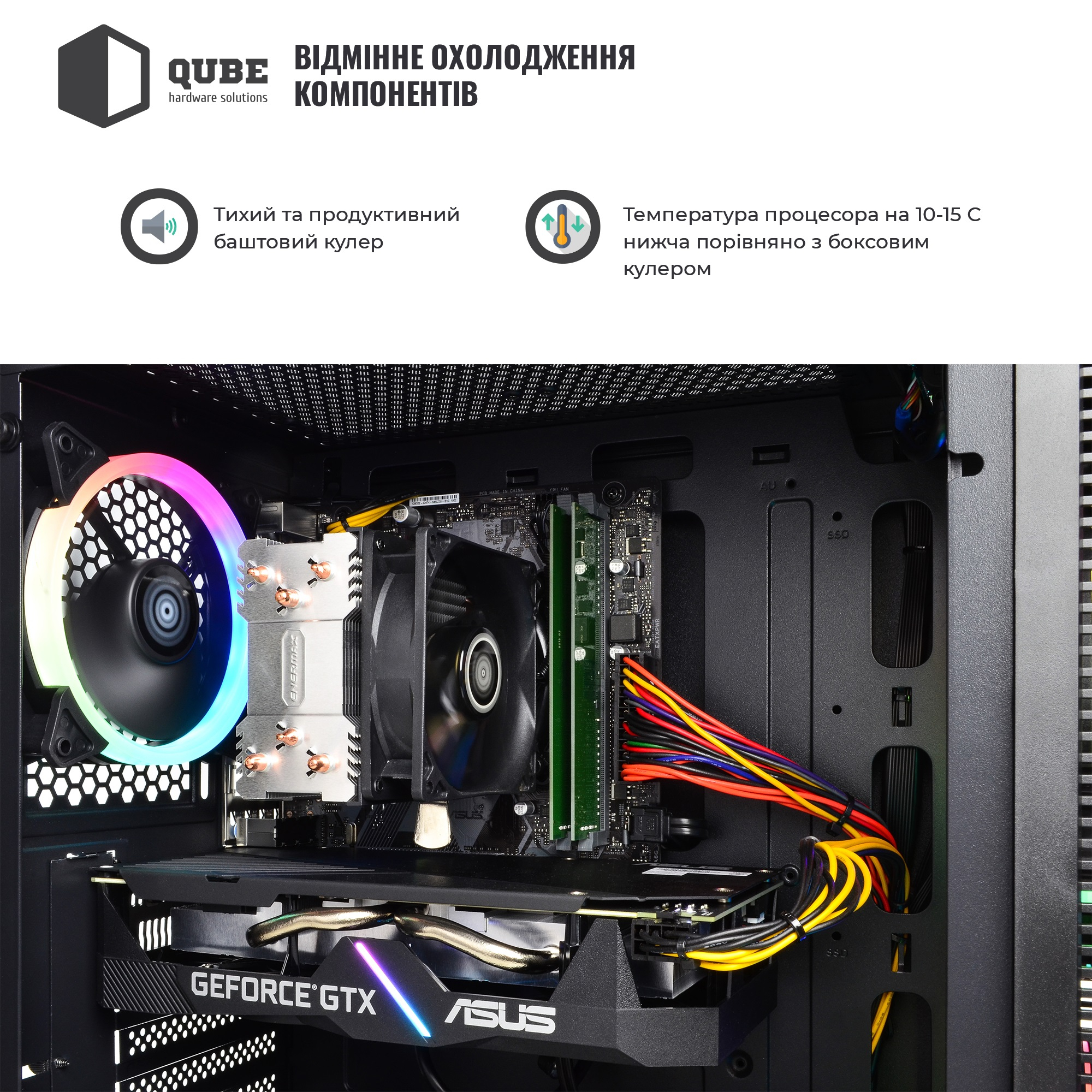 • Сучасний корпус QUBE NEPTUNE типорозміру MiddleTower з блоком живлення на 600 Вт та трьома барвистими RGB LED вентиляторами, що підтримують оптимальний повітряний потік усередині.