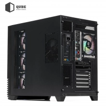 Окремої уваги заслуговує корпус QUBE MIRAGE Black із загартованим склом товщиною 4 мм на передній і боковій панелях. Внутрішній простір організовано таким чином, щоб забезпечити оптимальну циркуляцію повітря: у корпусі встановлено 10 RGB-вентиляторів — 3 знизу, 3 збоку, 1 ззаду і 3 зверху для охолодження радіатора СВО. Така система гарантує ефективний відвід тепла і створює яскравий візуальний образ, що підкреслює ігрову спрямованість пристрою.