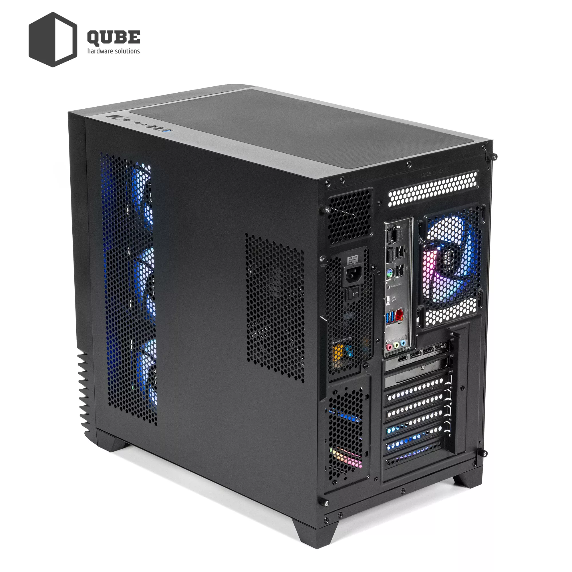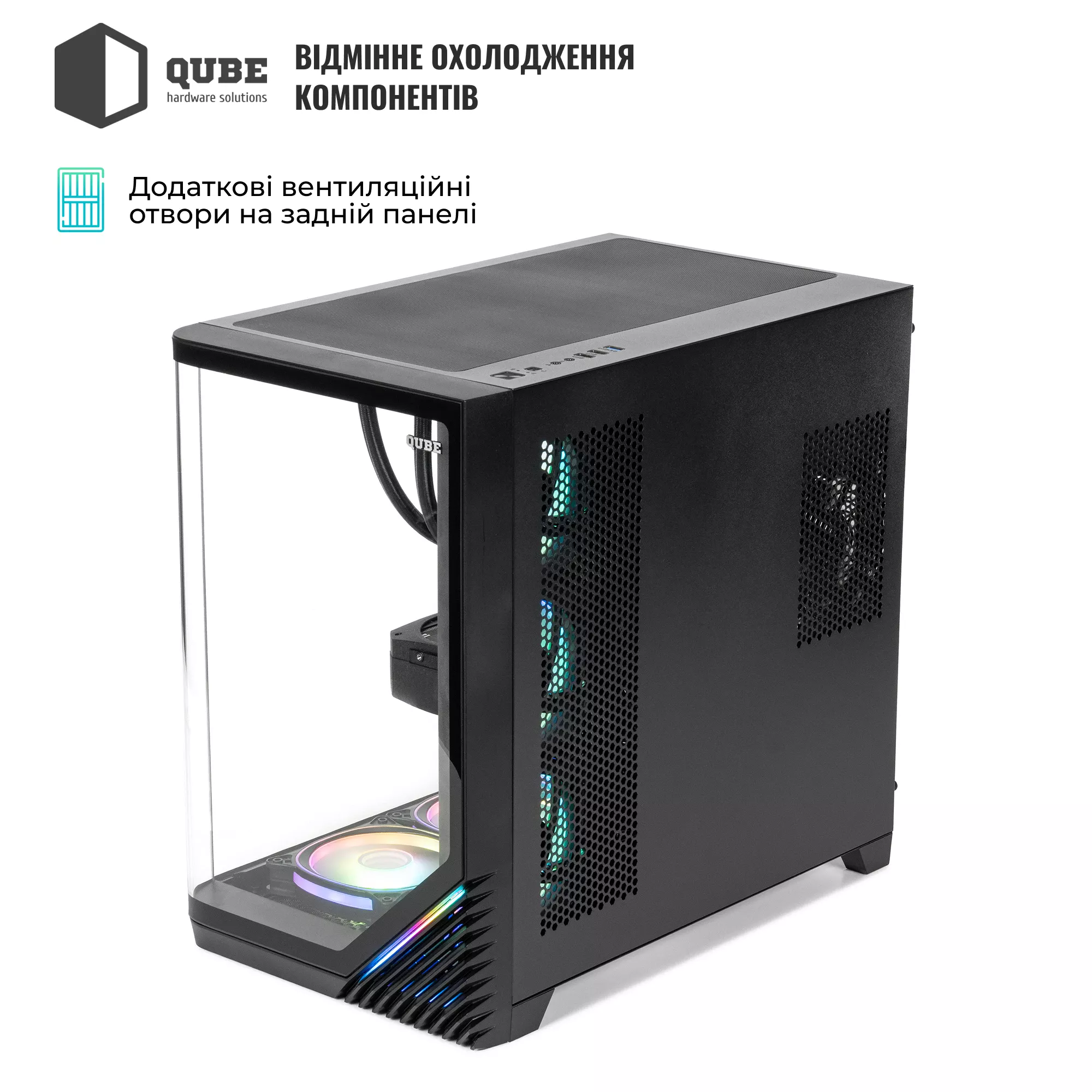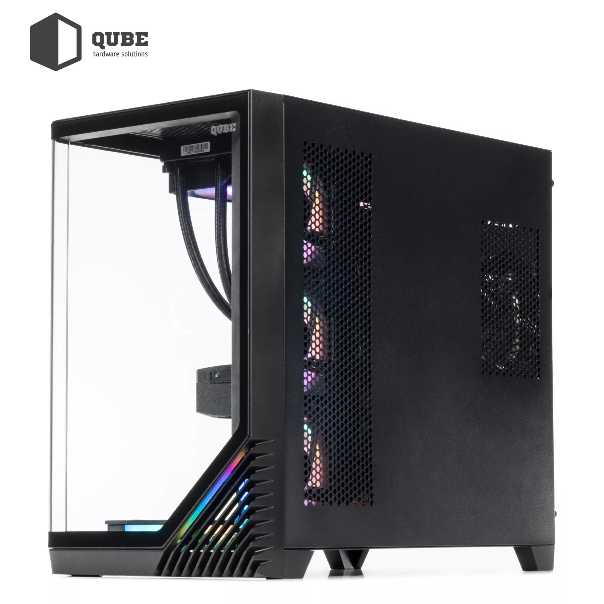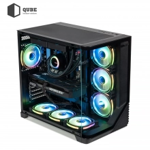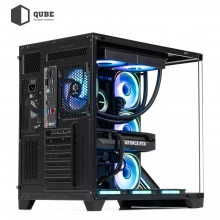 Корпус QUBE MIRAGE Black виконаний в елегантному чорному кольорі і оснащений загартованим склом товщиною 4 мм на передній і бічній панелях. Комплексна система охолодження включає 10 RGB-вентиляторів: 3 знизу, 3 збоку, 1 ззаду і 3 зверху, інтегрованих у контур водяної системи. Таке інженерне рішення одночасно покращує повітряний потік і створює виразний візуальний стиль.