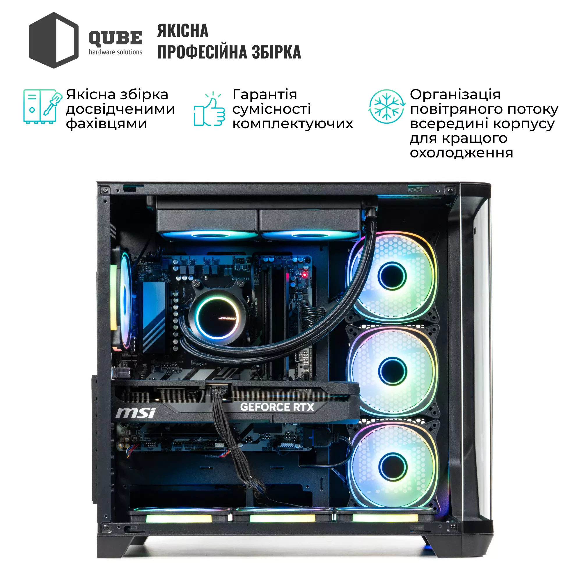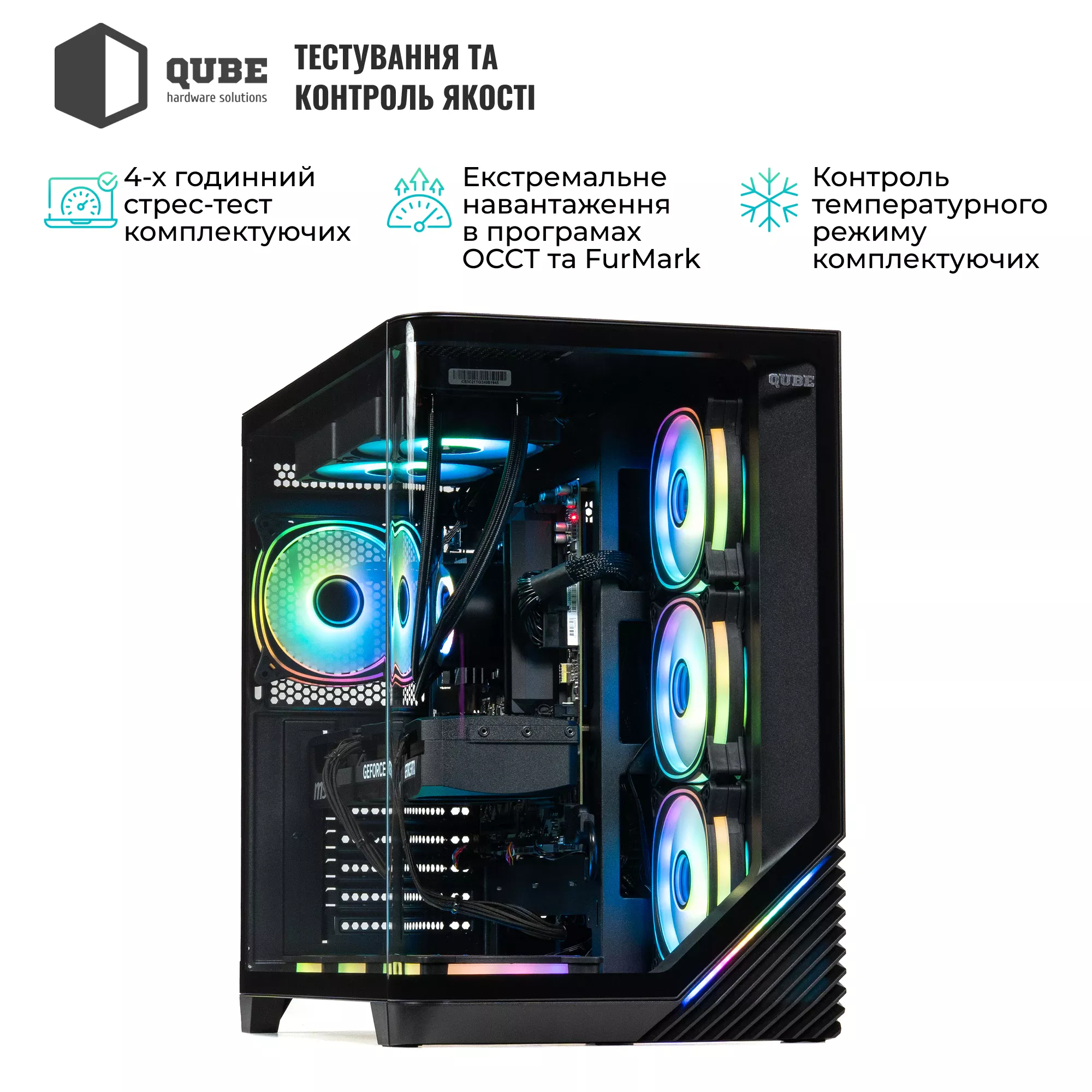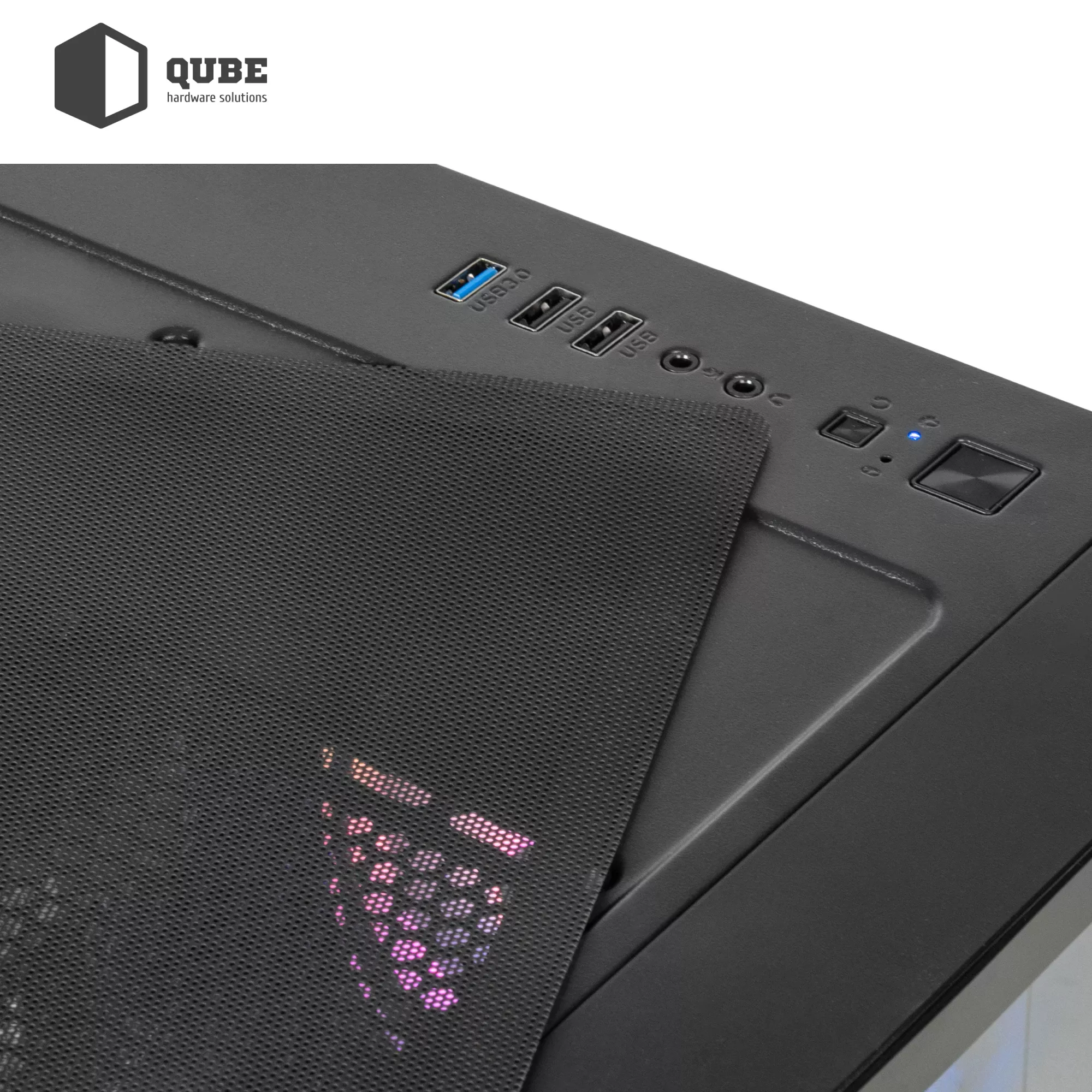 Корпус QUBE MIRAGE Black виконаний в елегантному чорному кольорі і оснащений загартованим склом товщиною 4 мм на передній і бічній панелях. Комплексна система охолодження включає 10 RGB-вентиляторів: 3 знизу, 3 збоку, 1 ззаду і 3 зверху, інтегрованих у контур водяної системи. Таке інженерне рішення одночасно покращує повітряний потік і створює виразний візуальний стиль.
