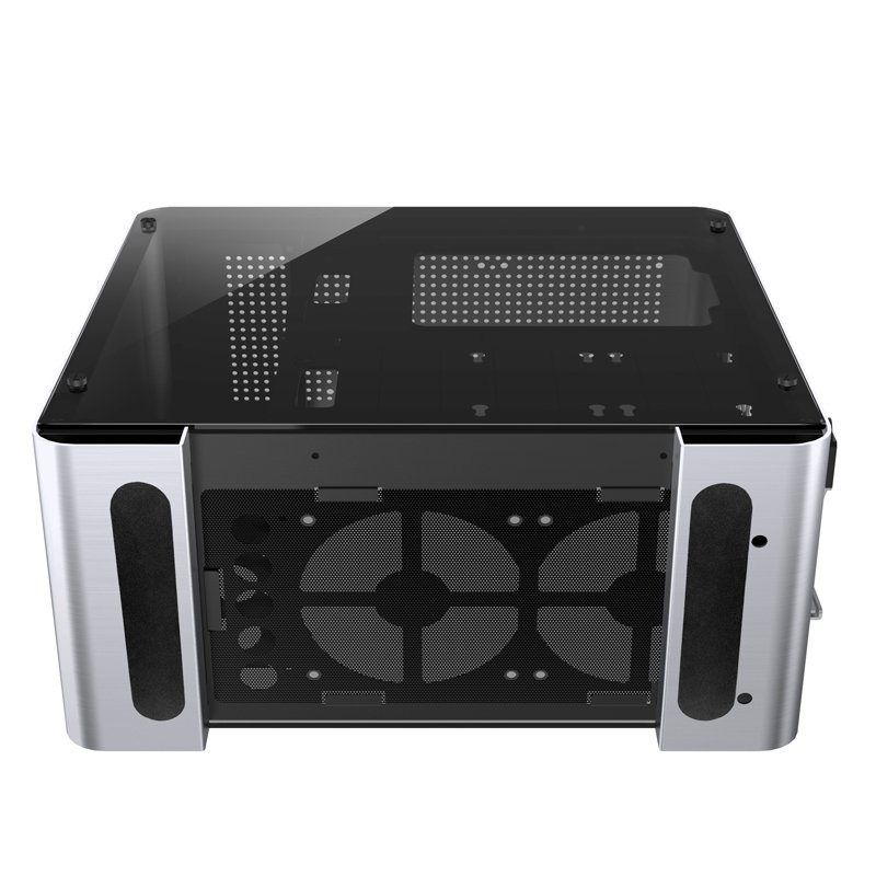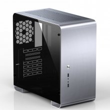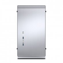 Конструктивно внешняя часть корпуса изготовлена из цельнометаллических серебристых пластин толщиной 1,8 мм из алюминиевого сплава, которые как бы обхватывают внутреннюю раму со всех сторон. Такое строгое, в некоторой мере – минималистичное исполнение, отлично подойдет для пользователей, уважающих выдержанный стиль и элегантность. В нижней трети передней панели производитель вынес несколько портов USB, в том числе и два высокоскоростной USB 3.0, кнопку включения, а также аудио- и микрофонный разъемы. На верхней грани над вентилятором разместился небольшой противопылевой фильтр, препятствующий попаданию мелкодисперсных частиц внутрь компьютера.