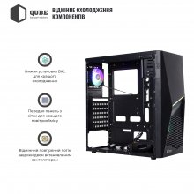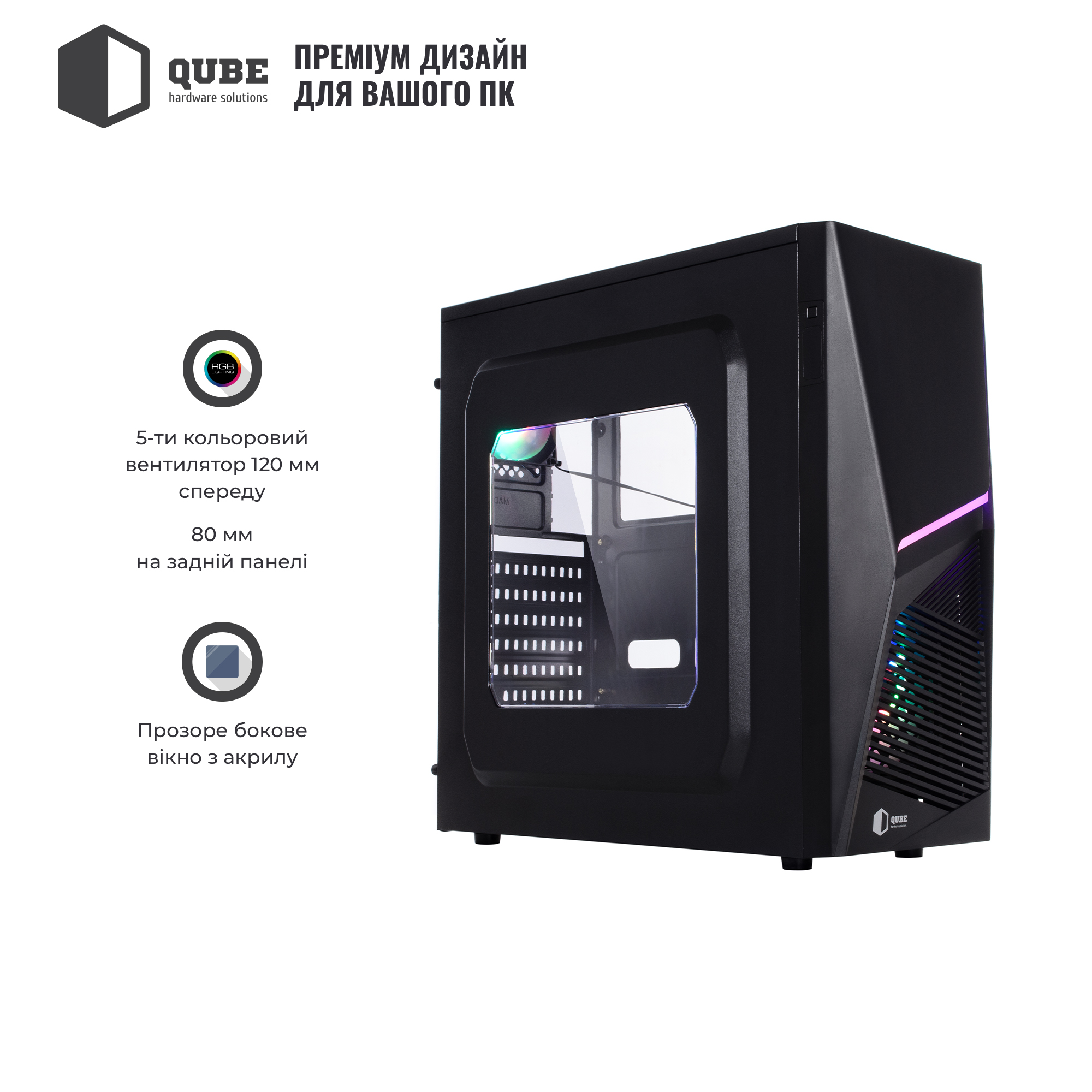 QUBE FLASH – это просторный корпус формата MiddleTower с яркими RGB вентиляторами, который удовлетворит требования подавляющего числа пользователей. Изготовлен корпус из прочного металла толщиной 0,6 мм, острые края которого, аккуратно зашлифованы и подогнуты внутрь для безопасной сборки компьютера. Боковая панель корпуса имеет среднего размера окно, изготовленное из акрила, через которое будет видно «начинку» ПК. Передняя панель наполовину состоит из сетки – не только дизайнерское, но и практичное решение, ведь через нее осуществляется воздухообмен внутри корпуса. Для удобства при сборке компьютера мечты и при его эксплуатации, разработчики корпуса продумали отверстия для укладки кабелей, большое сервисное окно для установки или замены процессорного кулера, отдельный отсек для блока питания.