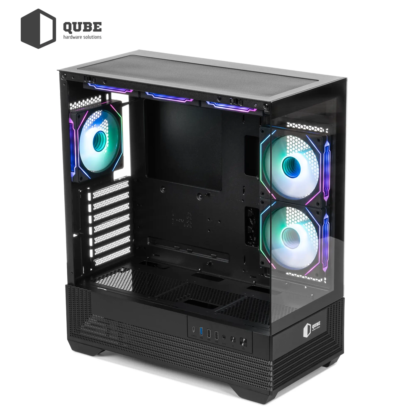 Корпус QUBE FORT ARGB Black (FORT_GBNU3) – это современное и вместительное решение для сборки производительного игрового или рабочего компьютера. Его строгий дизайн с панелью из закалённого стекла подчёркивает эстетику комплектующих и позволяет создать эффектную систему с продуманной подсветкой. В комплект входят шесть 120-мм ARGB/PWM вентиляторов с эффектом «бесконечного зеркала», которые не только обеспечивают мощное охлаждение, но и придают корпусу уникальный визуальный стиль. Контроллер и пульт дистанционного управления позволяют гибко регулировать цвета и эффекты подсветки.