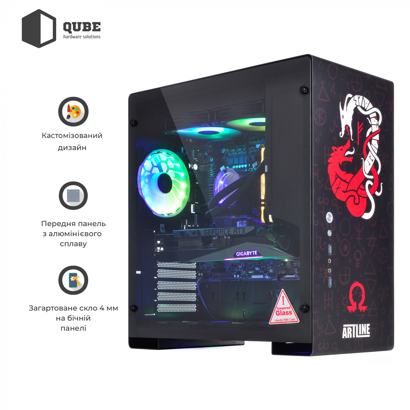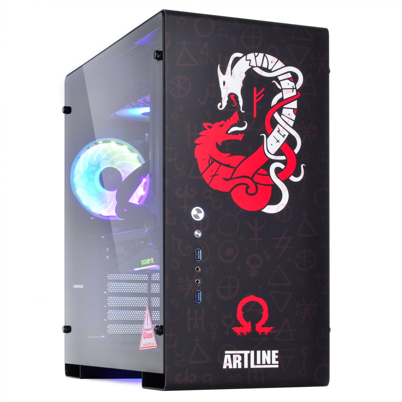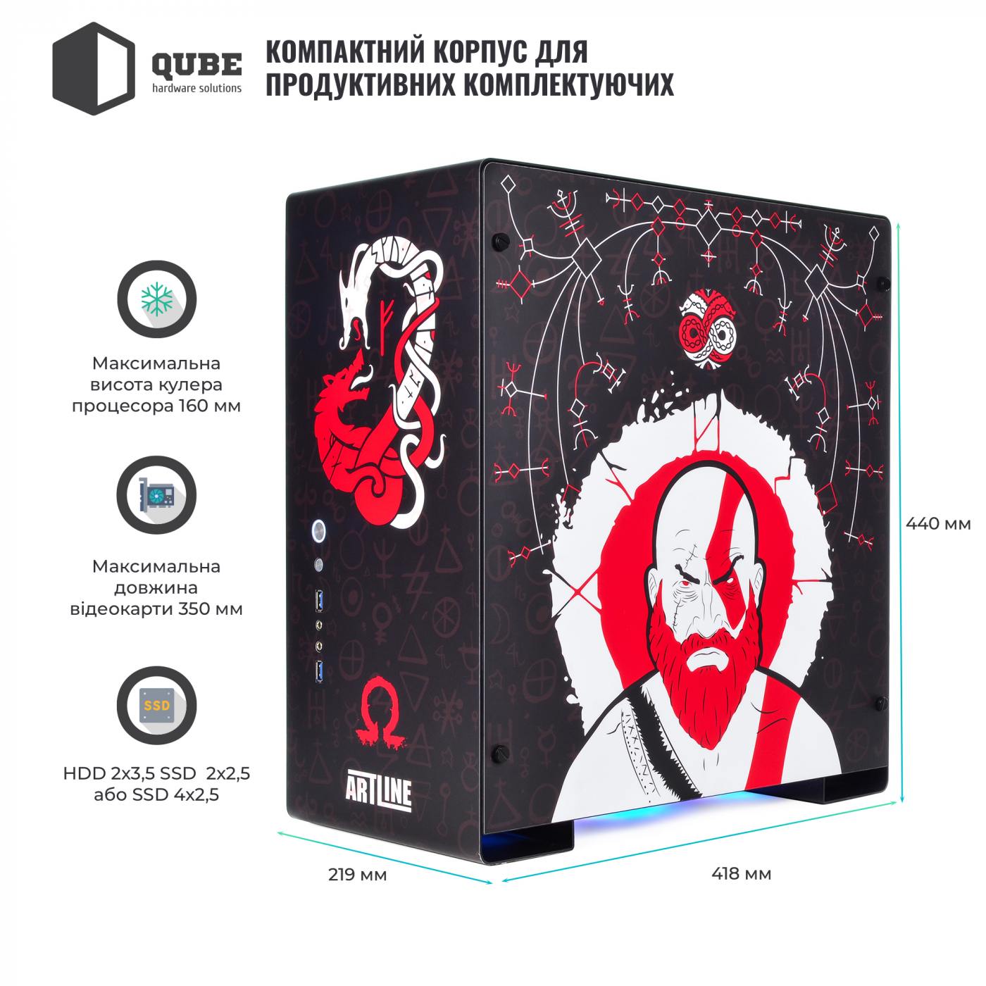 Корпус QUBE GRIFFIN Aluminum Black God Of War Black Printed отличается дизайном в стиле игры God of War. На боковой стенке фанат игры легко распознает арт с главным героем Кратосом – спартанским воином, полубогом и сыном Зевса. На фоне – руническая символика, отлично дополняющая картинку. На передней стенке расположен двухглавый змей, а снизу – символ Омега. Весь дизайн выполен в красном и белом цвете, который ярко выделяется на черном корпусе.