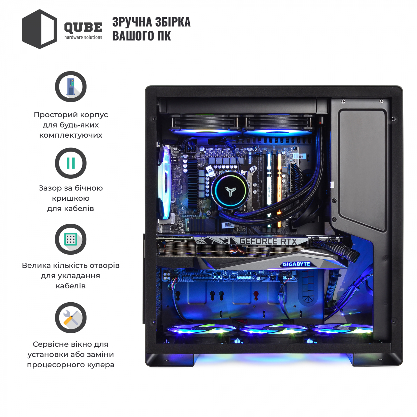 Просторный корпус форм-фактора MiddleTower позволит вместить различные комплектующие: материнскую плату вплоть до ATX, процессорный вентилятор высотой до 160 мм и видеокарту длиной до 350 мм. Также корпус способен вместить до 6 корпусных вентиляторов.