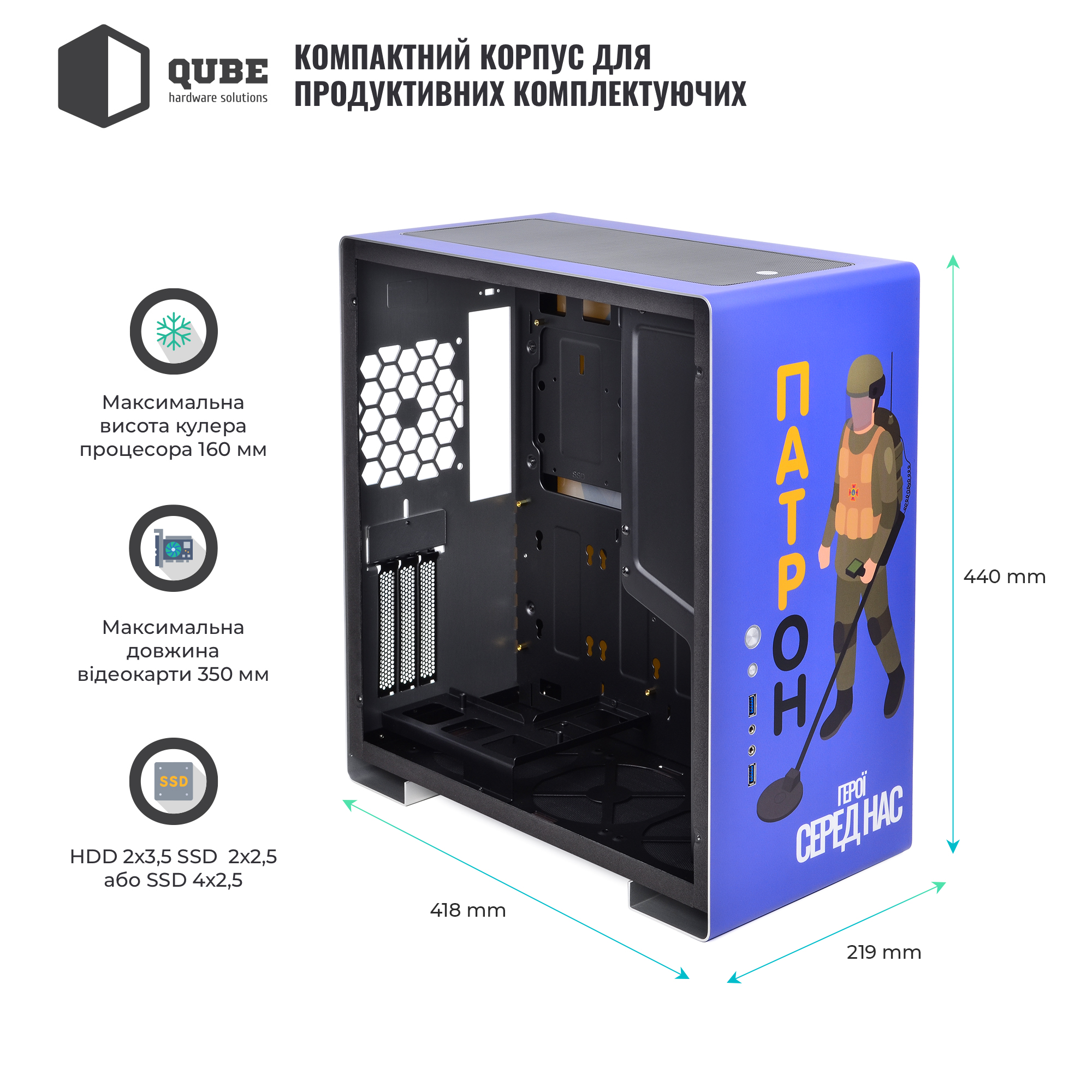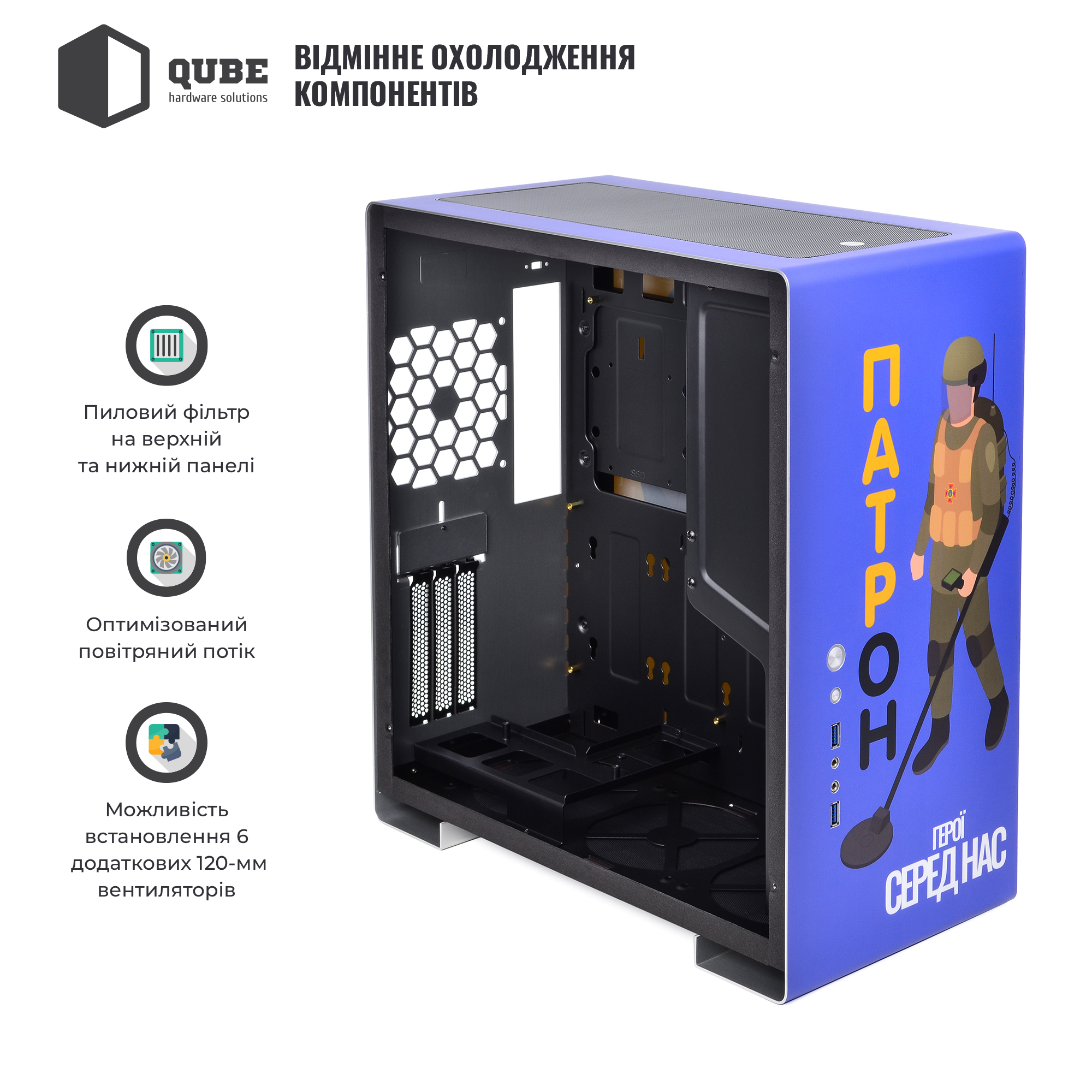 Компания QUBE представляет эксклюзивную линейку патриотичных корпусов! Это современные устройства с ярким качественном дизайном, которые поднимут настроение и расскажут окружающим о ваших взглядах. Продуманная конструкция и отличный функционал дружны к любому пользователю, который решился на самостоятельную сборку всех необходимых комплектующих в готовый персональный компьютер.