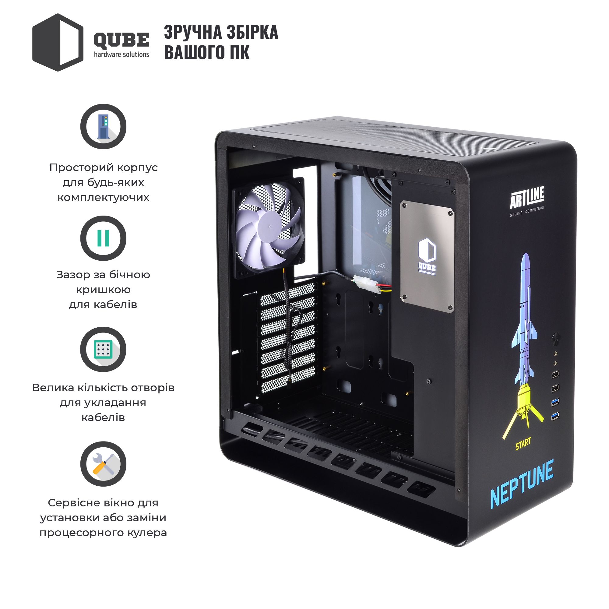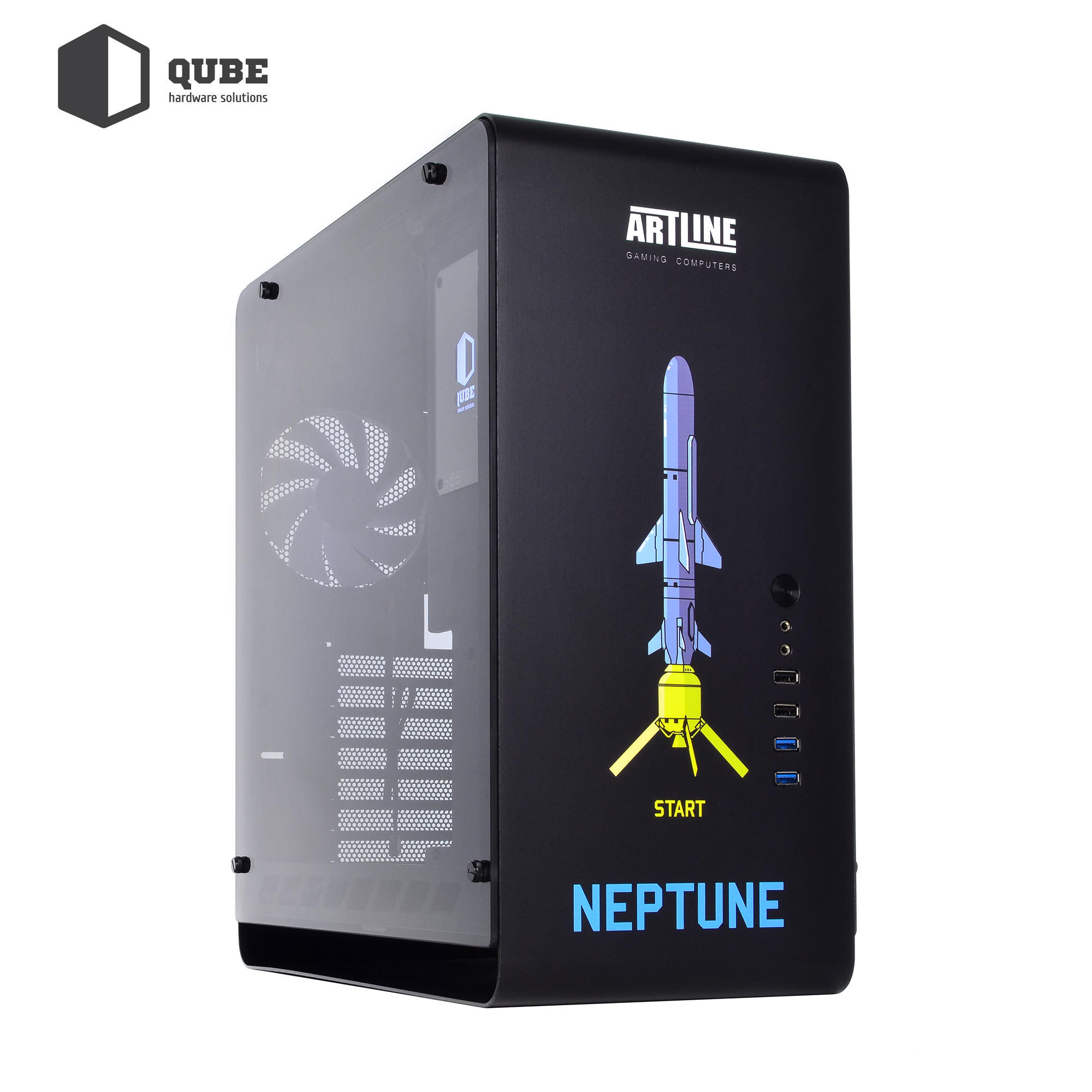 Модель QUBE HAWK Neptune – это просторный корпус формата MiddleTower, который удовлетворит требования подавляющего числа пользователей. Все острые края толстого листового металла толщиной 1 мм аккуратно зашлифованы или подогнуты, тем самым исключается любая возможность пораниться при сборке. Большое сервисное окно для установки или замены процессорного кулера, технологические окна для аккуратной разводки и монтажа кабелей, достаточный зазор за боковой крышкой – все это сделано для вашего удобства. Боковая панель выполнена из тонированного закалённого стекла.